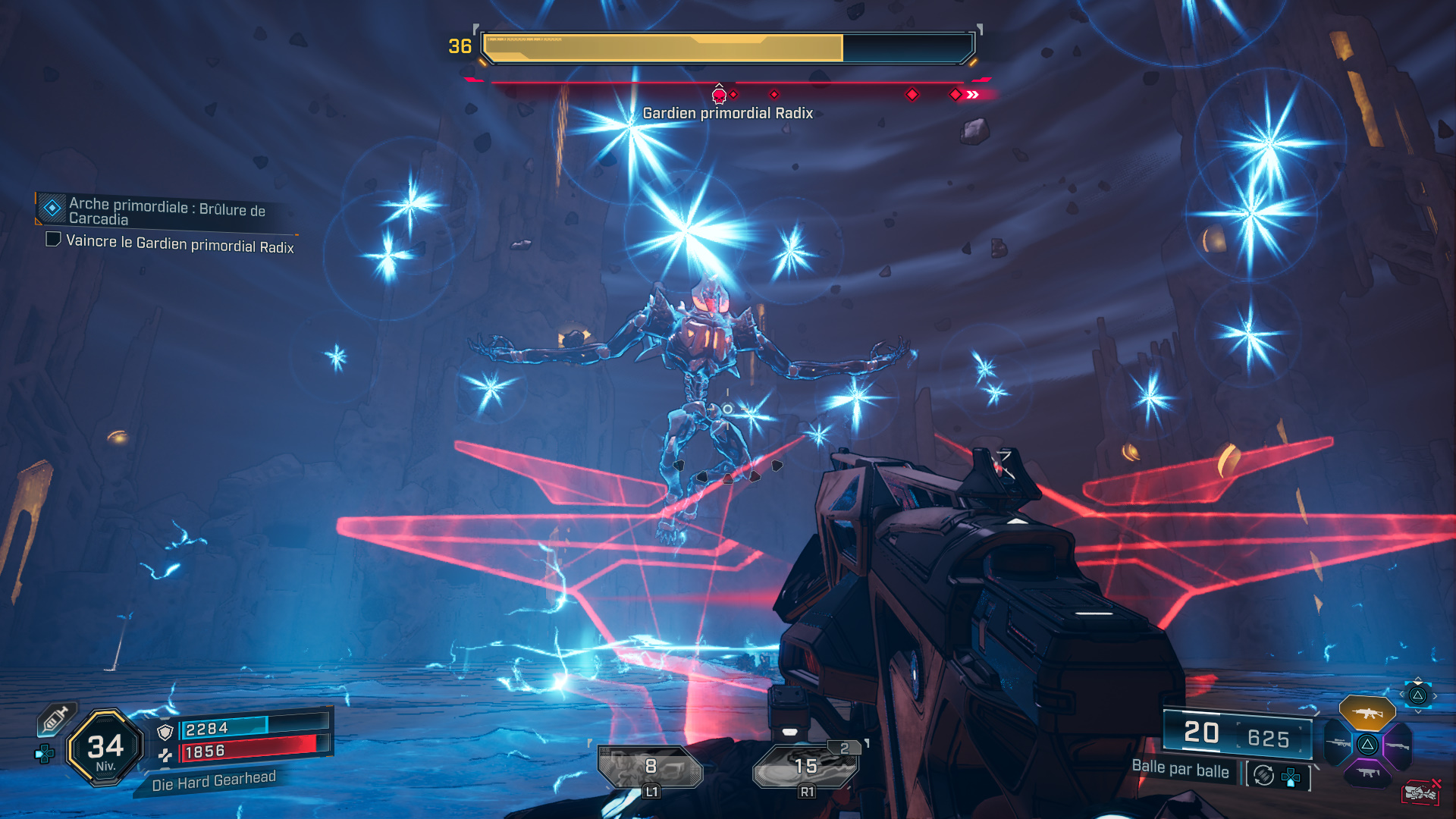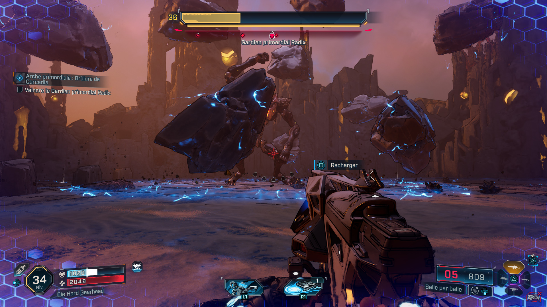 Radix possède un bouclier (barre bleue), sensible aux dégâts électriques, tandis que ses deux blindages (barres jaunes) sont sensibles aux dégâts corrosifs, l’idéal étant donc d’avoir une arme de chaque type élémentaire pour en venir à bout plus rapidement. Sinon, il inflige des dégâts électriques, tout en faisant tournoyer des rochers autour de lui, dont certains deviendront bleutés pour être projetés dans votre direction. Evitez également ses larges ondes de choc électriques en sautant sur les rochers, tout comme ses éclairs lorsqu’il s’élève dans les airs et dont il faut éviter les impacts au sol. Enfin, tuez les Pangolins électriques ou tirez sur les mines autour de lui si jamais vous avez besoin de retrouver un second souffle.