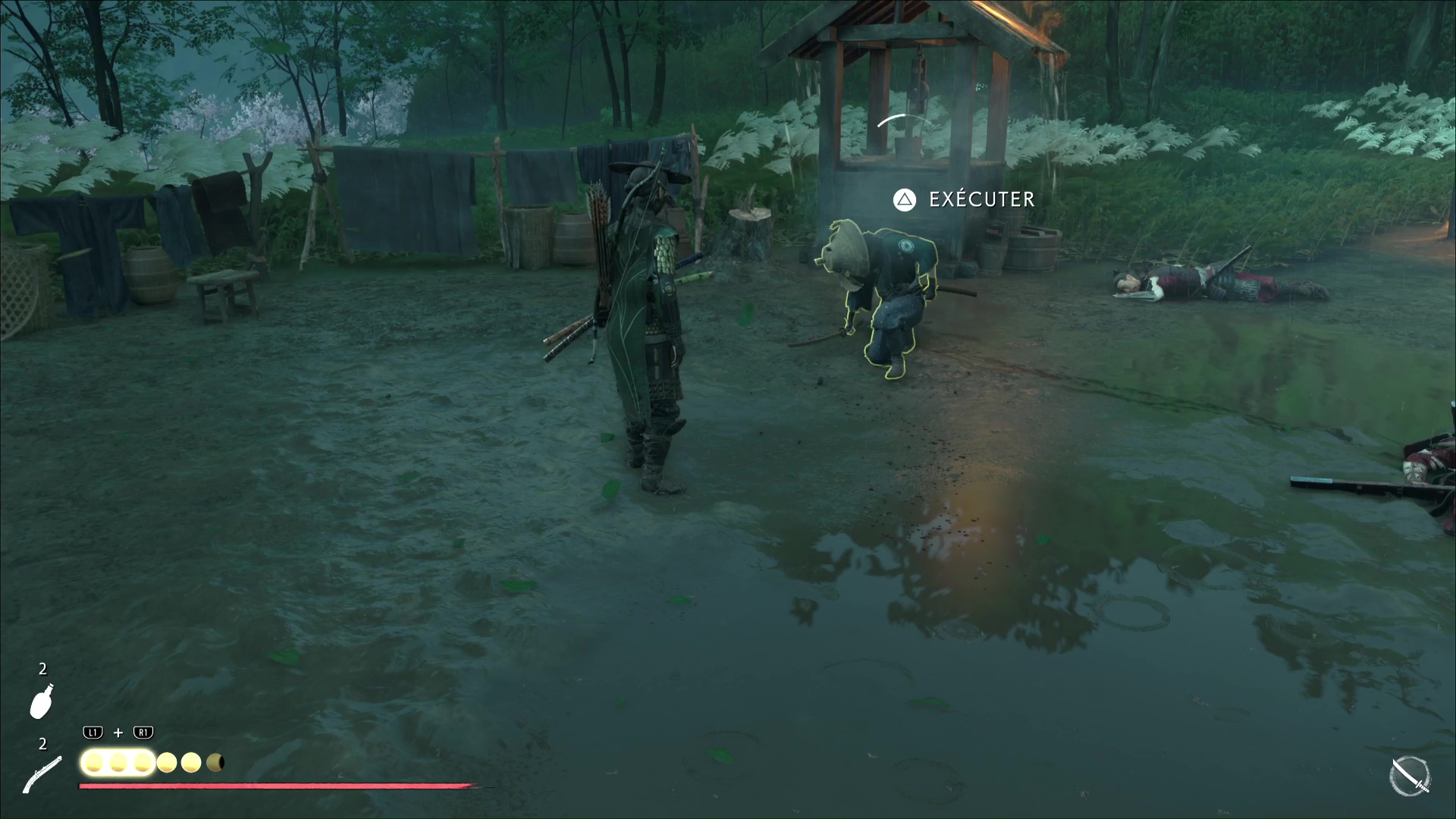 Approchez discrètement et progressez caché dans des herbes hautes. Vous avez la possibilité d’éliminer l’homme habillé en bleu d’une exécution de kusarigama, si vous avez l’arme et la compétence, mais vous vous ferez repérer. Il est donc préférable d’éliminer ceux qui n’attireraient pas l’attention.