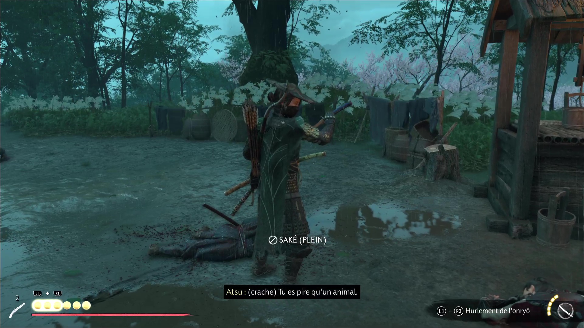 Approchez de la maison et ouvrez la porte. À l’intérieur, vous constaterez que Murata est mal en point. Parlez-lui pour apprendre qu’un de ses clients lui a tiré dessus. Il vous dira ensuite d’aller lui chercher du saké.