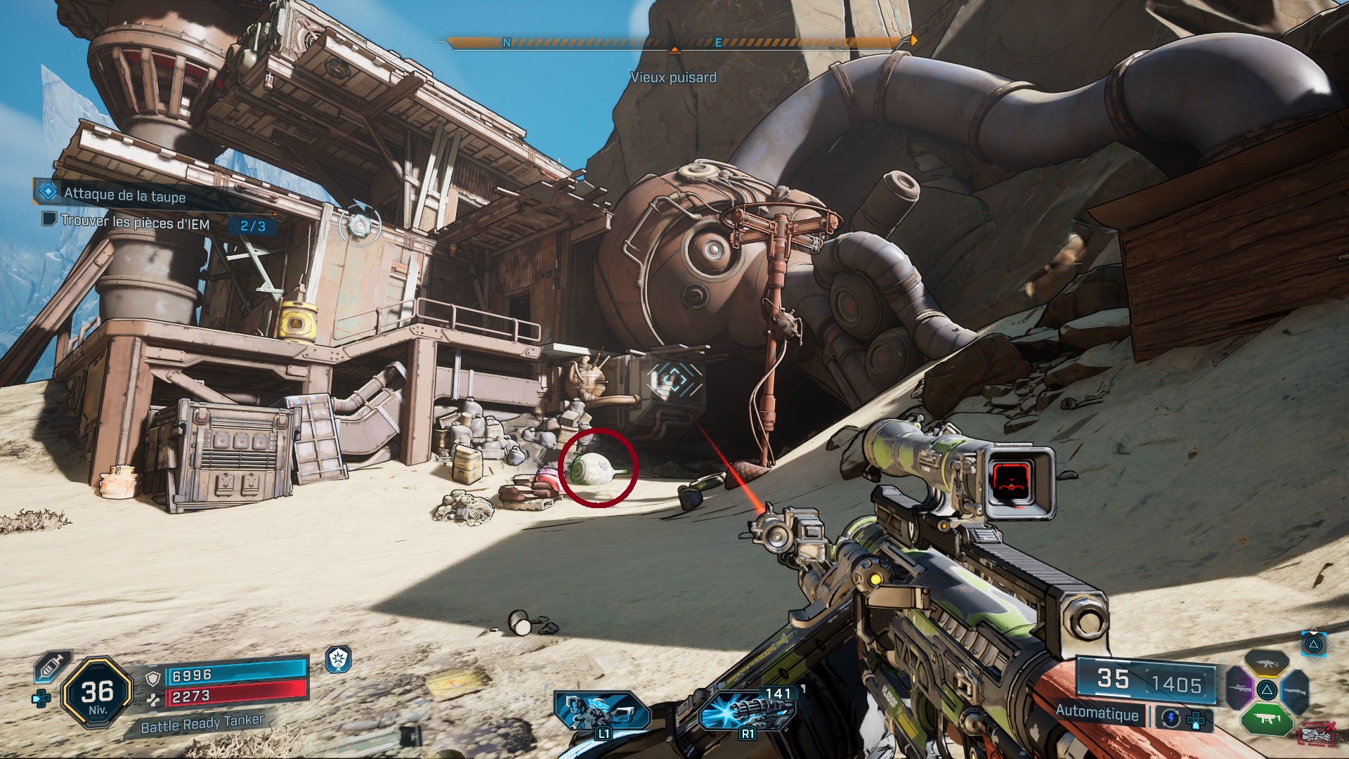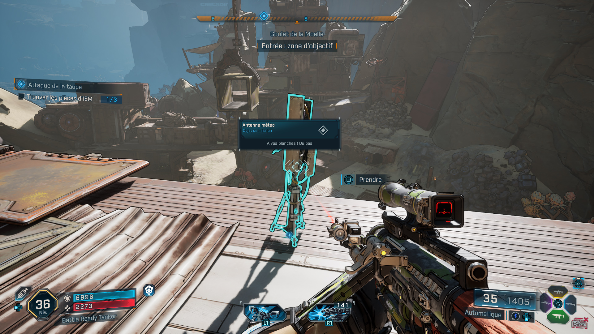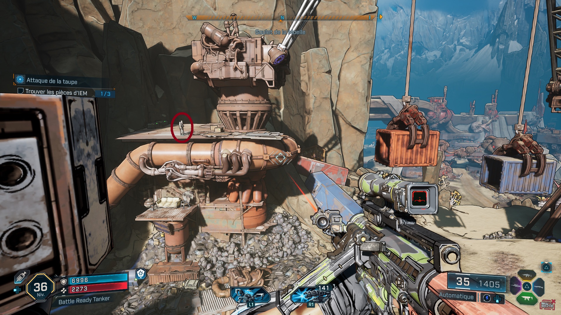 Puis, il s’agit ensuite de trouver 3 pièces d’IEM, quelque part au nord de Carcadia, au niveau du Goulet de la Moelle. Une fois dans la zone d’objectif, tuez tous les ennemis et repérez une première grue vers le sud, l’une des pièces d’IEM se trouvant justement à l’étage du bâtiment adjacent, juste à côté d’une porte.