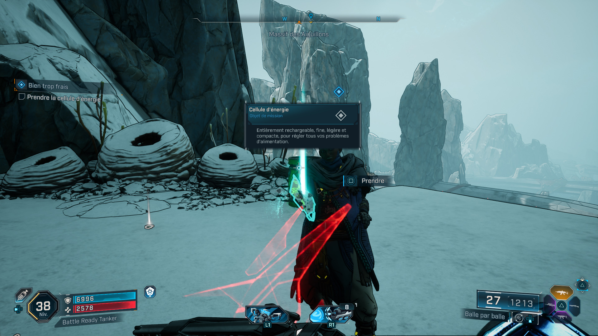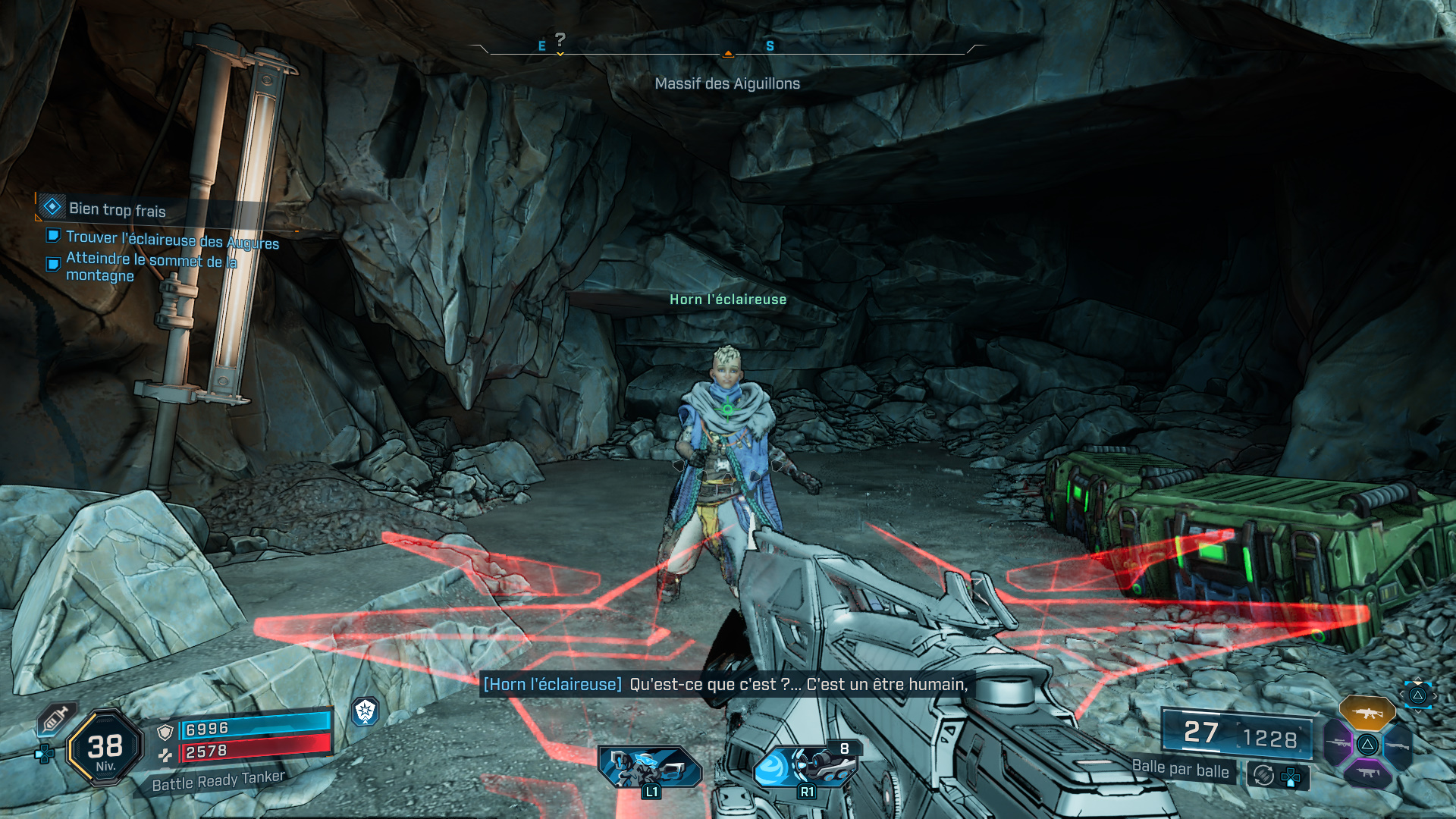 Une fois en haut, entrez dans la petite grotte pour y trouver l’éclaireuse Horn, et débarrassez-vous des Atropées qui débarquent. Parlez ensuite à Horn, et prenez sa cellule d’énergie pour prendre le relais de sa mission.