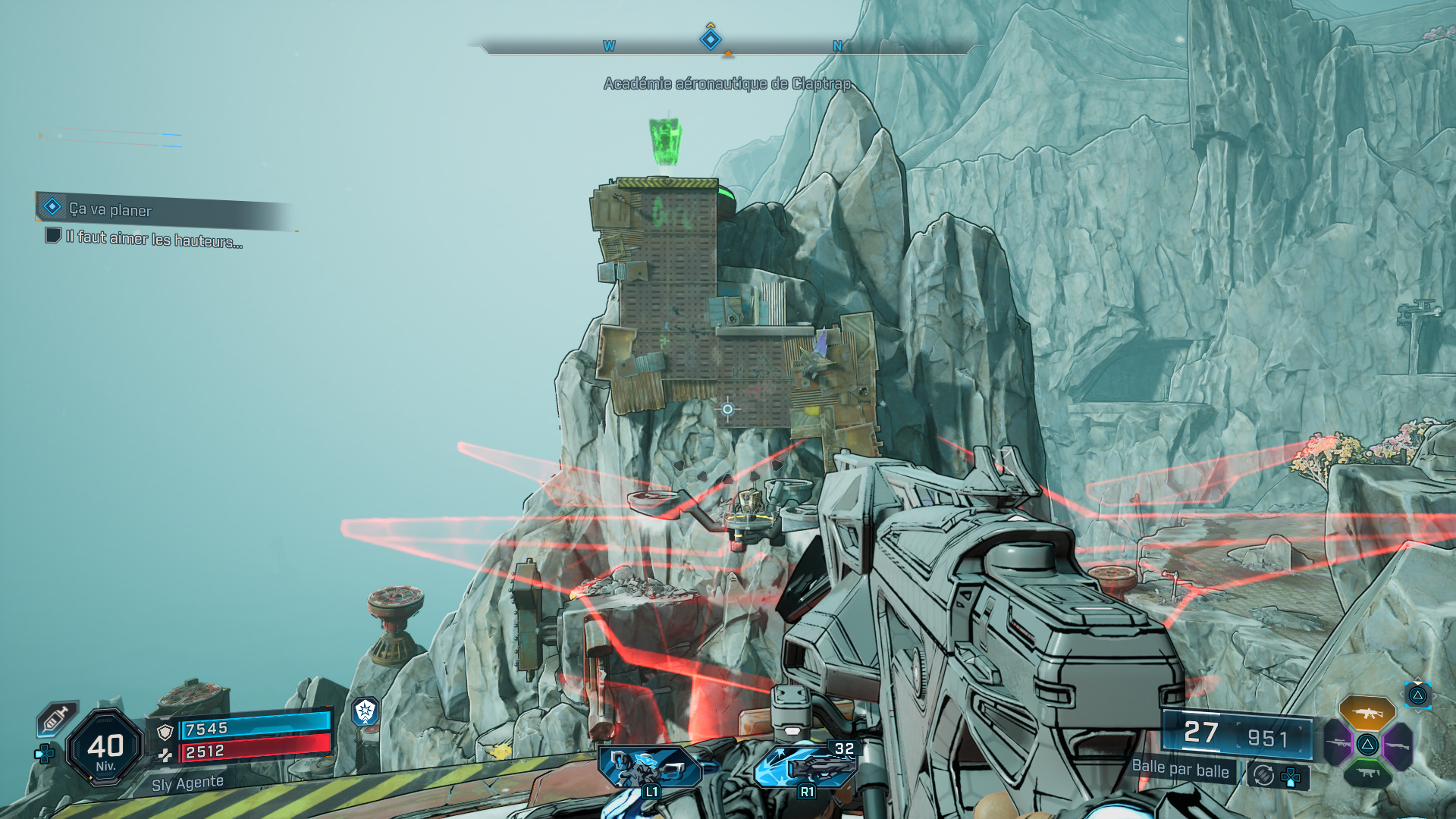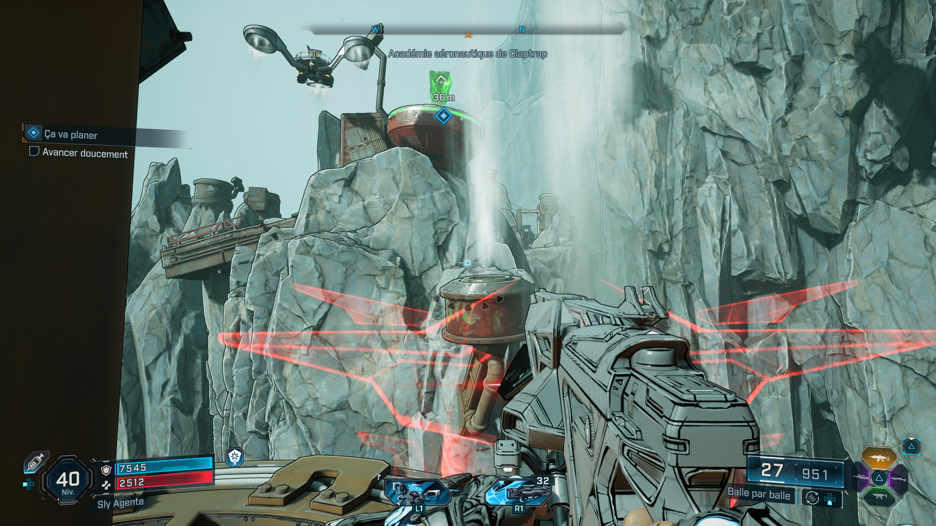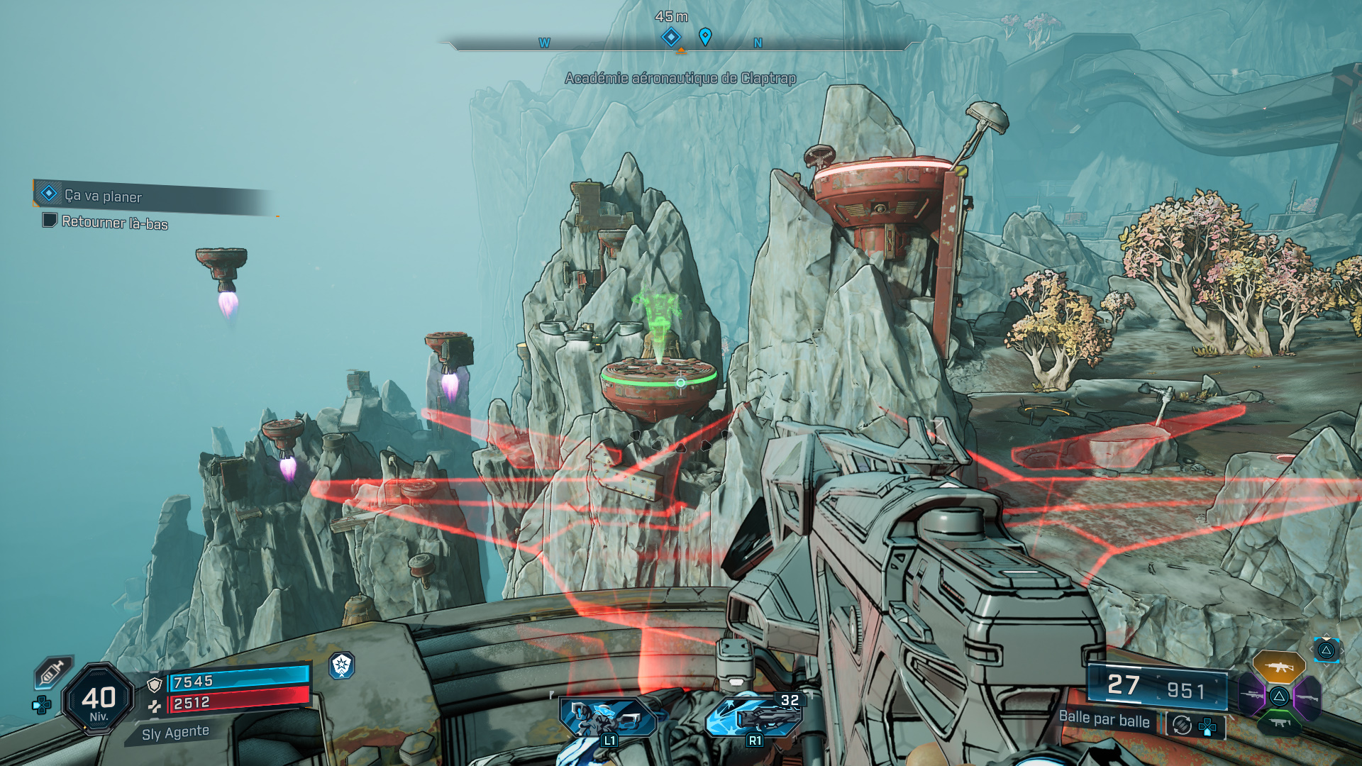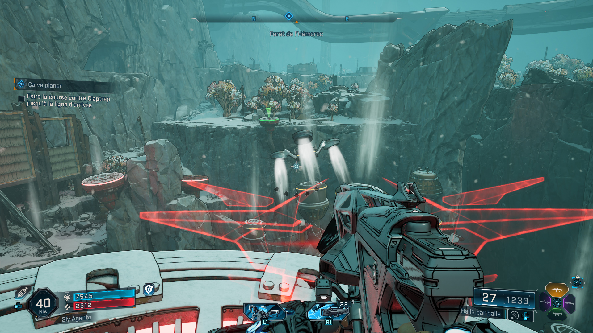 De là, passez en dessous un autre obstacle pour ensuite prendre le courant d’air ascendant et atteindre une énième plateforme. Continuez alors en planant entre les courants d’air ascendants successifs pour négocier le virage et parvenir à rejoindre Claptrap qui vous défiera sur une course jusqu’à la ligne d’arrivée, ce qui sonnera également la fin de cette mission.