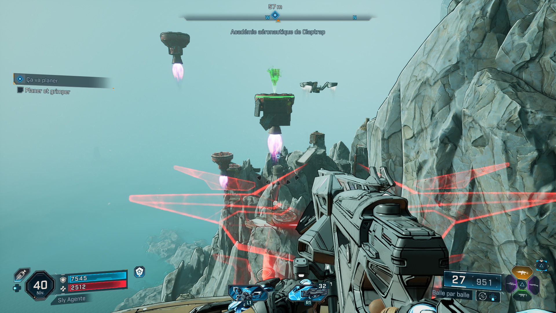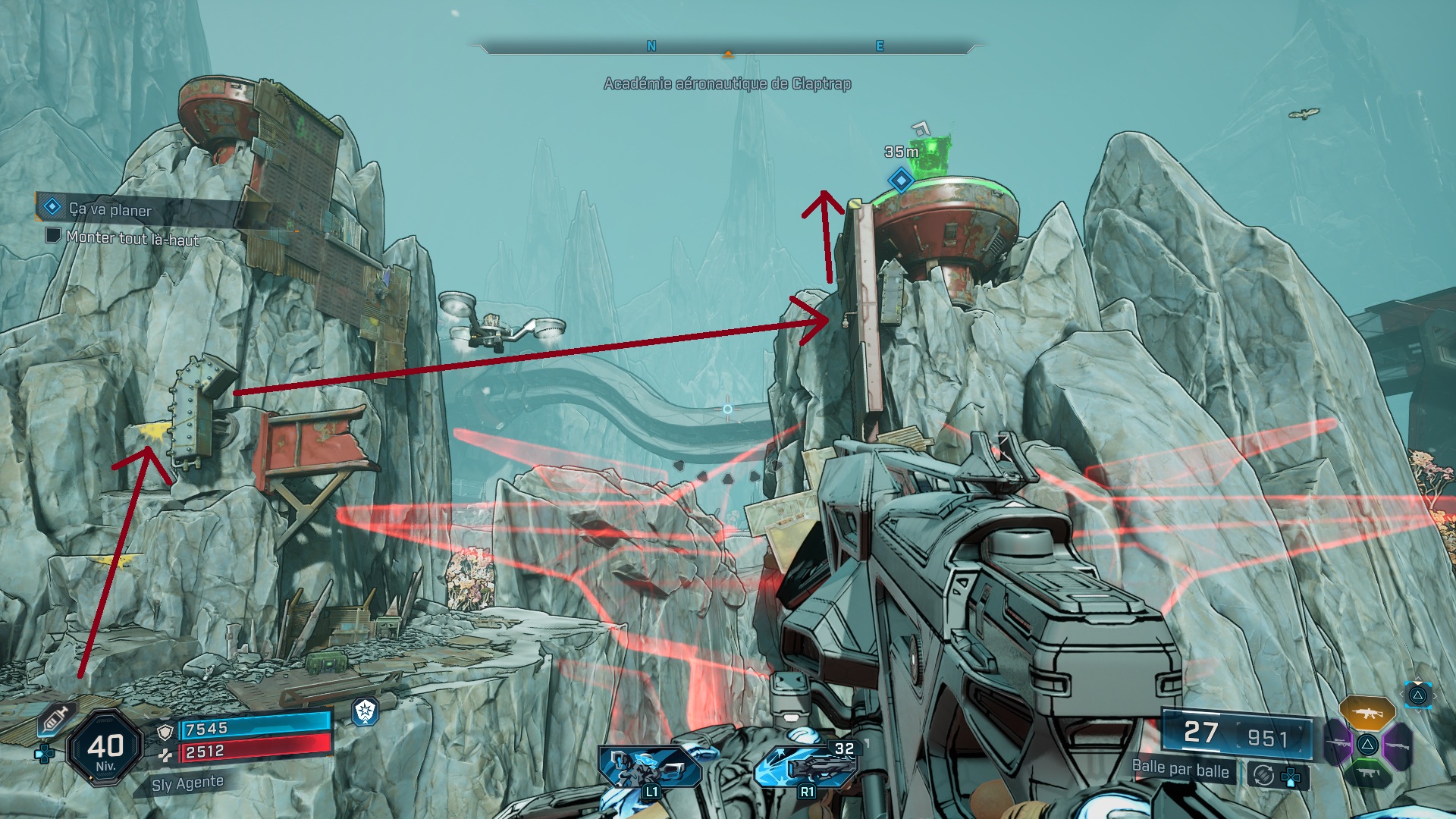 Rejoignez ensuite la ligne de départ du défi suivant un peu plus bas. Ici, commencez par vous servir des courants d’air ascendants pour prendre suffisamment de hauteur et planez jusqu’à une première plateforme, puis une deuxième. Juste avant de vous laisser glisser pour planer au-dessus de Claptrap et enchaîner sur d’autres pentes menant vers une autre plateforme.