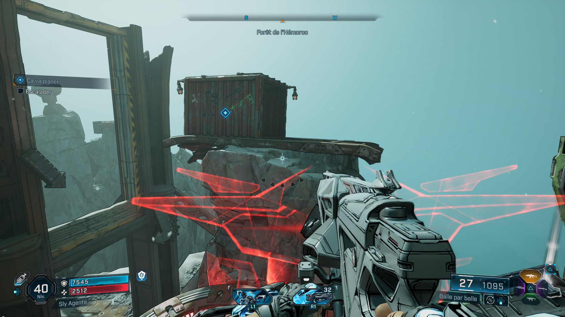 Et comme on dit, jamais deux sans trois, puisqu’un troisième et dernier défi vous attend. Embarquez à bord du vaisseau de Claptrap et rejoignez la ligne de départ. Commencez alors par planer jusqu’au courant d’air ascendant pour ensuite vous propulser vers la plateforme indiquée. Faites de même juste après en passant par-dessus l’obstacle, puis escaladez les rochers pour rejoindre un container.