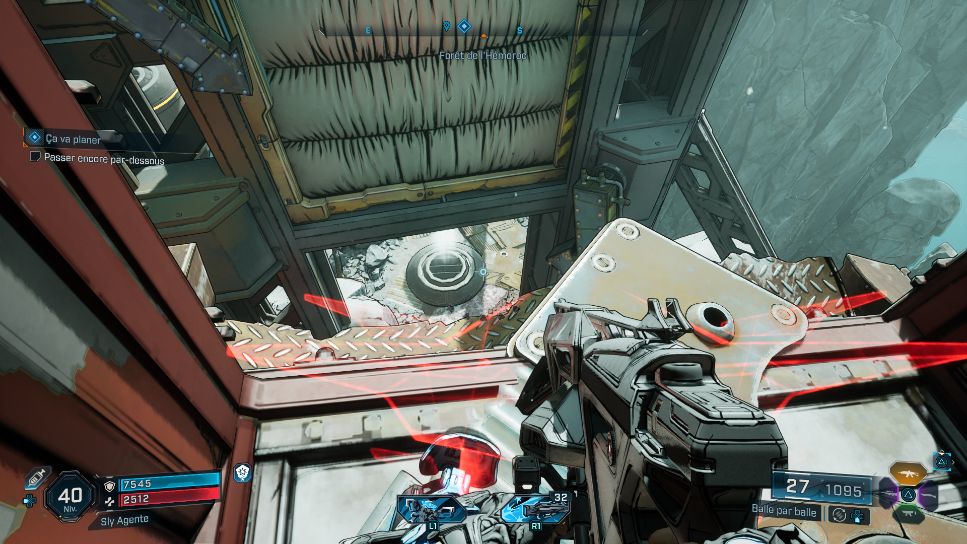 Avant d’attaquer les défis en question, Claptrap vous propose un petit échauffement qui consiste à sauter, puis à grimper pour finir en planant de manière à atteindre l’endroit indiqué. Dans la foulée, grimpez sur la plateforme en hauteur en escaladant la grille, puis planez à nouveau jusqu’à la prochaine plateforme indiquée, avant de revenir en arrière en planant vers une autre plateforme.