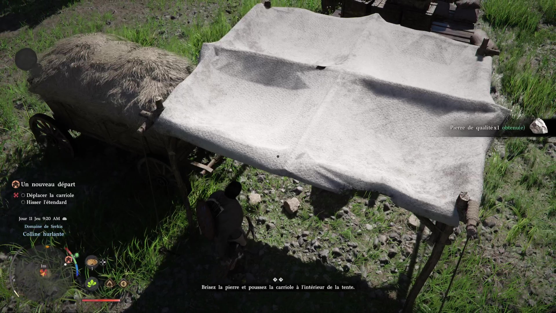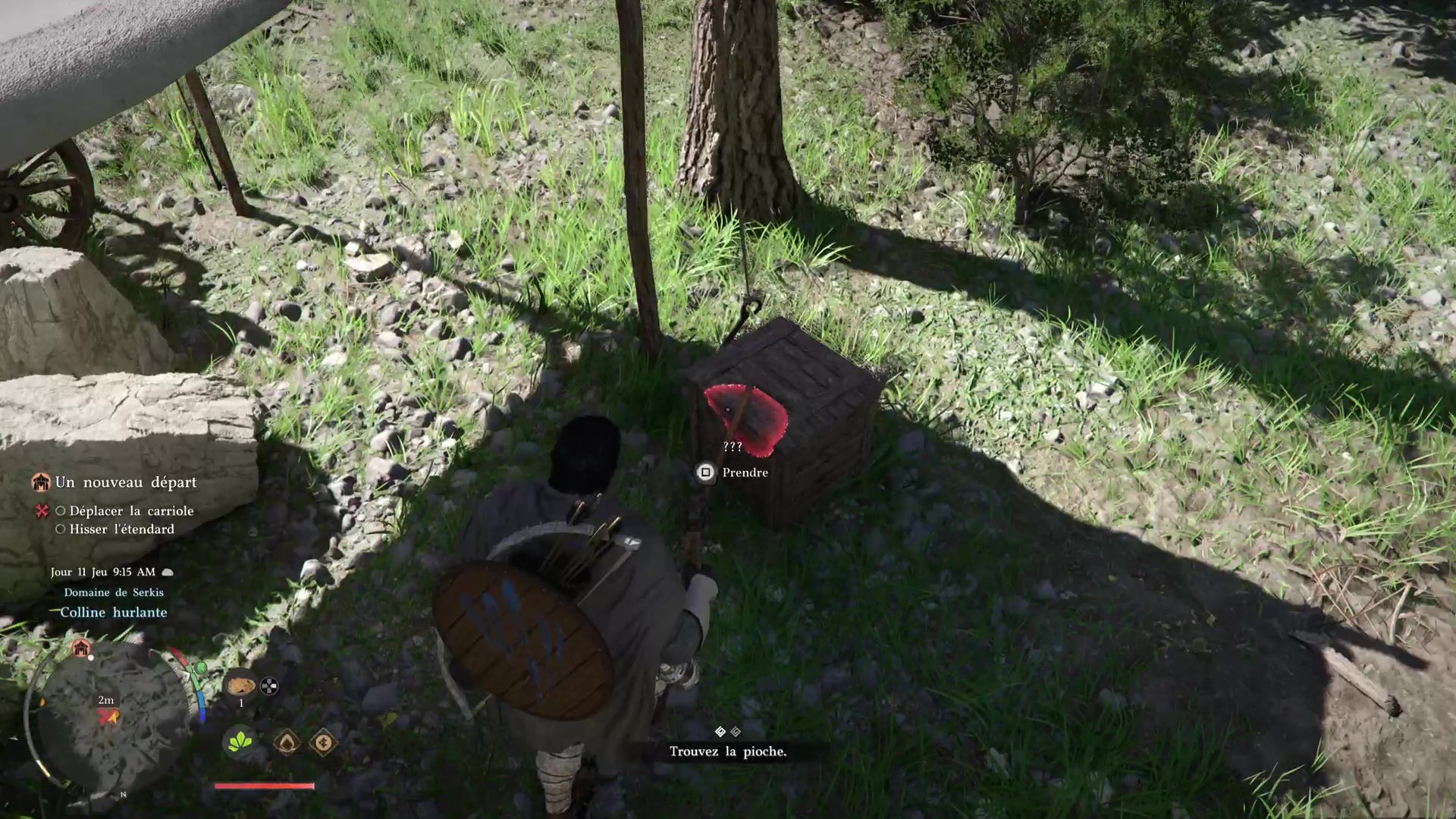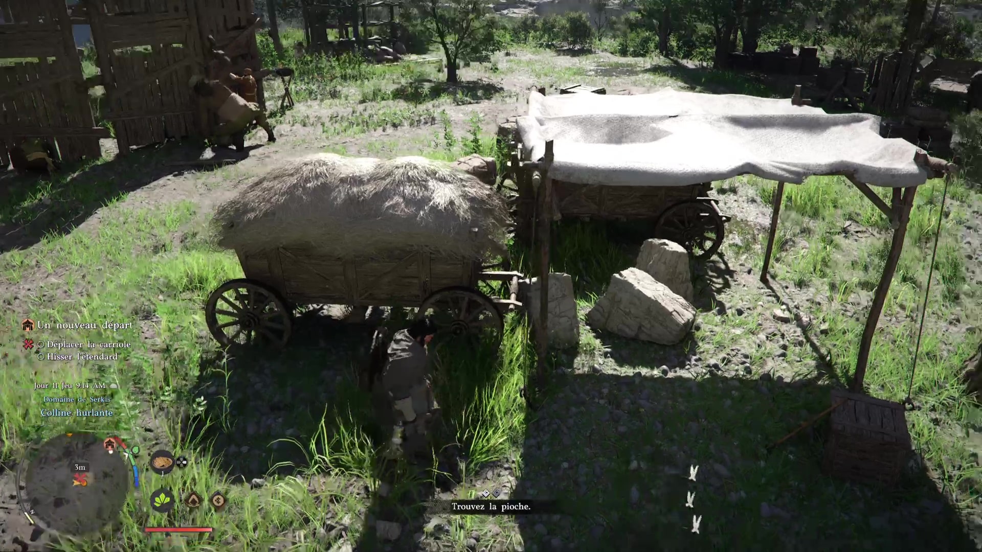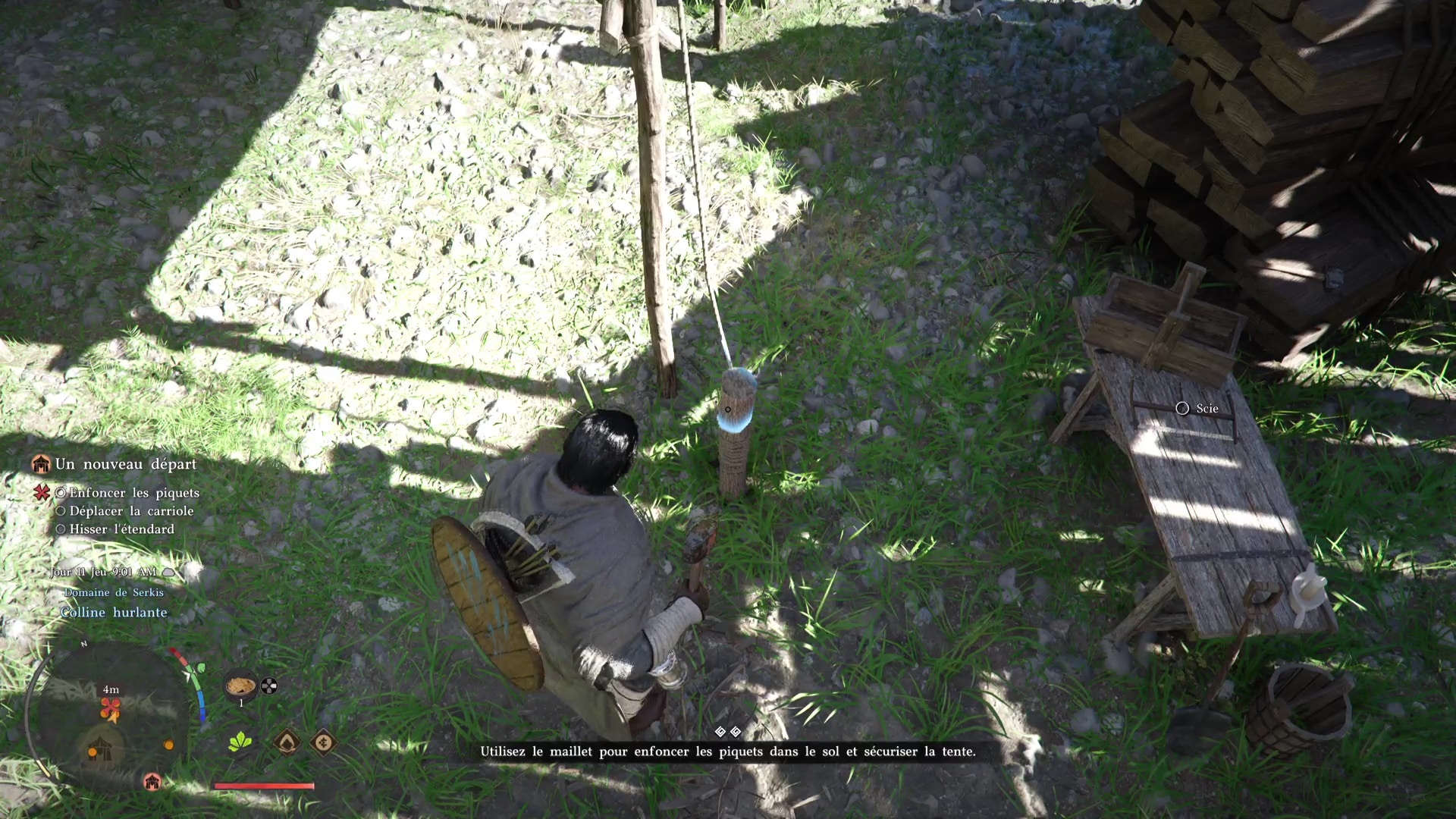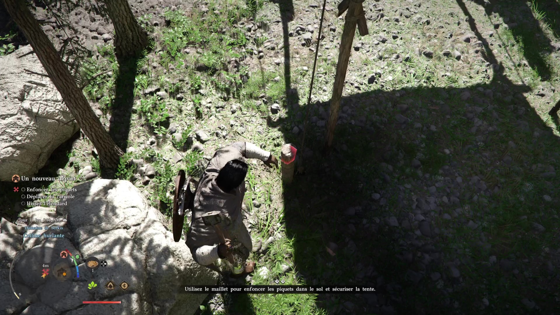 Troisième tâche, allez voir la carriole pour la mettre sous une tente. Problème, des grosses pierres vous en empêchent. Prenez la pioche posée contre une caisse au sol, et, comme pour le maillet, équipez-vous en grâce à la roue d’équipement.