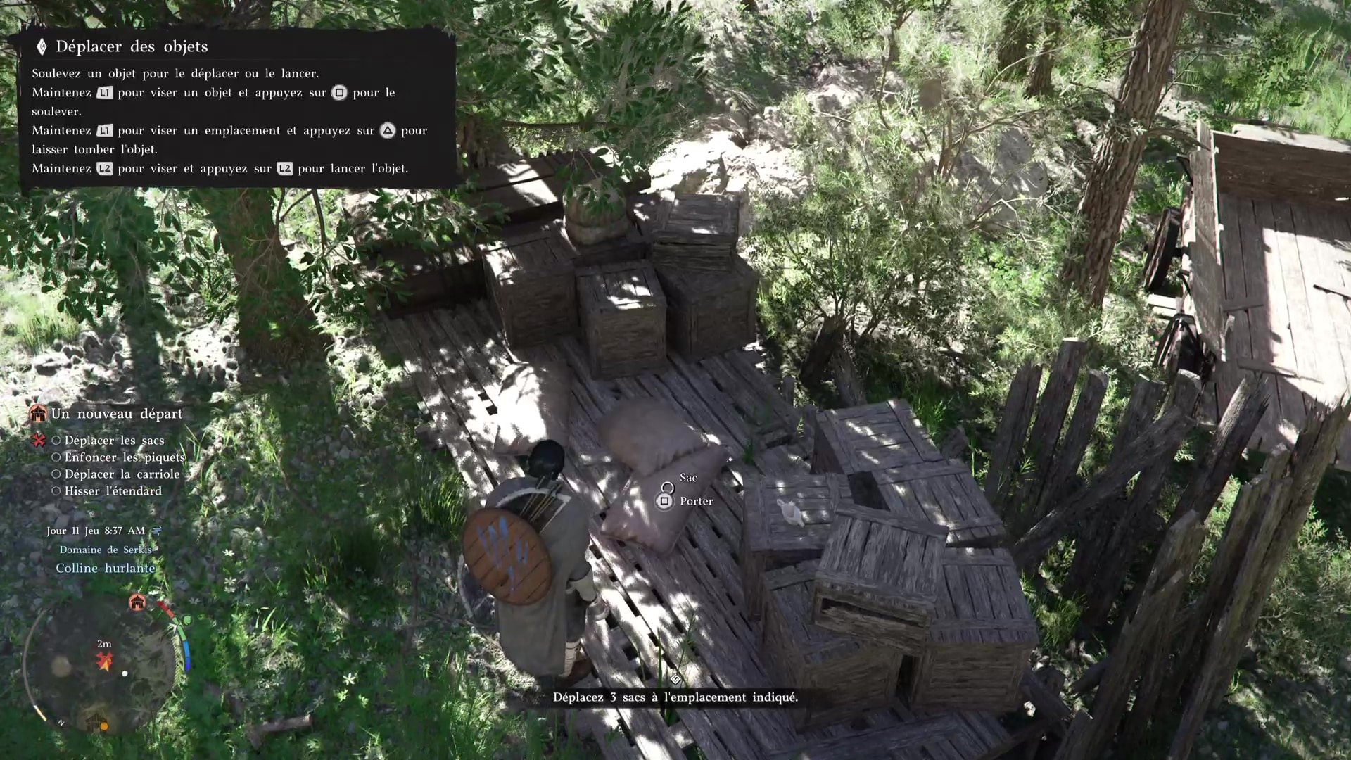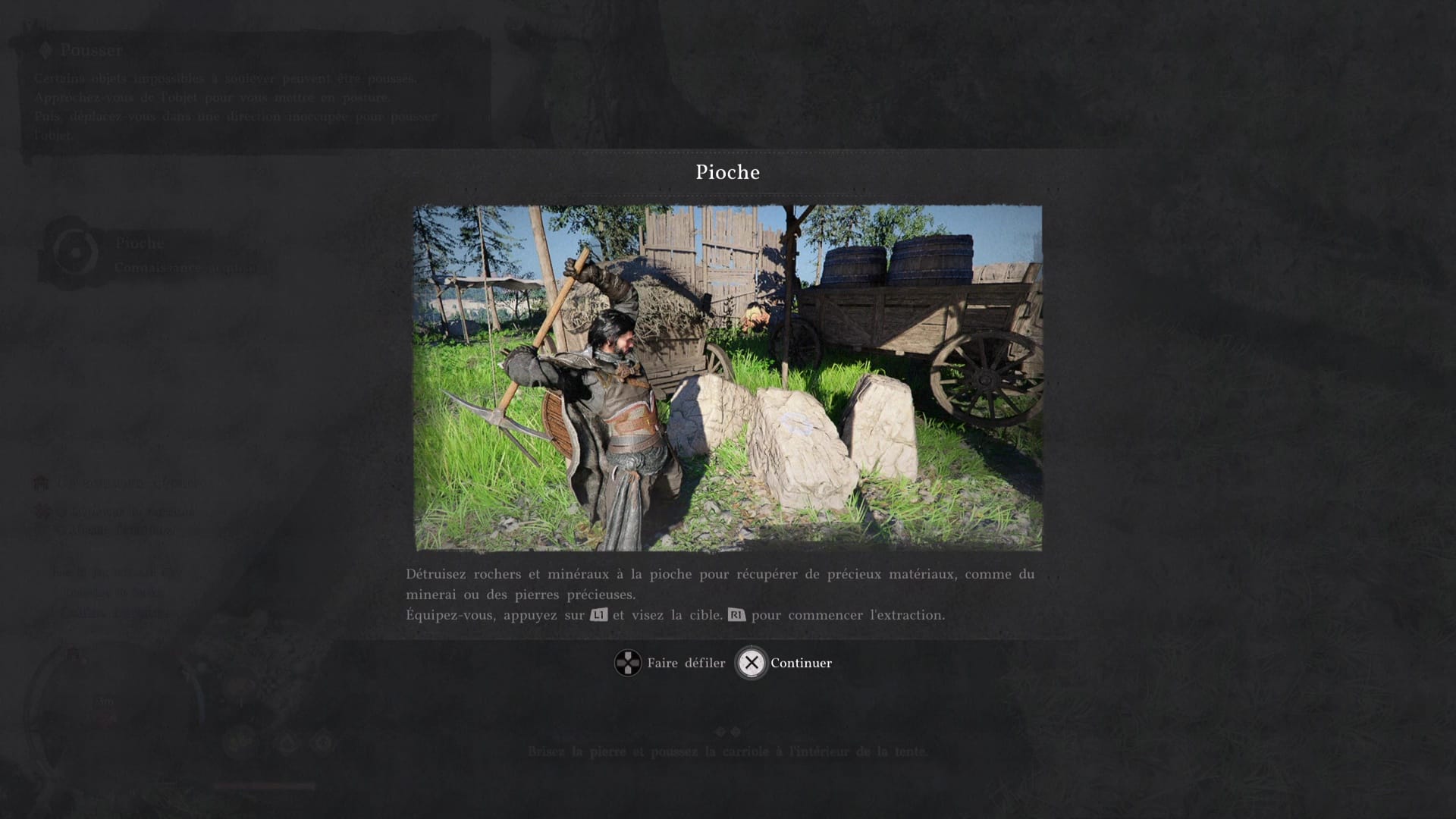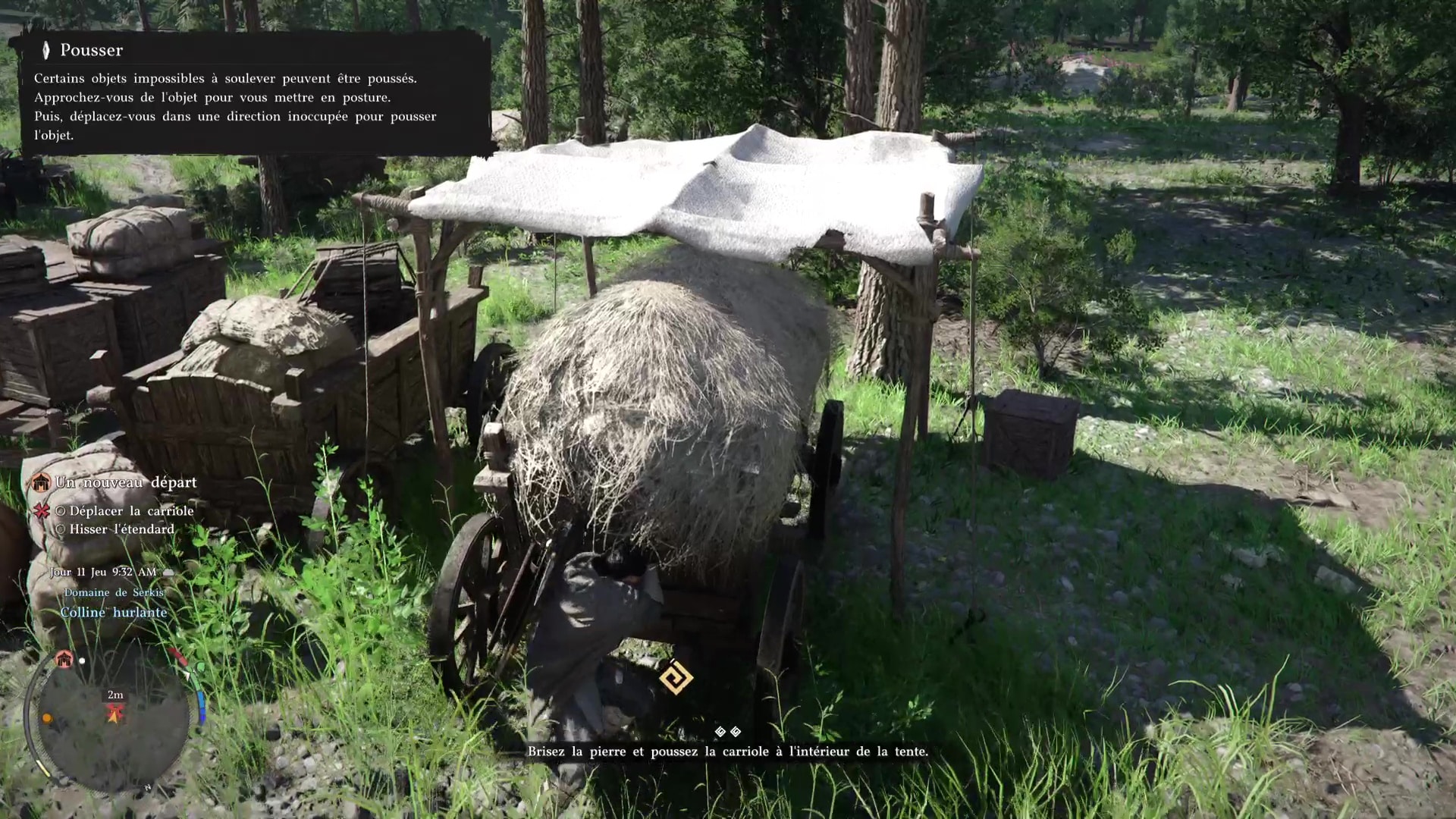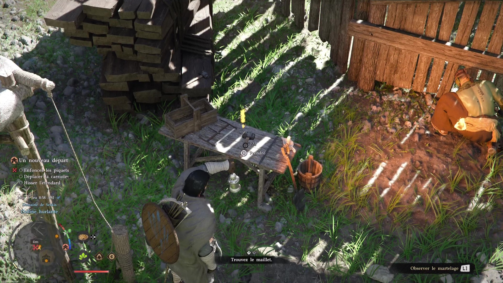 Troisième tâche, allez voir la carriole pour la mettre sous une tente. Problème, des grosses pierres vous en empêchent. Prenez la pioche posée contre une caisse au sol, et, comme pour le maillet, équipez-vous en grâce à la roue d’équipement.