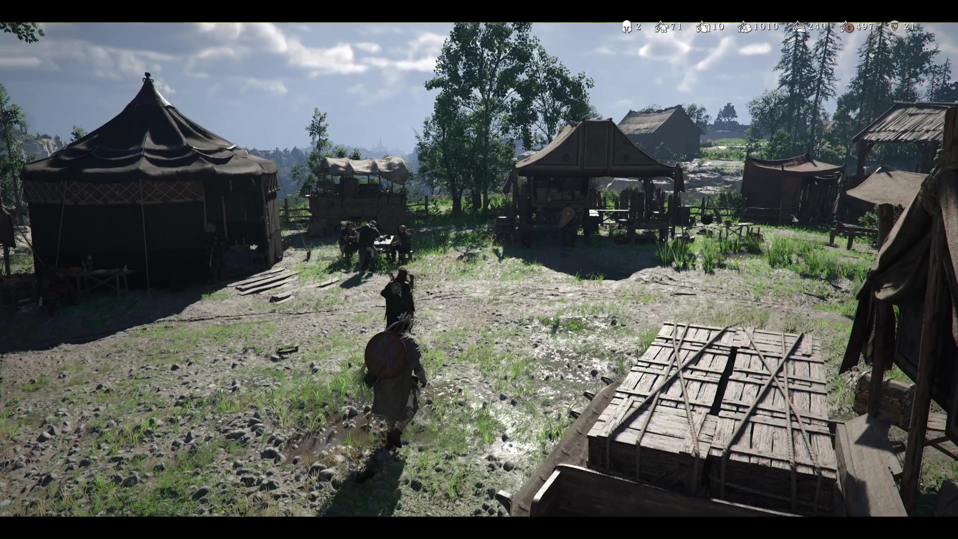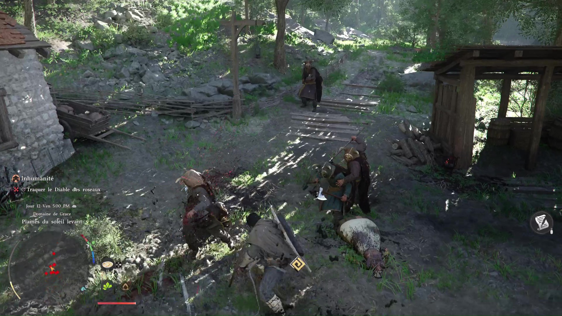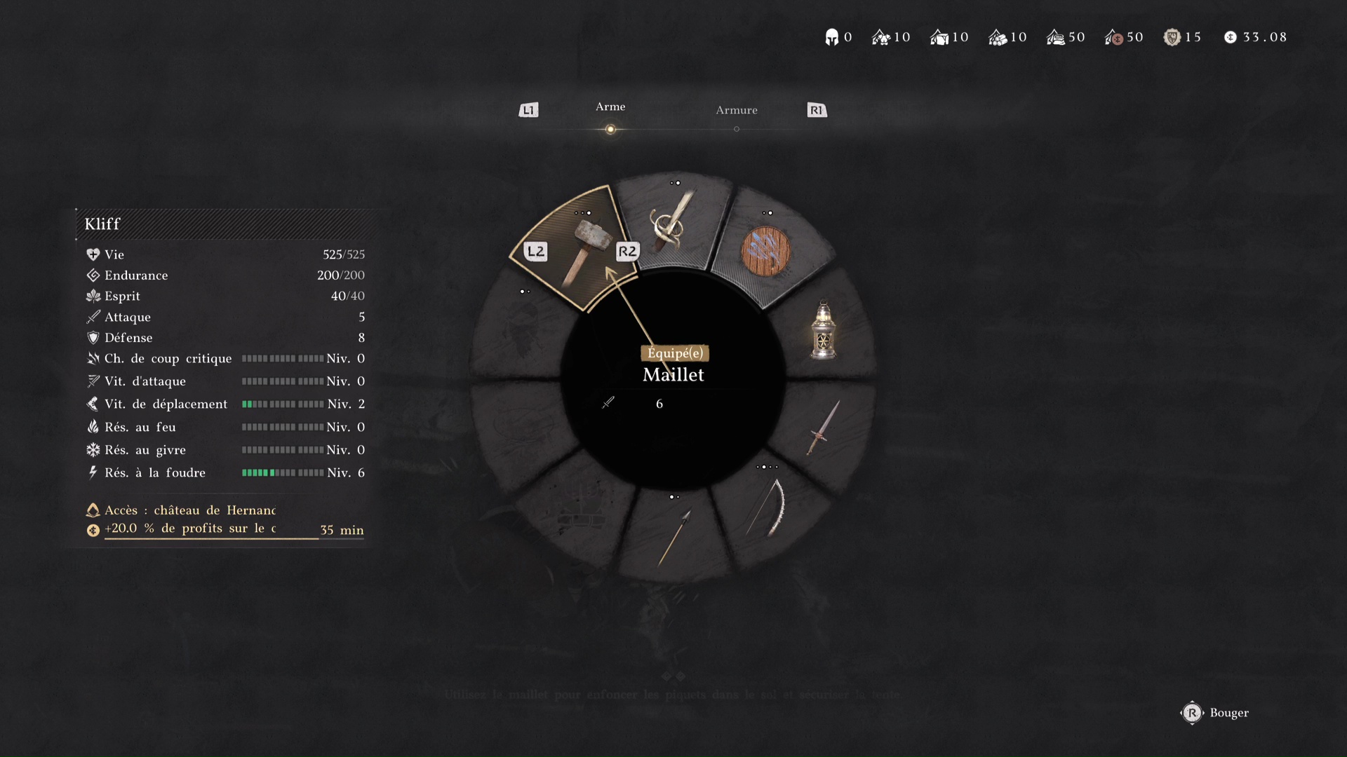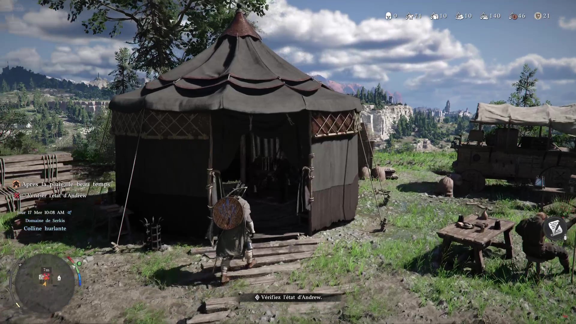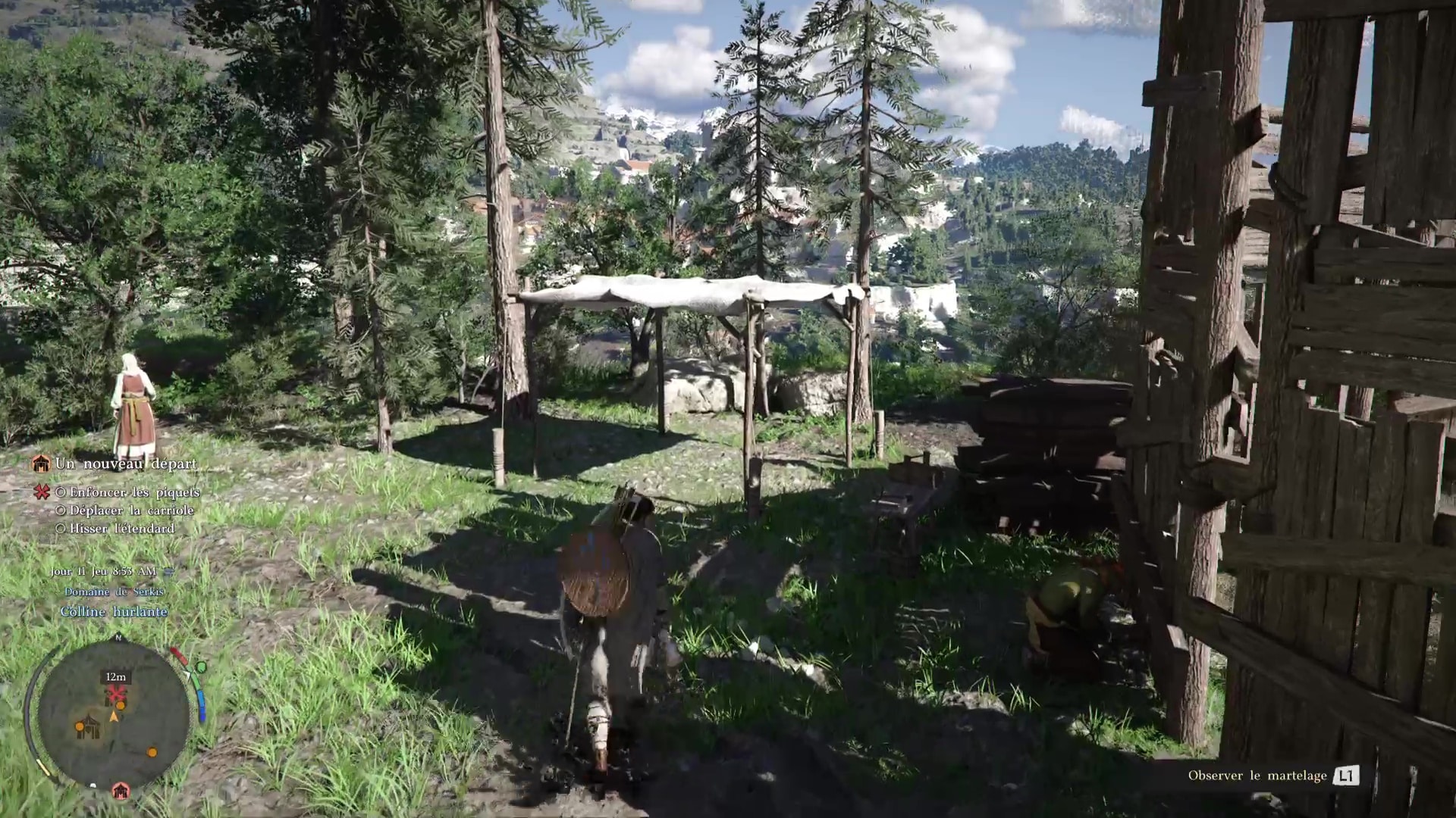 Troisième tâche, allez voir la carriole pour la mettre sous une tente. Problème, des grosses pierres vous en empêchent. Prenez la pioche posée contre une caisse au sol, et, comme pour le maillet, équipez-vous en grâce à la roue d’équipement.