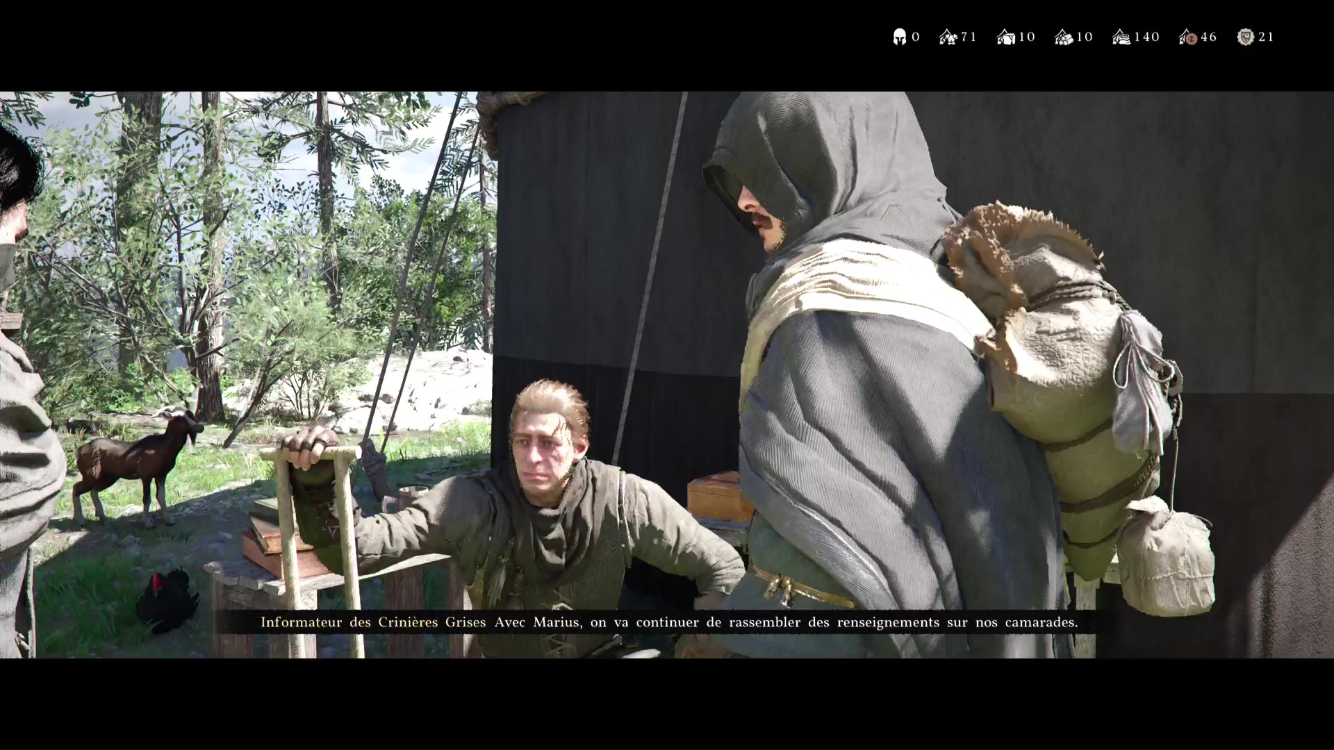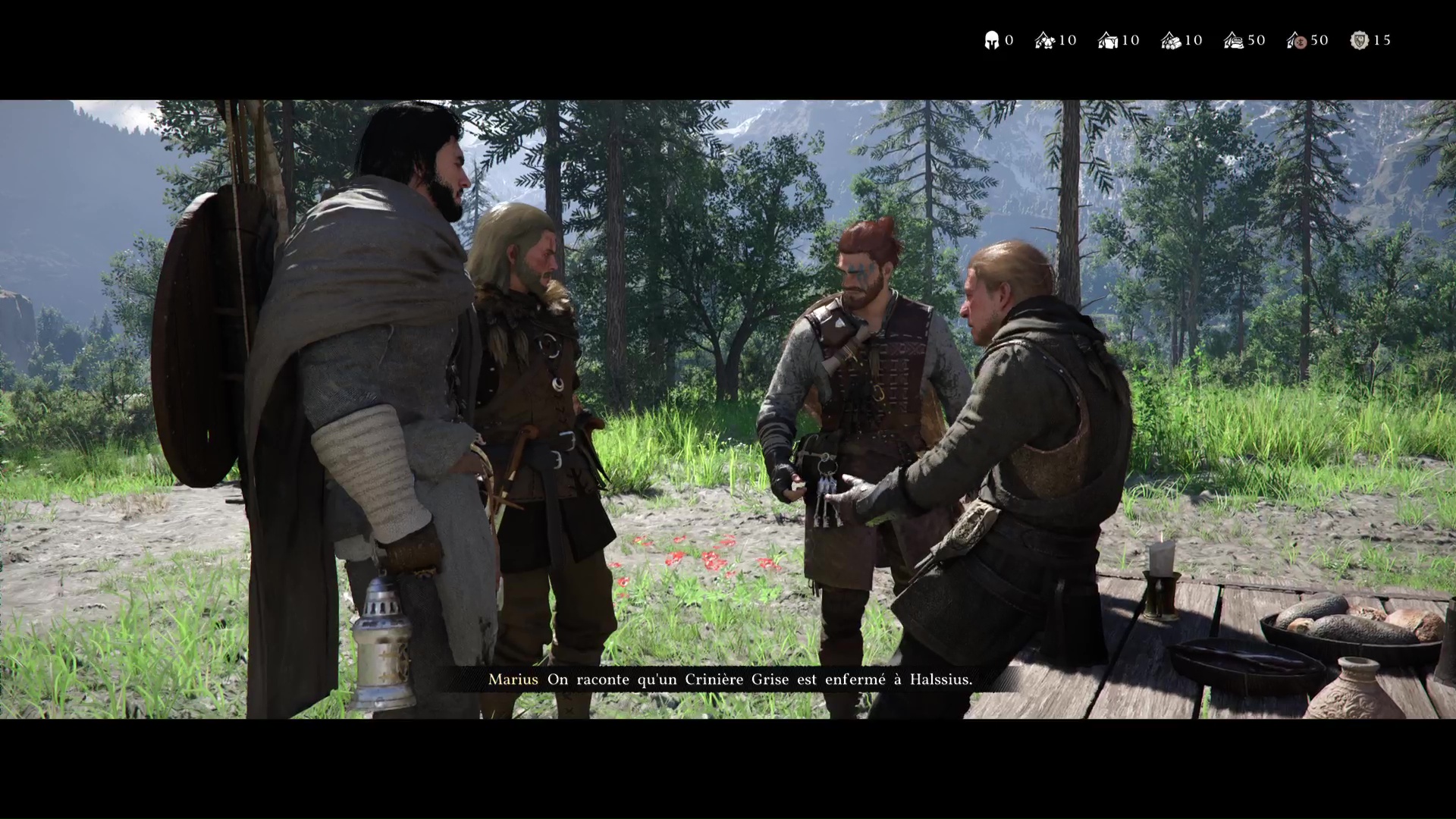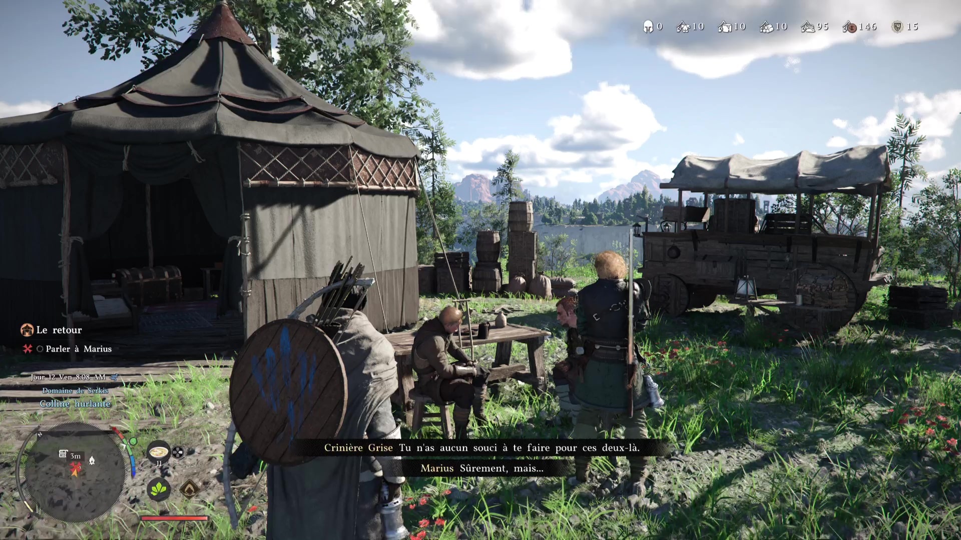 Retournez au camp des Crinières Grises et entrez dans la tente principale. Kliff constate l’état d’Andrew avant que Naira ne vous invite à aller voir Marius. Celui-ci vous informe qu’il va se renseigner sur Pailune. Enfin, Yann débarque et se donne en spectacle.