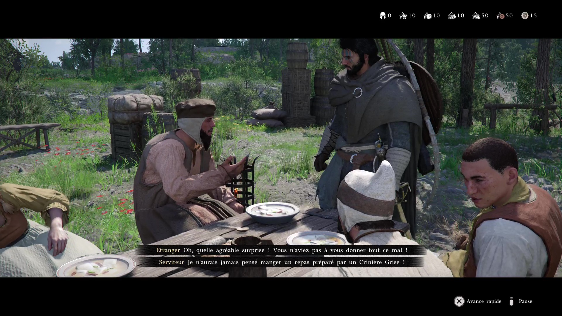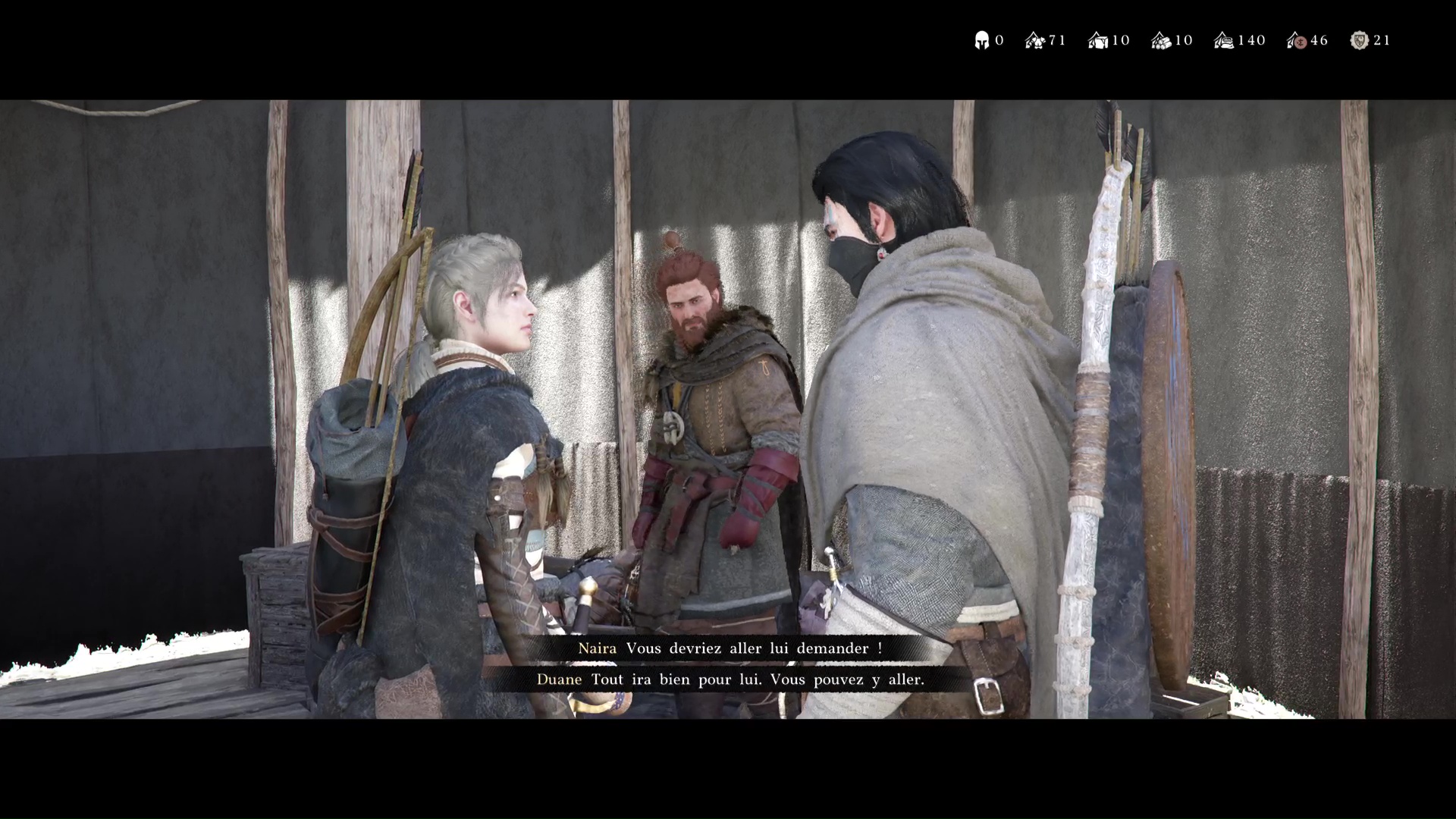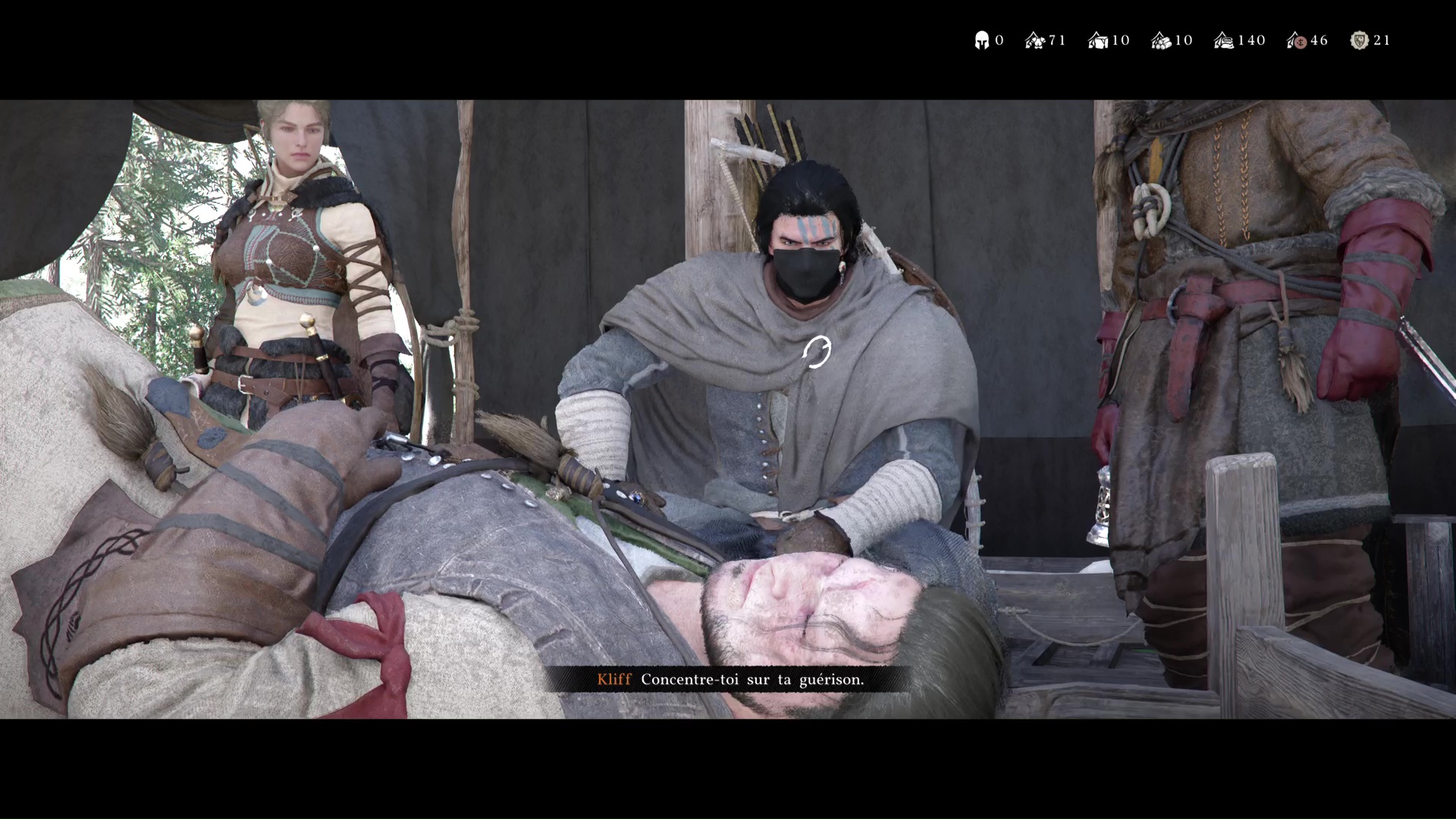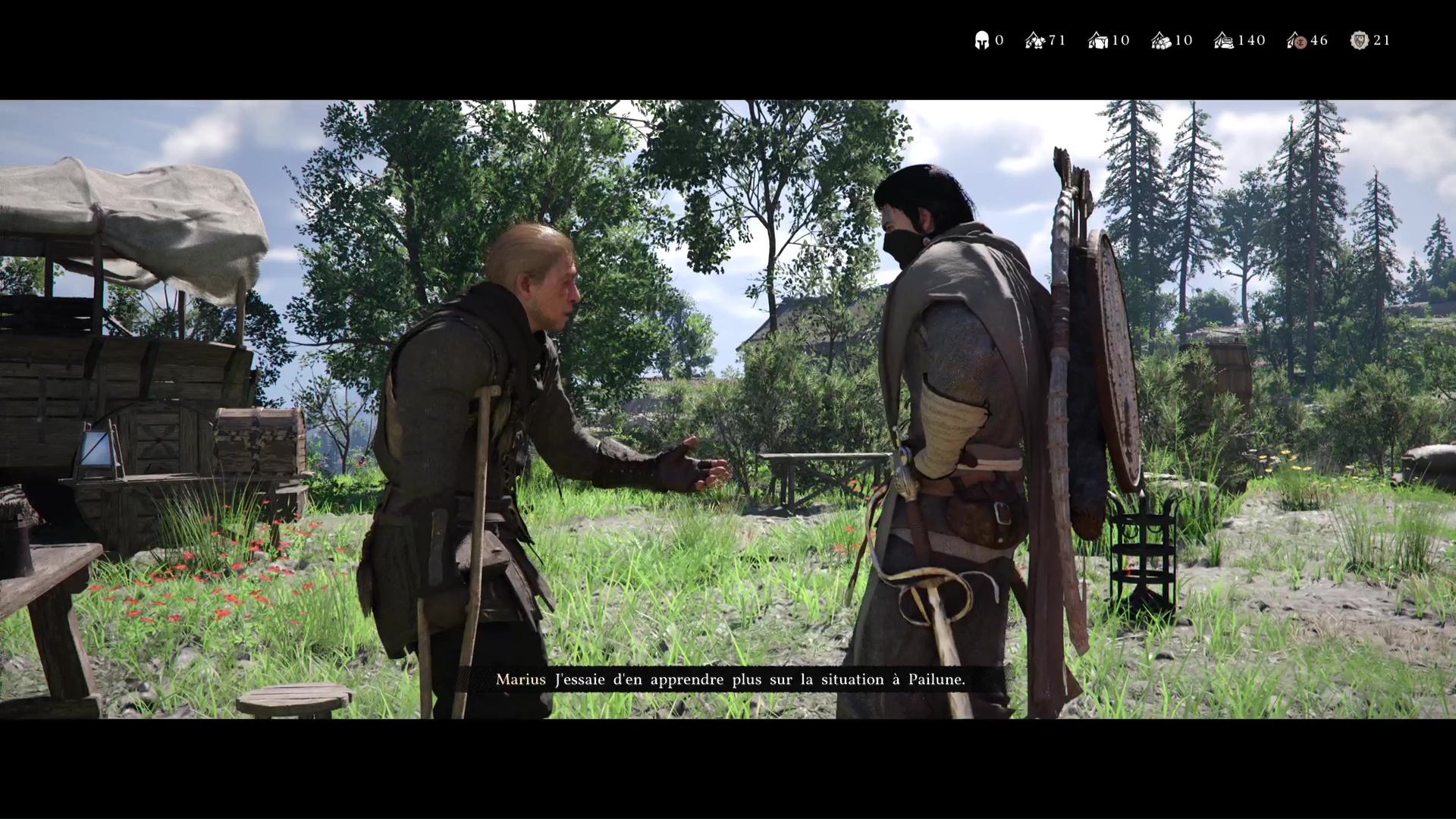 Retournez au camp des Crinières Grises et entrez dans la tente principale. Kliff constate l’état d’Andrew avant que Naira ne vous invite à aller voir Marius. Celui-ci vous informe qu’il va se renseigner sur Pailune. Enfin, Yann débarque et se donne en spectacle.