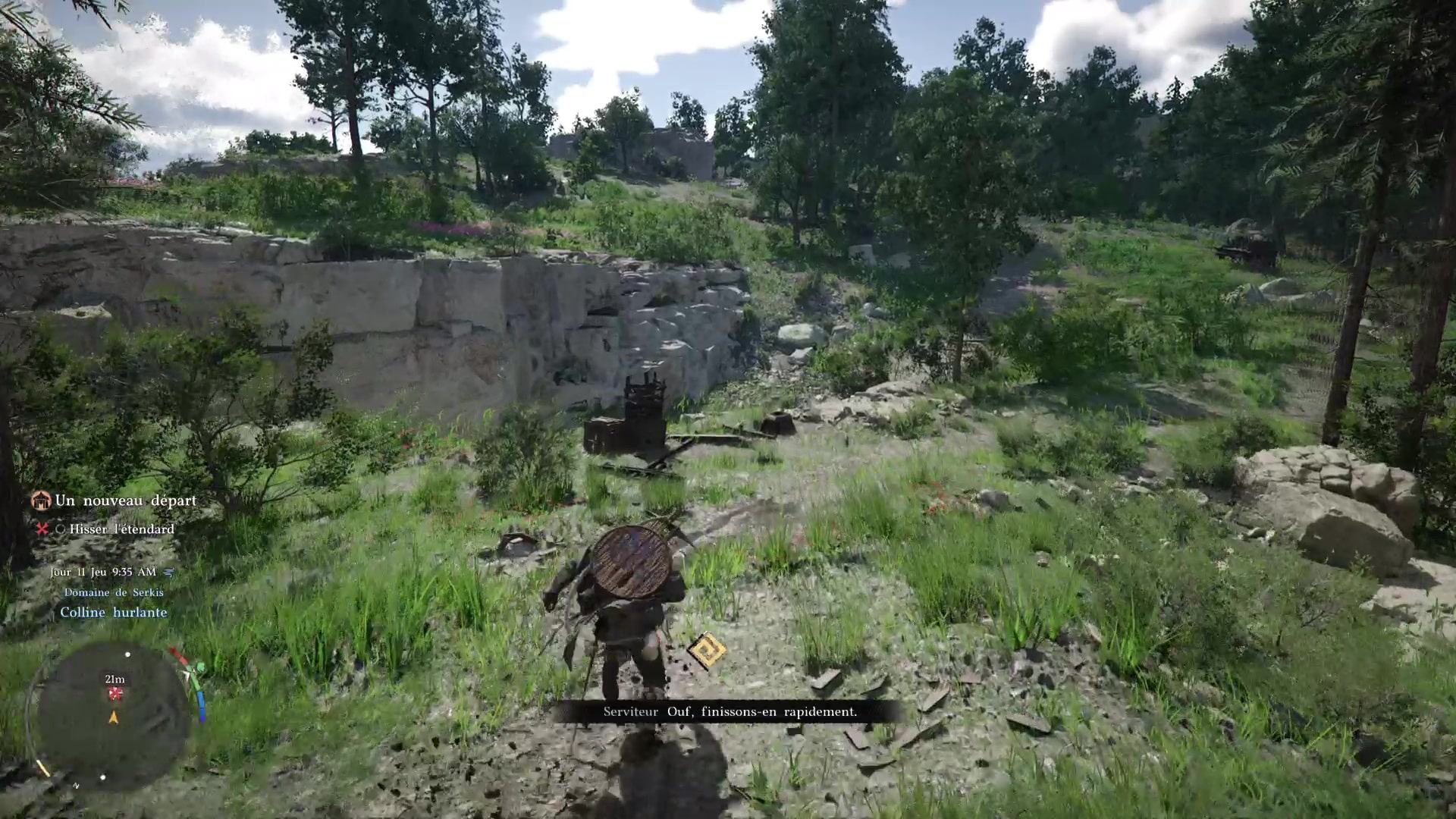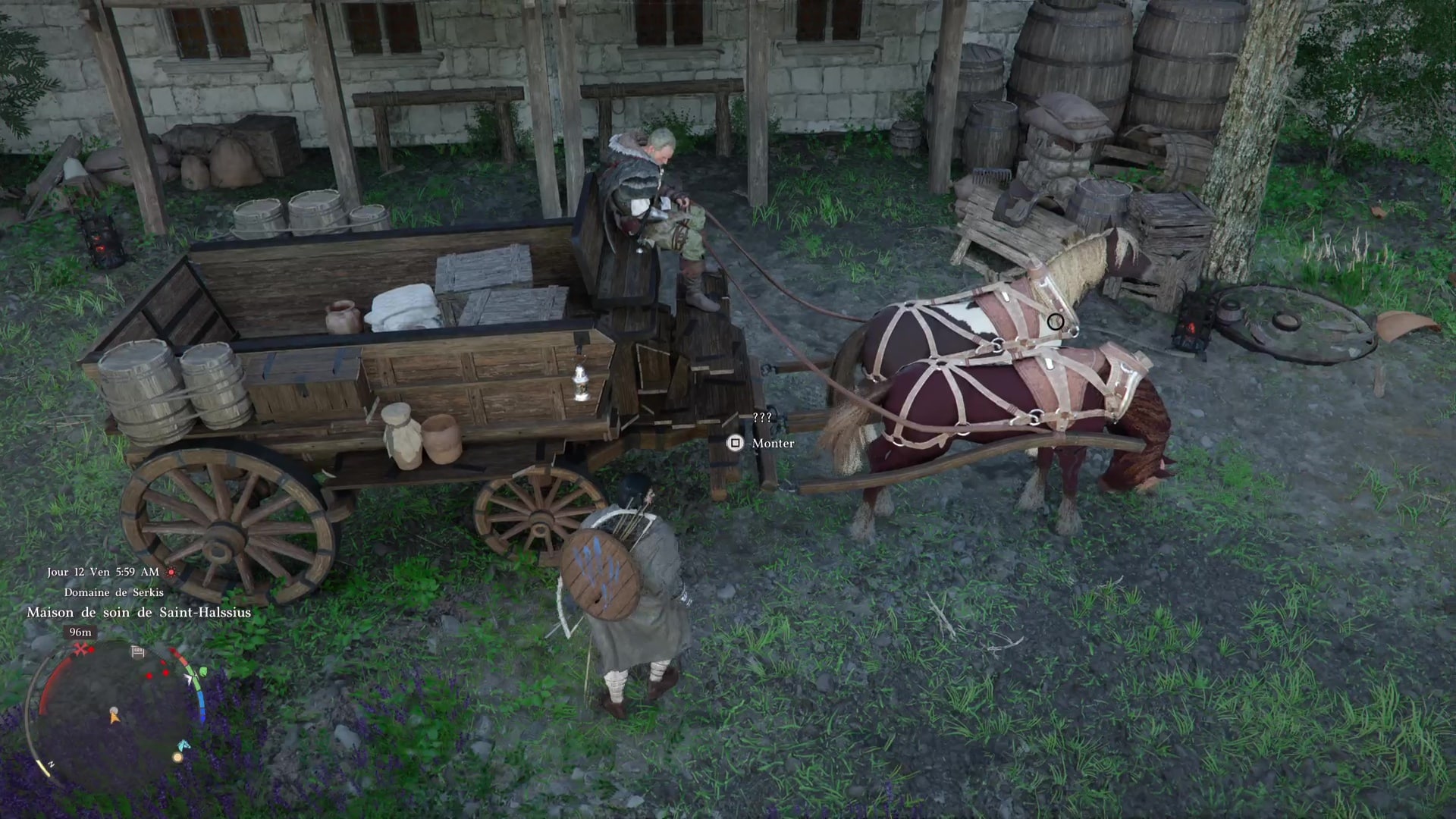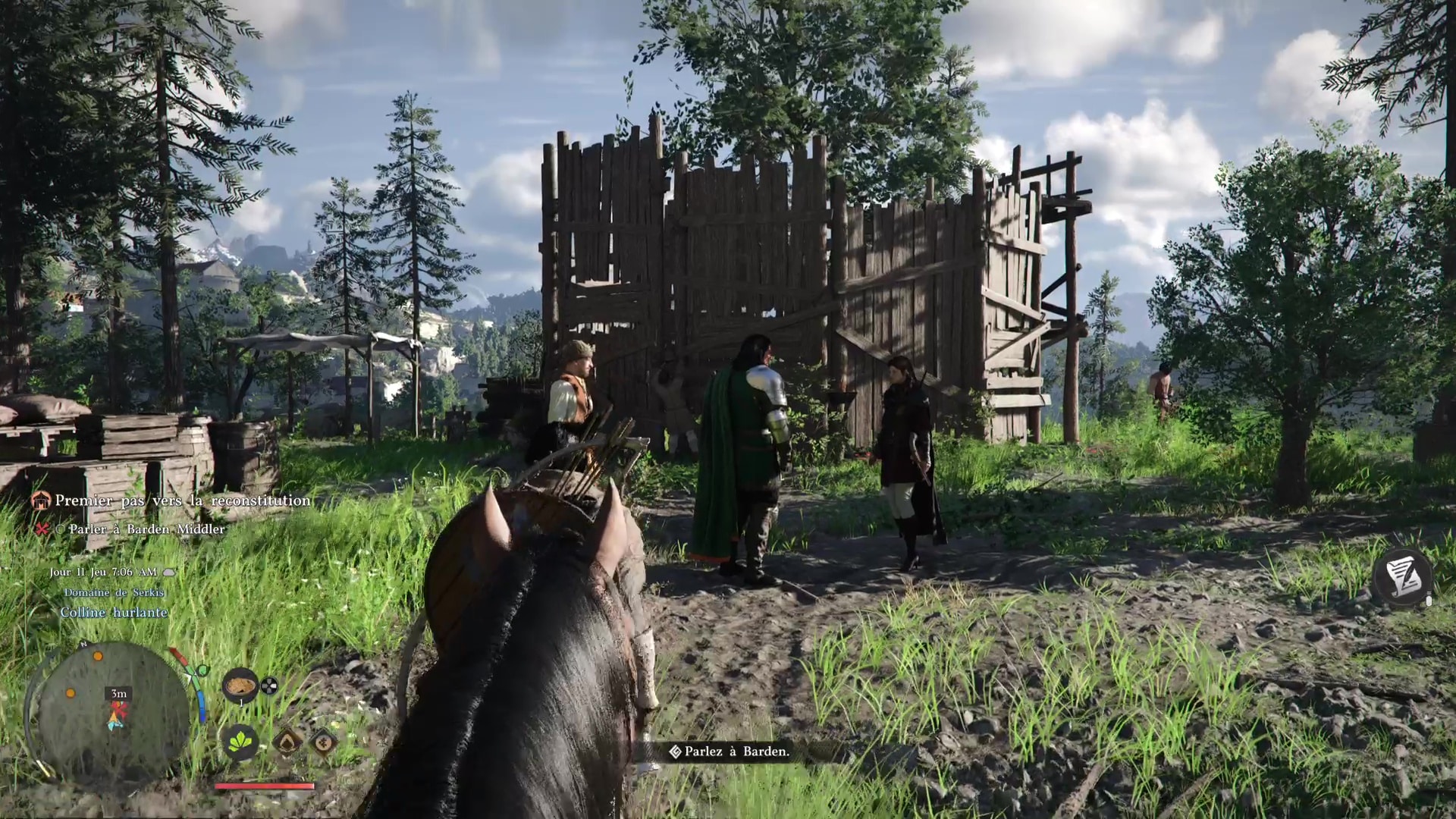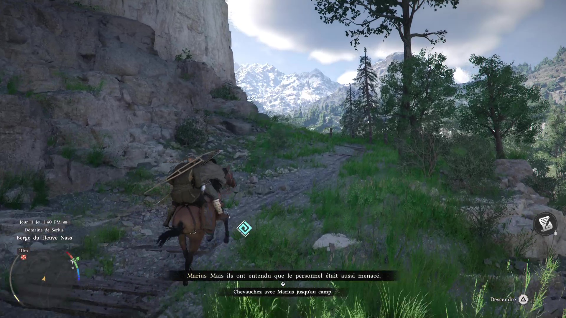 Ce brave Marius, rencontré plus tôt, mérite donc de retrouver son foyer. Mais celui-ci est au sud-ouest de Hernand, à la Décharge. Allez là-bas et parlez-lui pour l’inviter à rejoindre le camp. Vu qu’il est toujours mal en point, il vous demande de l’emmener à cheval.