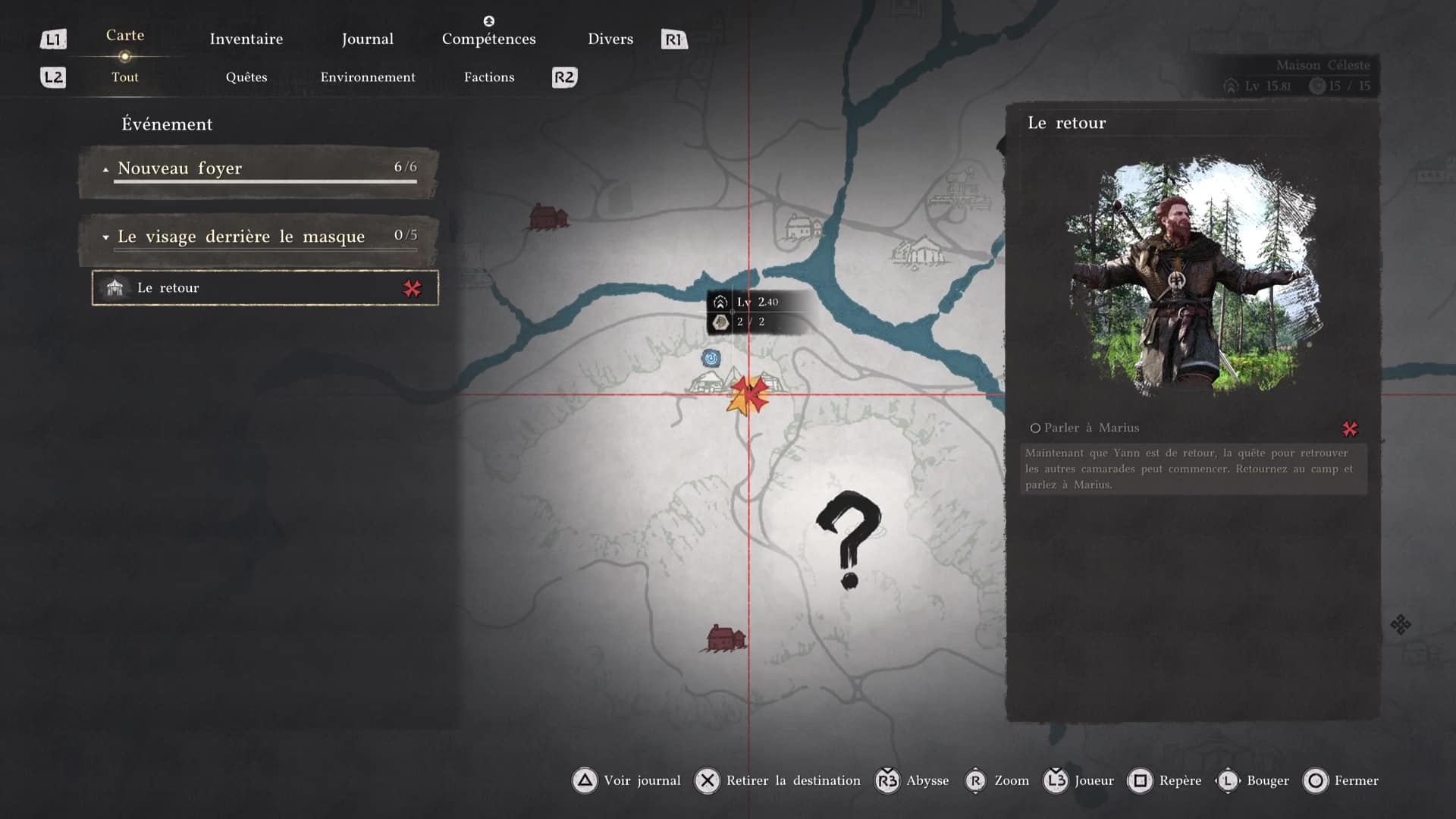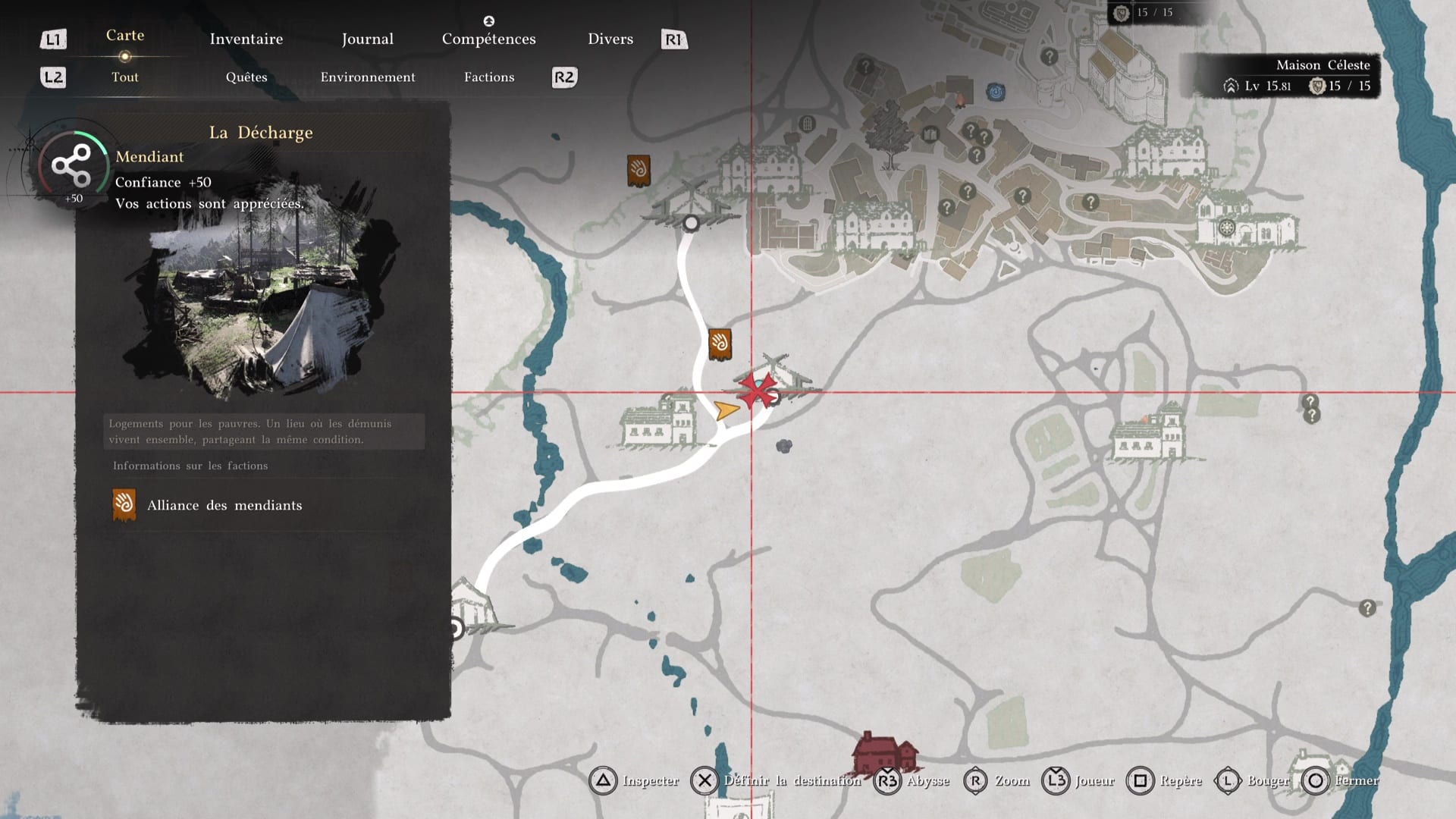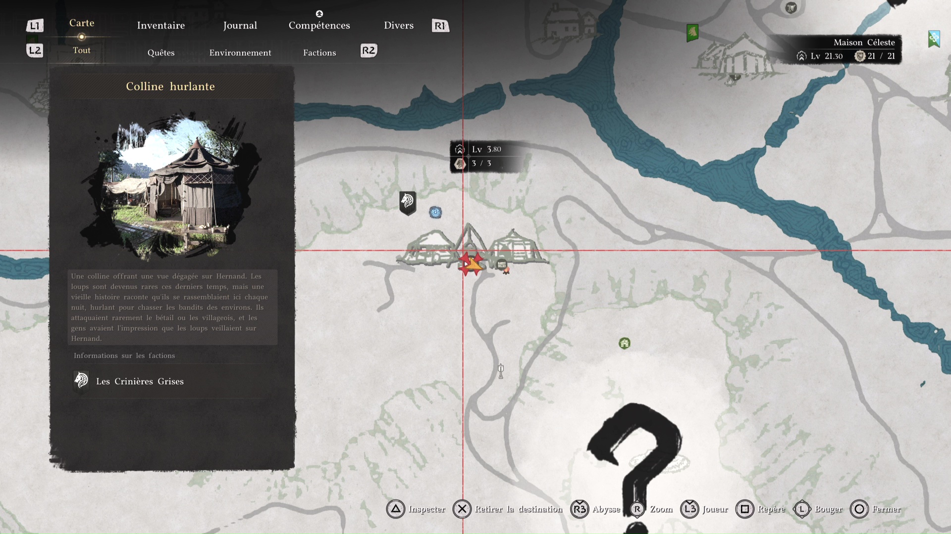 Ce nouvel objectif consiste justement à tester cette fonctionnalité. Ouvrez votre map, mettez le curseur en surbrillance sur le camp des Crinières Grises, dans l’onglet « Tout », puis faites « Inspecter en maintenant Triangle/Y.