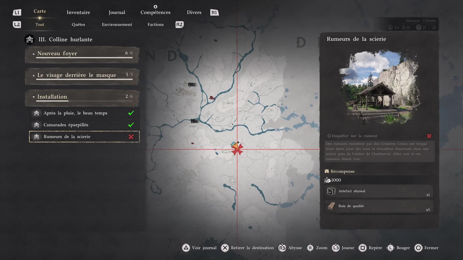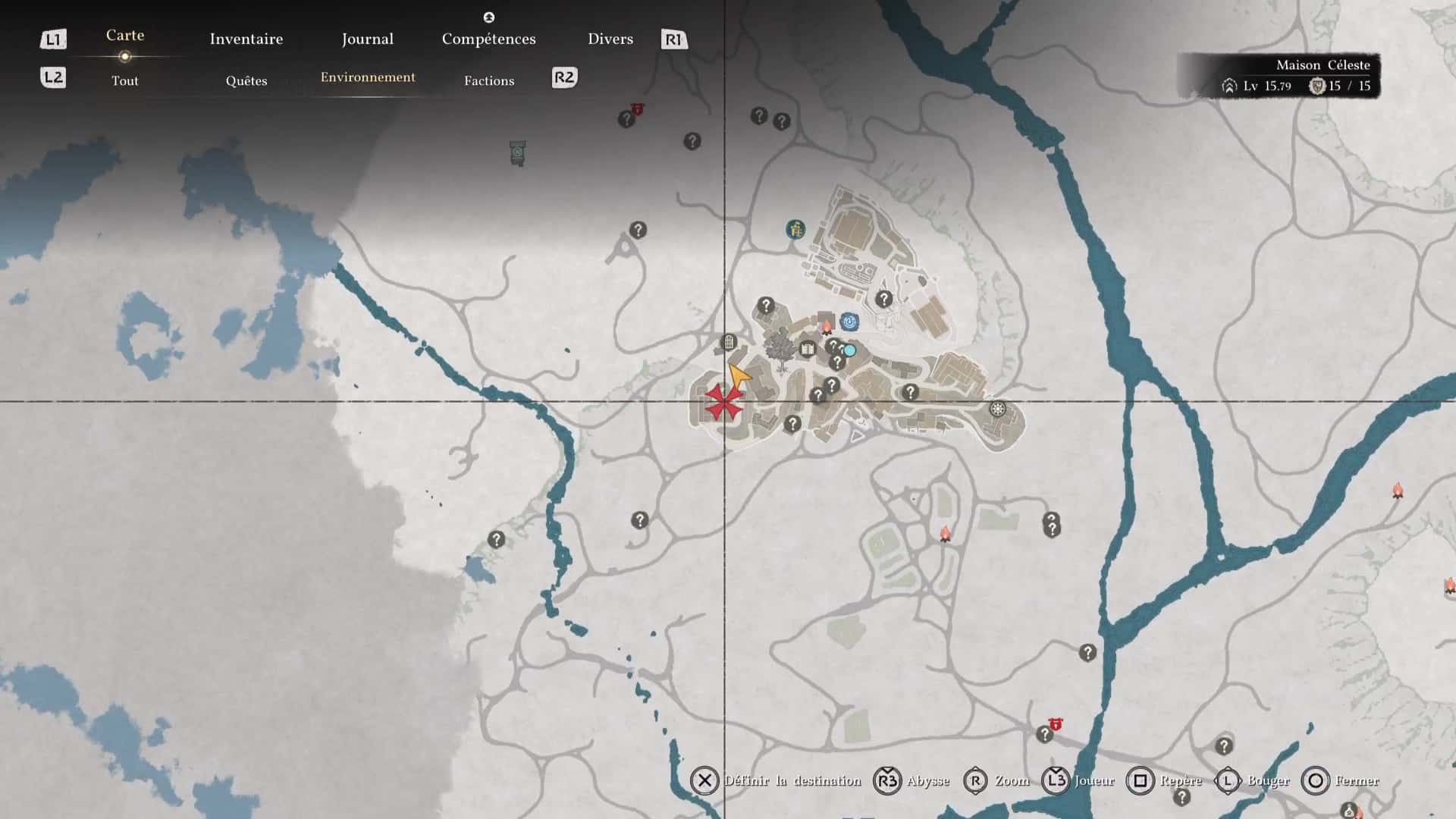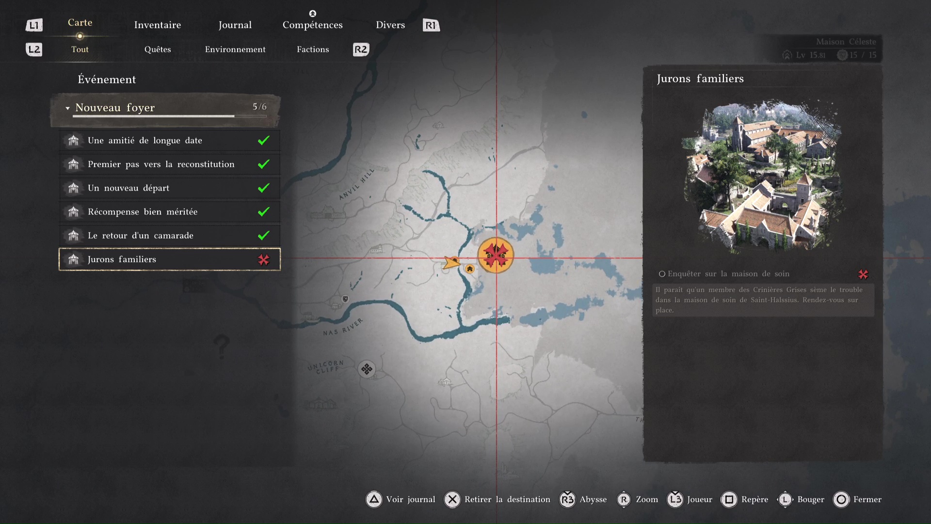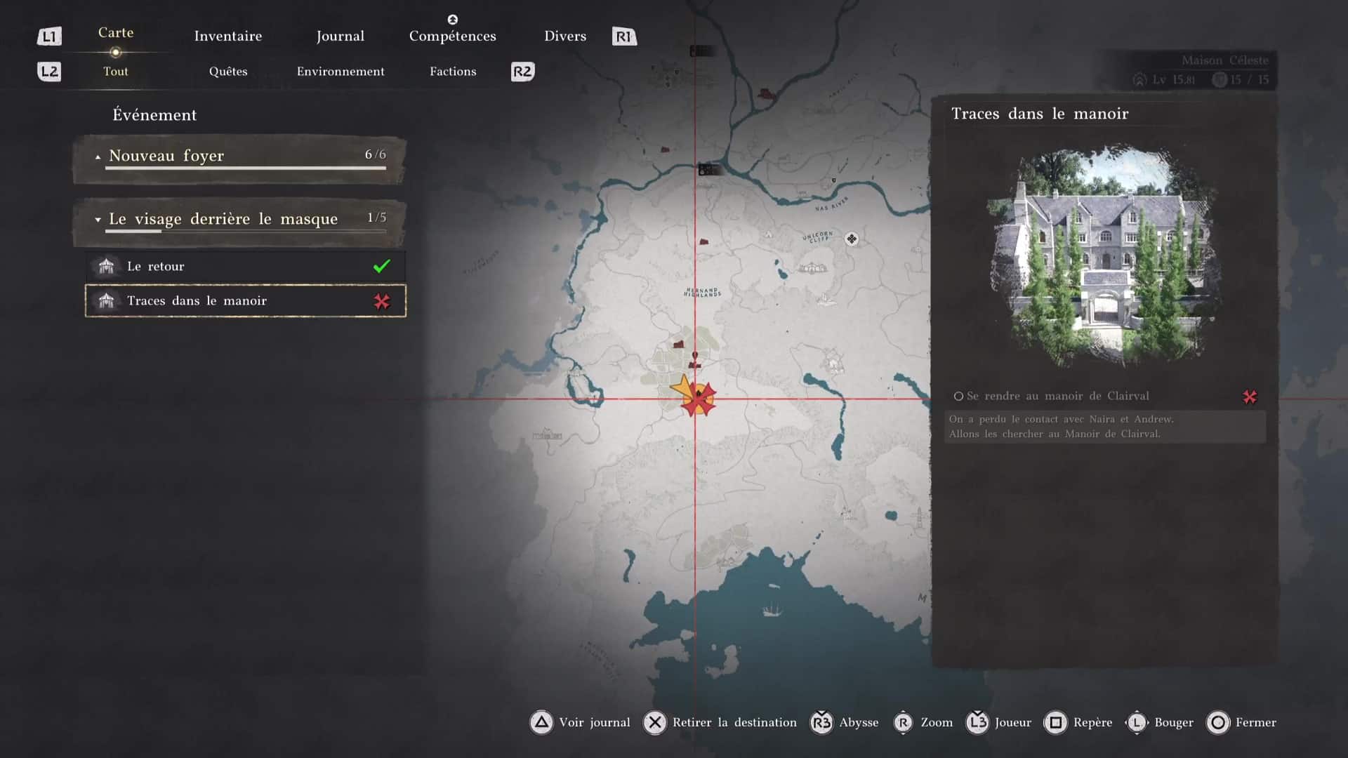 Ce nouvel objectif consiste justement à tester cette fonctionnalité. Ouvrez votre map, mettez le curseur en surbrillance sur le camp des Crinières Grises, dans l’onglet « Tout », puis faites « Inspecter en maintenant Triangle/Y.