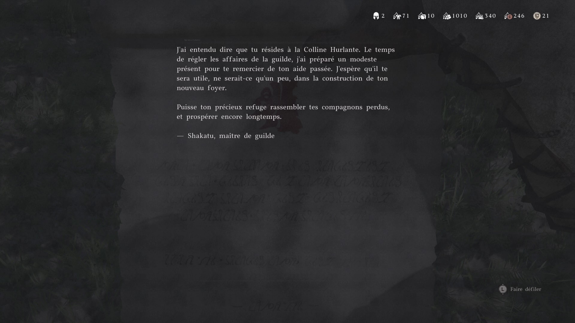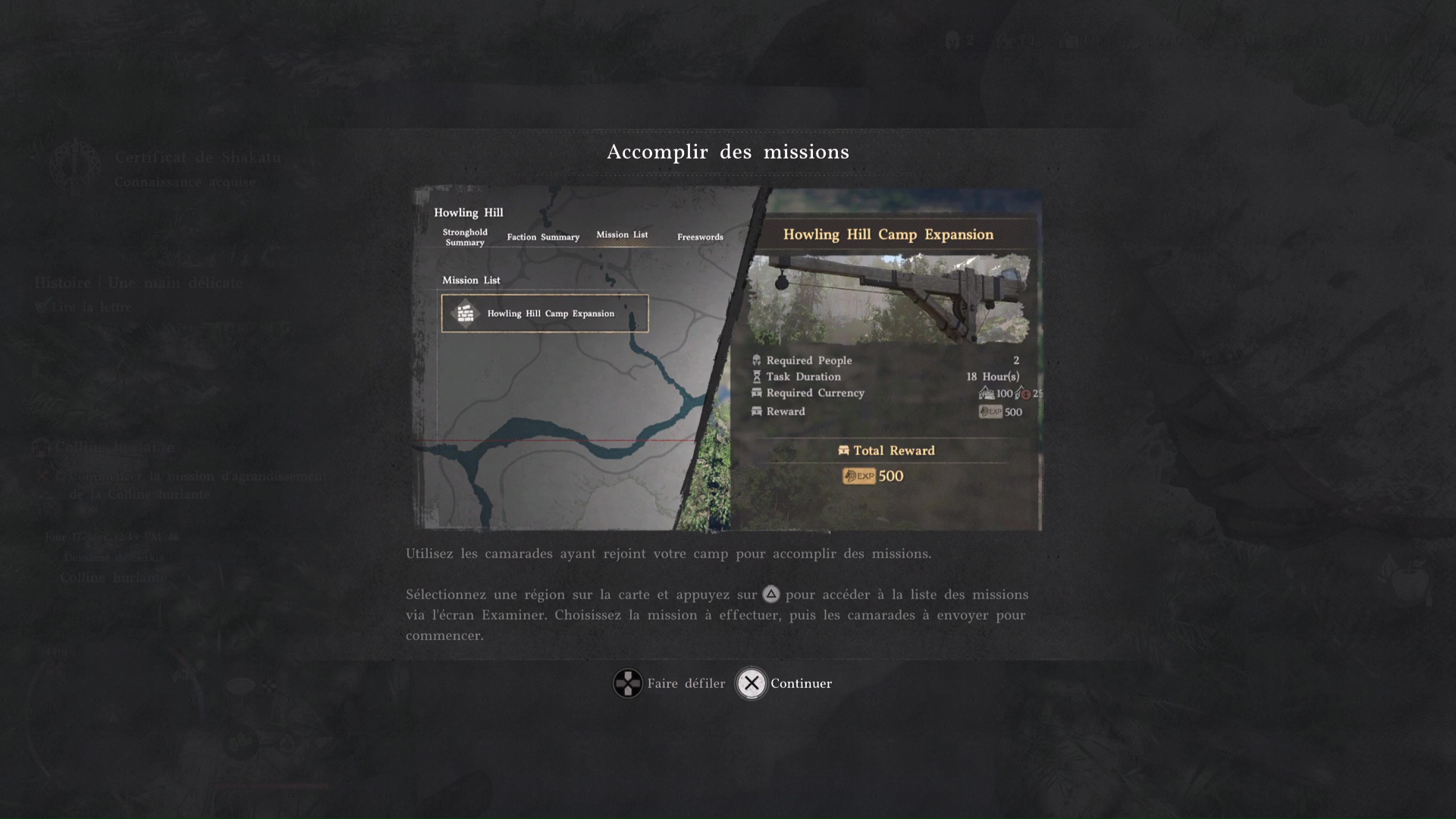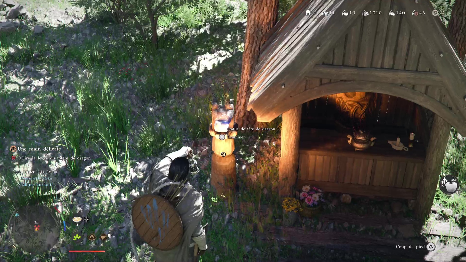 De retour au camp, allez près de l’espèce de petit sanctuaire isolé et examinez le totem de dragon. Vous obtiendrez la lettre de Shakatu. Allez dans votre inventaire et lisez-la. Il s’agit en réalité du tutoriel vous expliquant le système de missions. Vous pouvez en effet attribuer des camarades pour des missions visant à rapporter des ressources au camp.