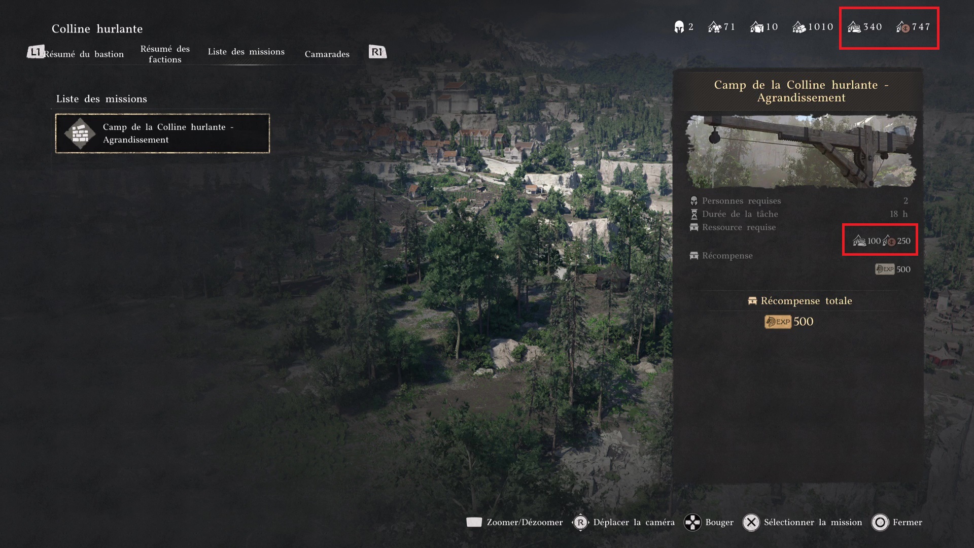 Vous arrivez dans un menu qui montre une vue aérienne du camp. Allez dans l’onglet « Liste des missions », sélectionnez Luke avec Croix/A puis faites de même avec Ronald. Lorsque les deux seront sélectionnés, appuyez sur Carré/X pour lancer leur déploiement sur la mission « Camp de la Colline hurlante – Agrandissement ».