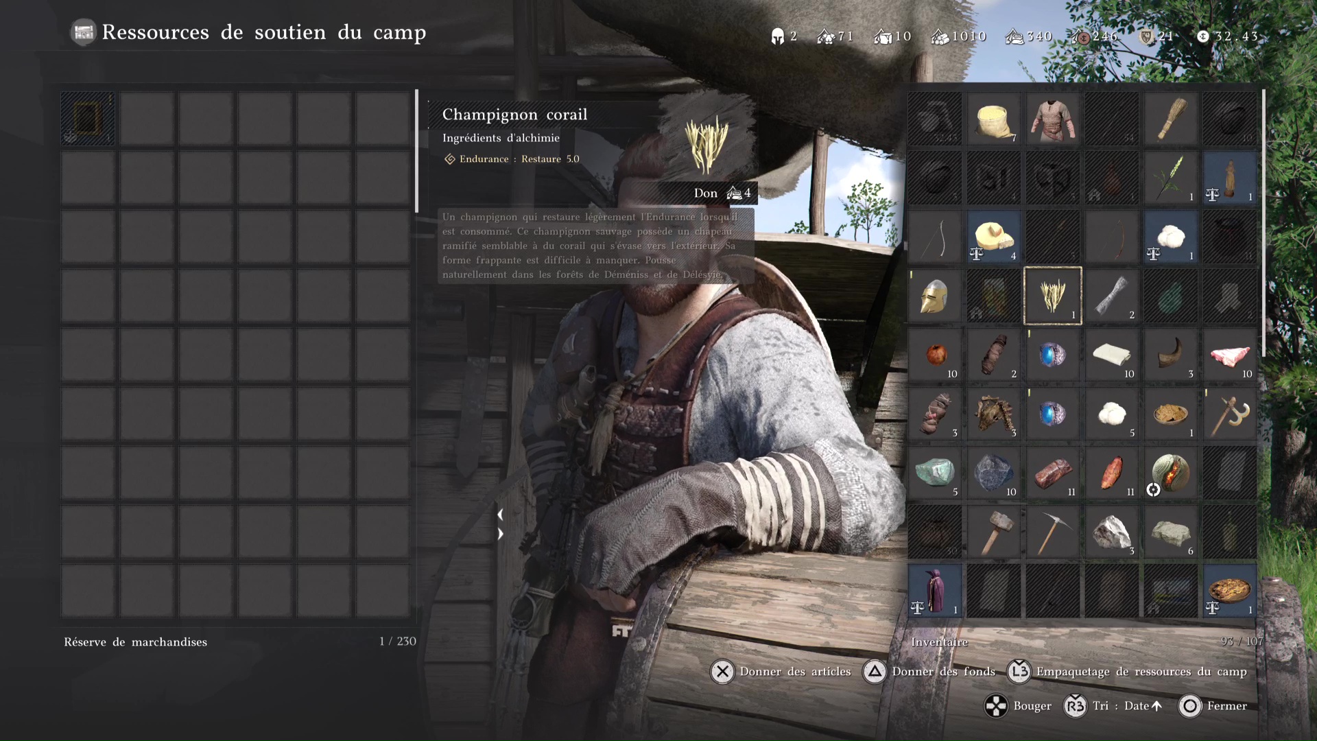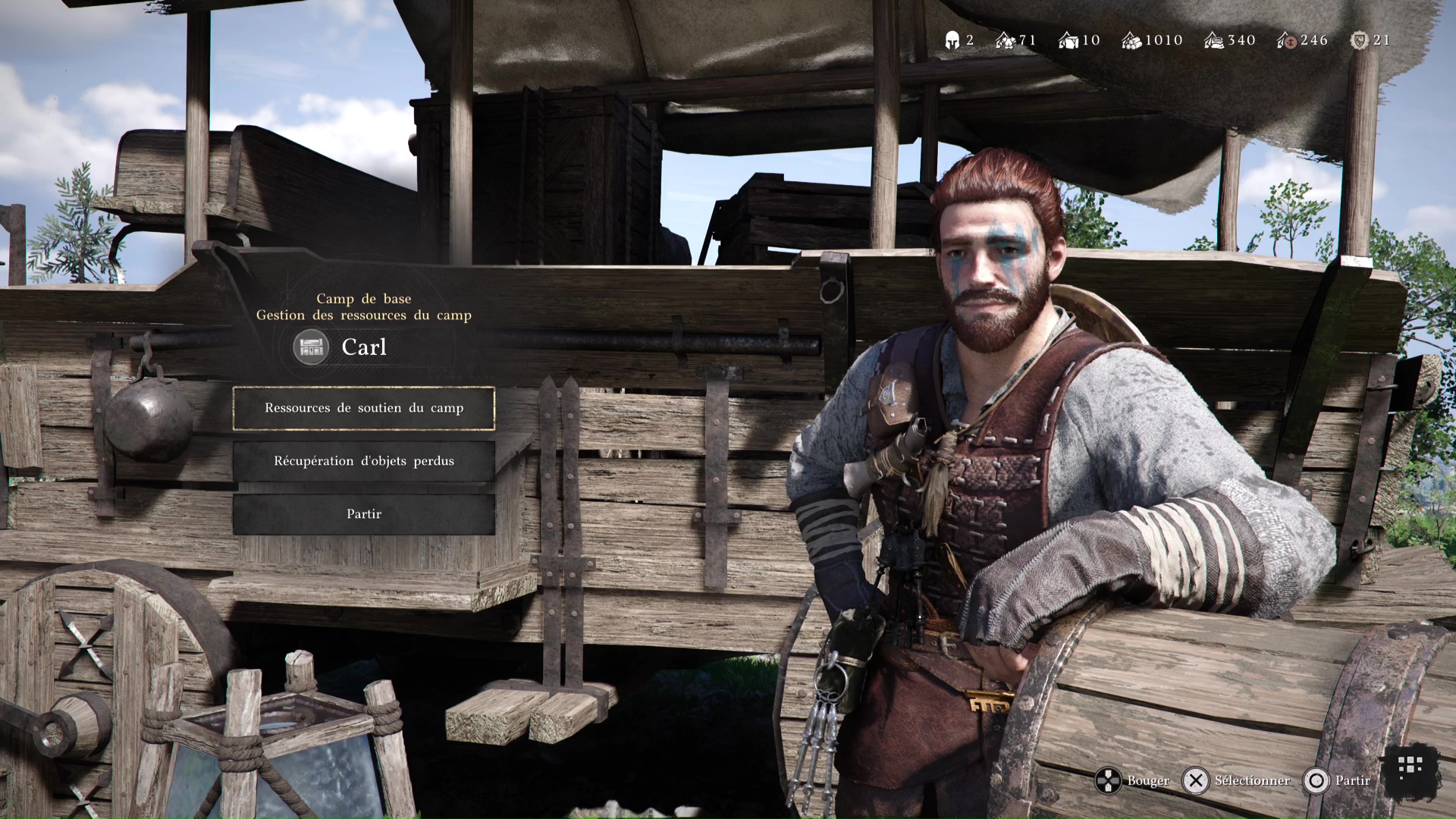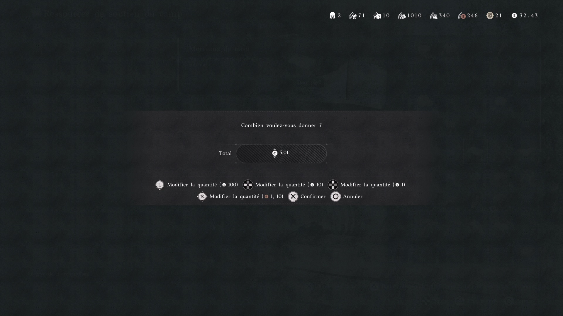 Si vous n’avez pas assez, allez voir Carl et, dans « Ressources de soutien au camp », donnez-lui les éléments qui correspondent au type de montant à augmenter. Pour ce qui est des ressources financières, faites « Donner des fonds » avec Triangle/Y et définissez le montant de pièces à donner.