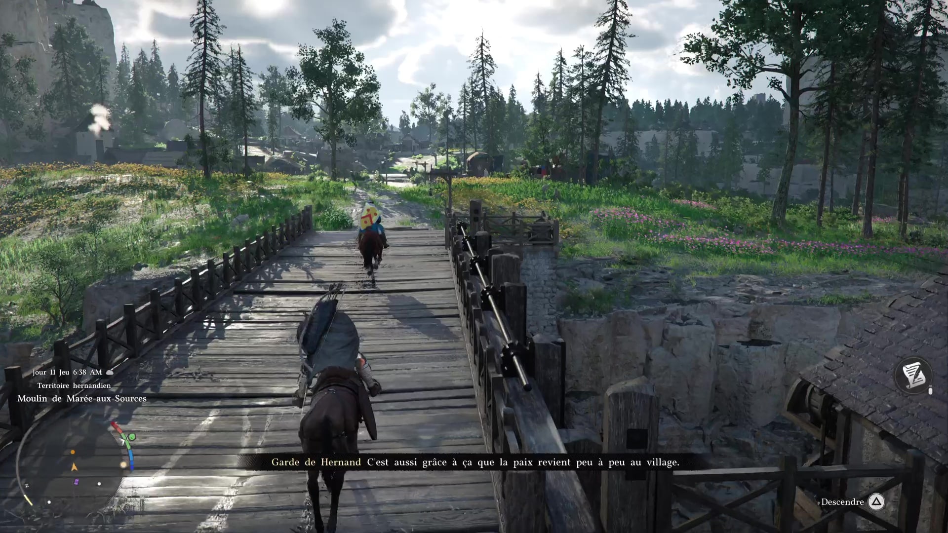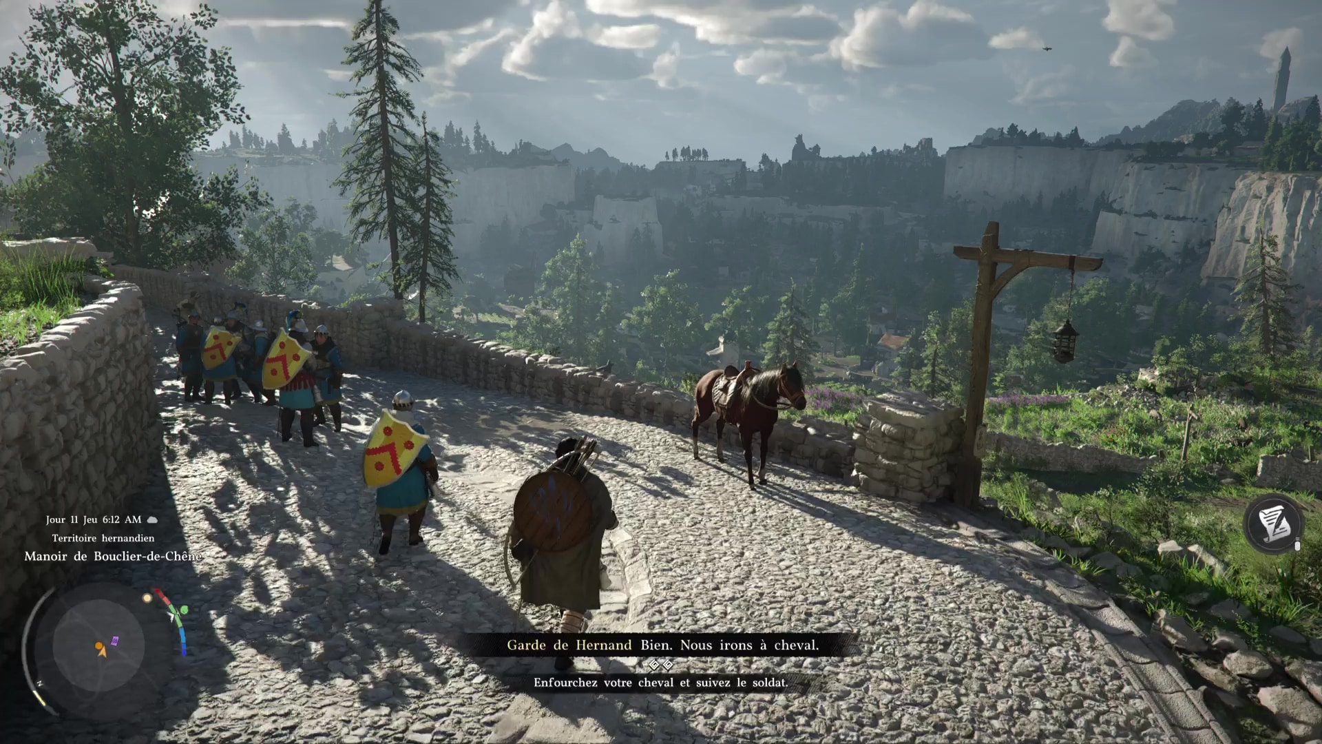 Au bout de la marche, enfourchez votre monture puis chevauchez aux côtés du garde jusqu’à votre nouveau foyer. Avancez et attendez que le garde reparte pour poser pied à terre.