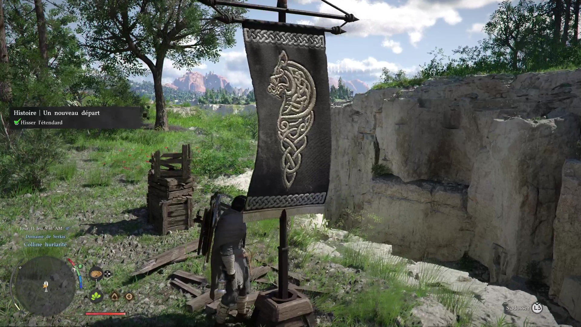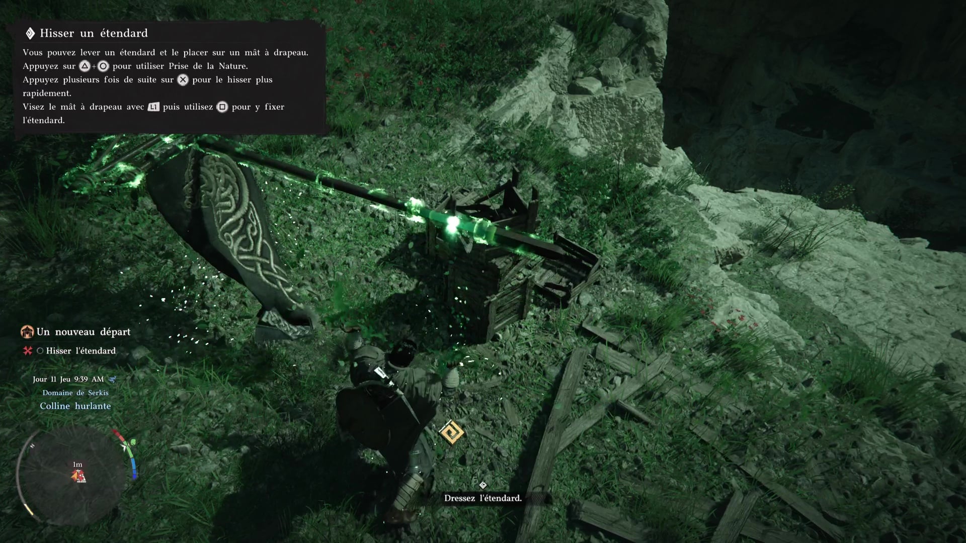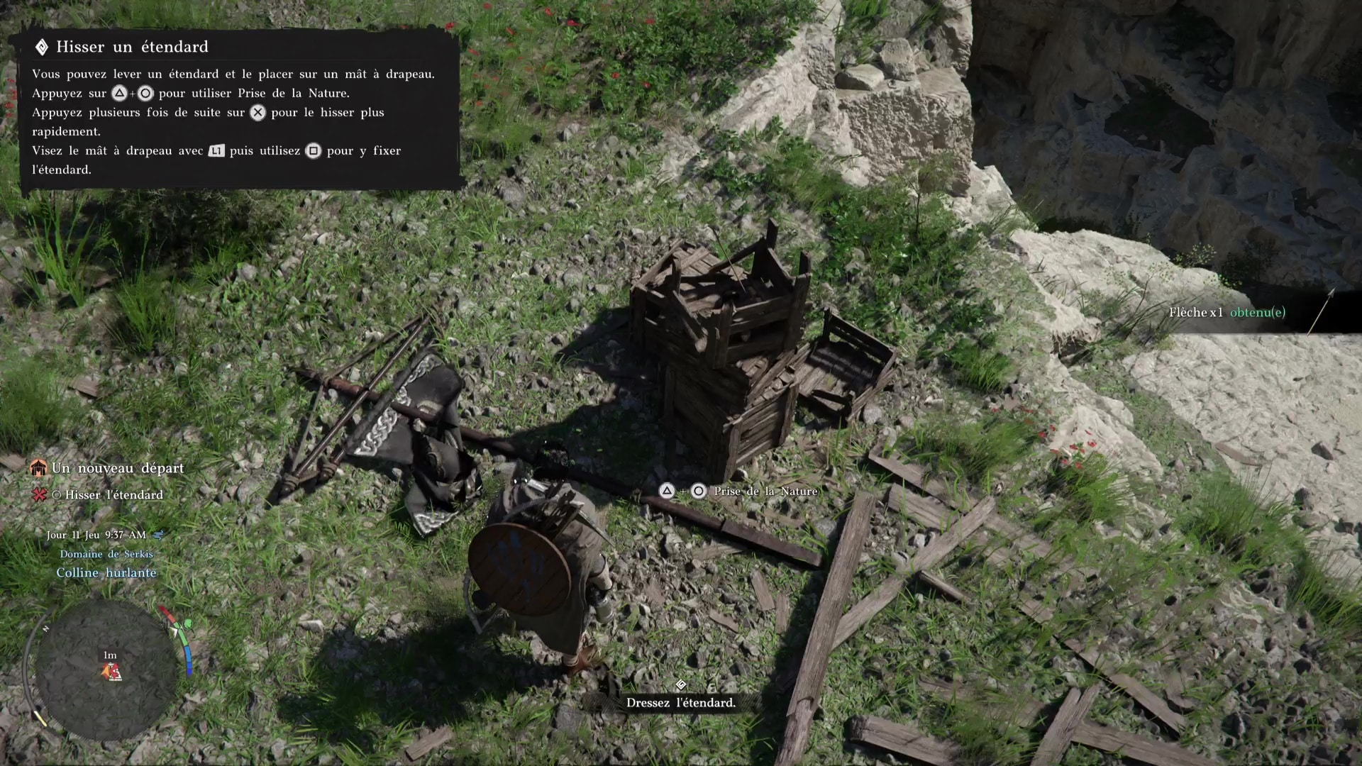 Pour finir cette séquence de manutention, allez vers l’entrée du camp pour dresser l’étendard des Crinières Grises. Devant l’étendard posé au sol, faites une Prise de la nature avec Triangle+Rond/Y+B pour le soulever, puis placez-le dans le mât à drapeau juste à côté avec Carré/X. Voilà, vous avez fini de poser les bases de votre campement des Crinières Grises.