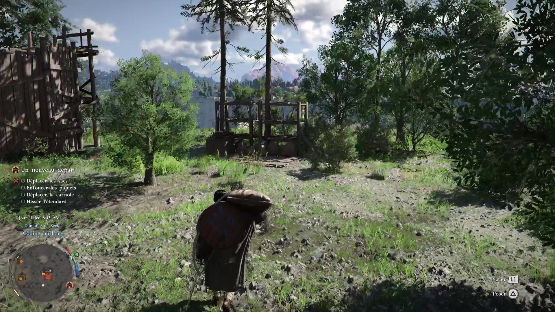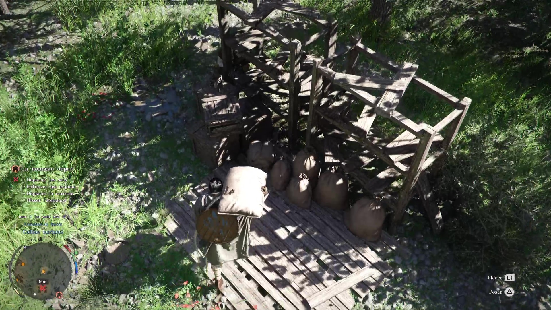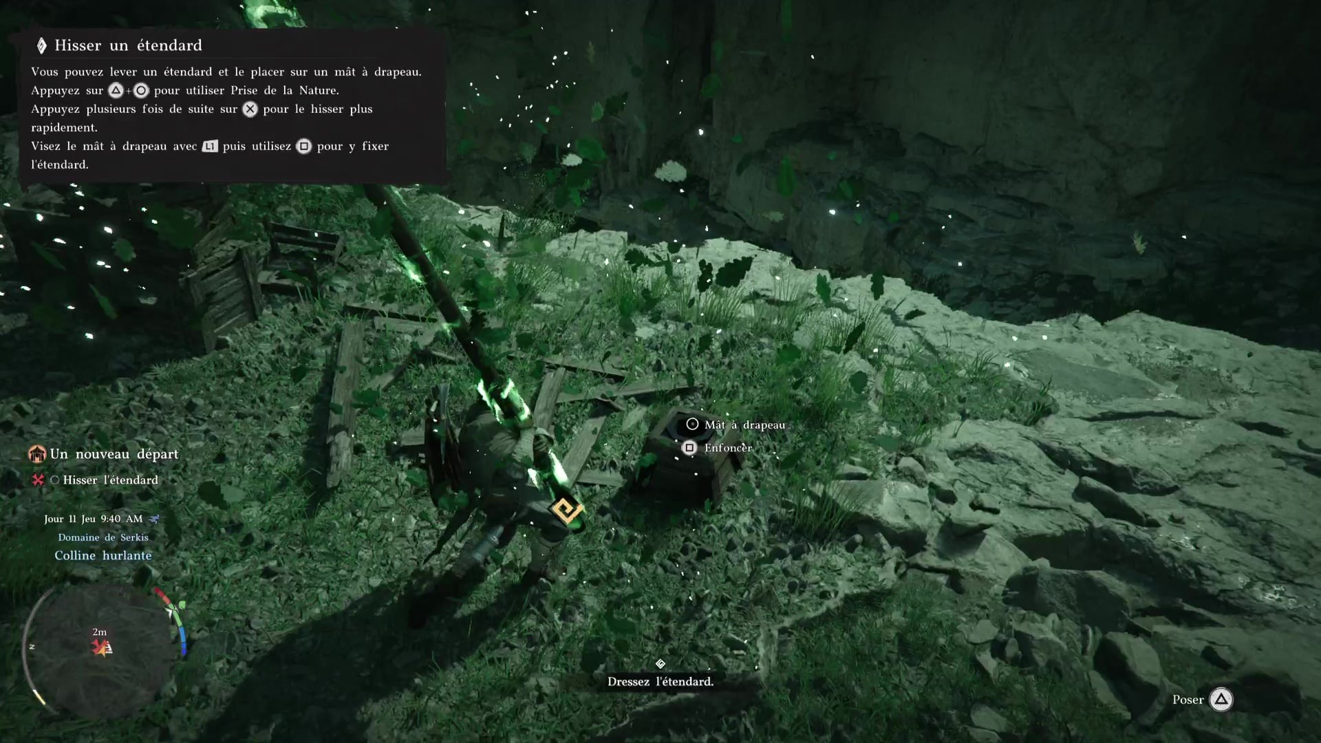Pour finir cette séquence de manutention, allez vers l’entrée du camp pour dresser l’étendard des Crinières Grises. Devant l’étendard posé au sol, faites une Prise de la nature avec Triangle+Rond/Y+B pour le soulever, puis placez-le dans le mât à drapeau juste à côté avec Carré/X. Voilà, vous avez fini de poser les bases de votre campement des Crinières Grises.