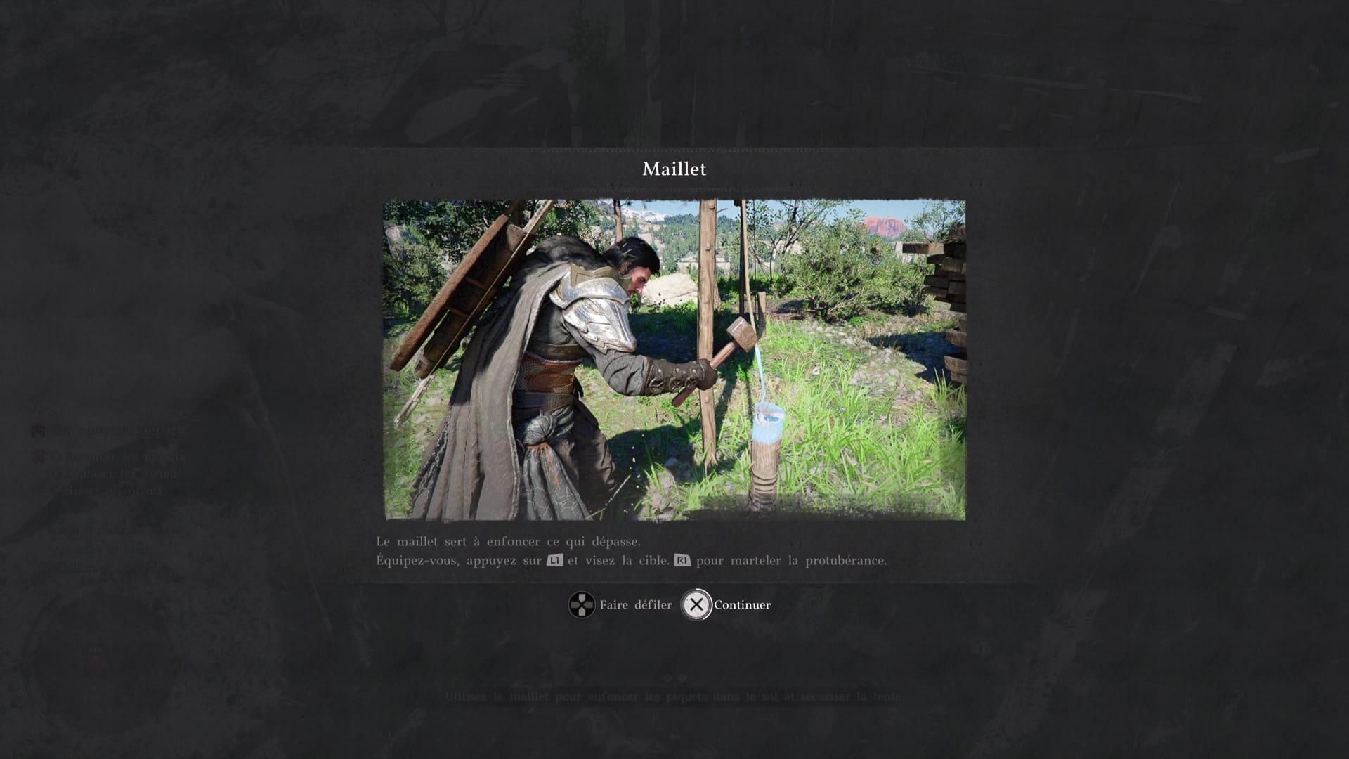 Dirigez-vous ensuite près d’une espèce de tente de fortune. Récupérez un maillet sur la petite table de droite pour vous apprêter à planter des piquets. Pour vous saisir du marteau, ouvrez votre roue d’équipement en maintenant la touche directionnelle de gauche puis allez sur la partie juste à gauche de l’arme principale.