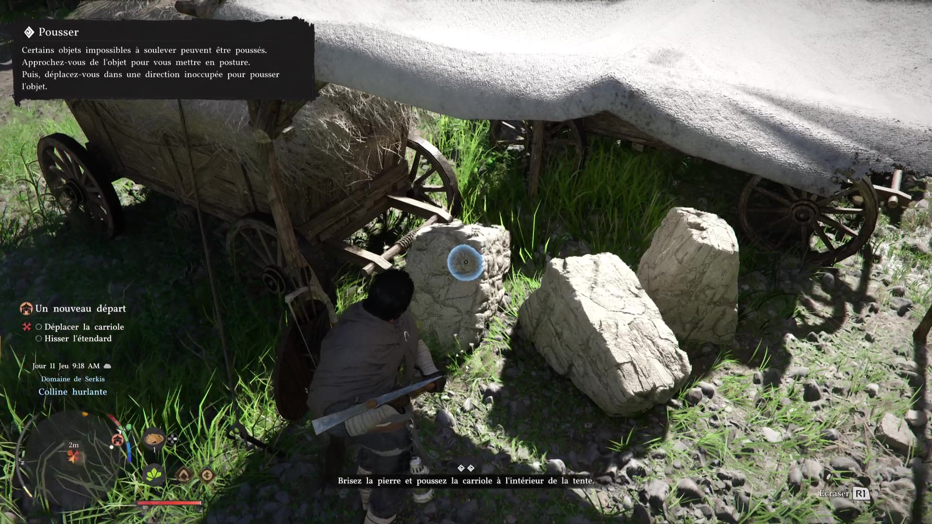 Visez les pierres puis frappez-les pour libérer le passage. Pensez à ramasser les morceaux de pierre (et les morceaux de pierre de qualité) en même temps. Dès que le passage est libéré, poussez la carriole jusqu’à ce qu’elle soit bien sous la toile de tente.