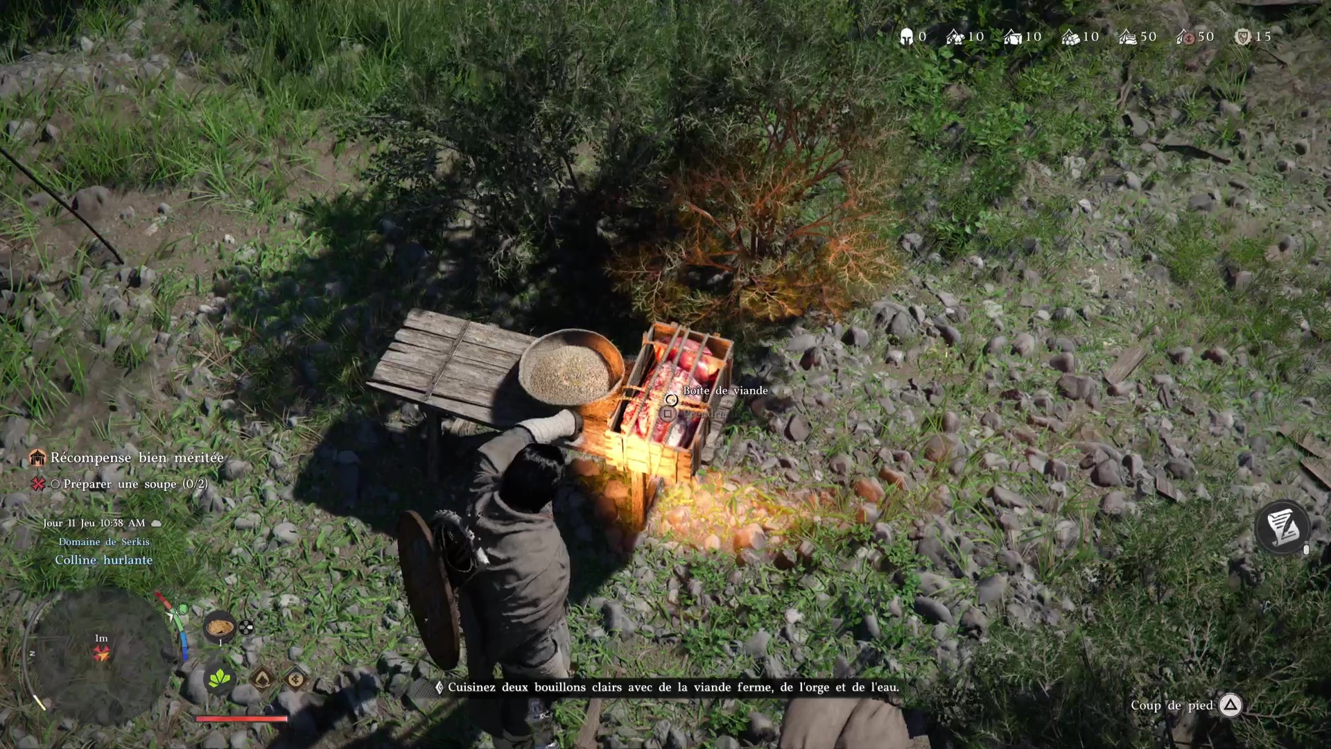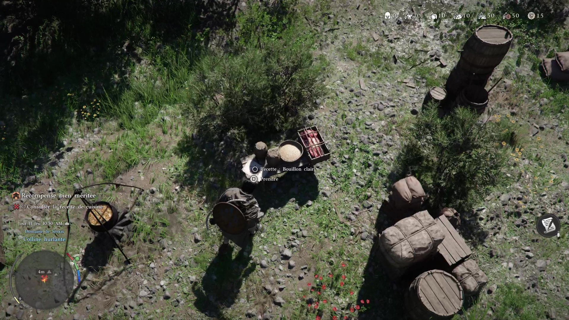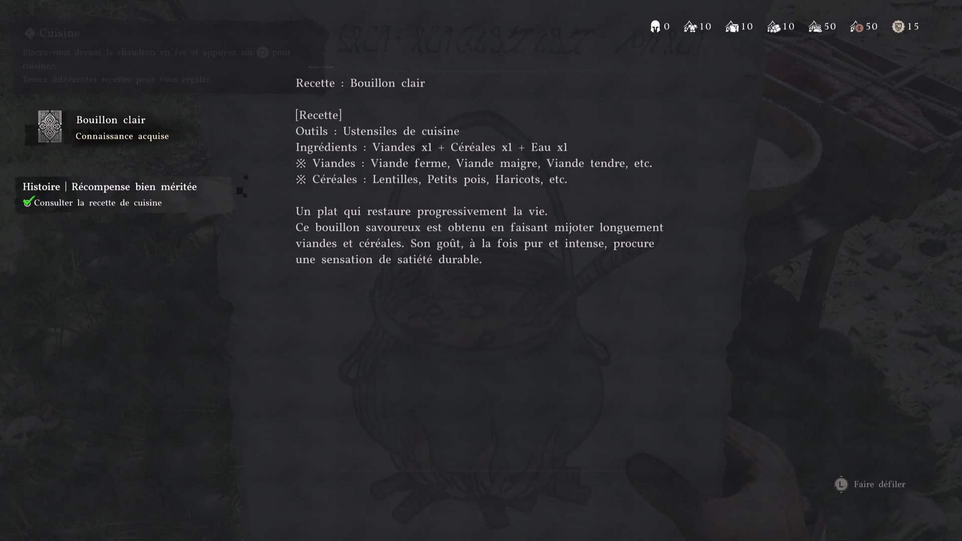 Après l’effort, le réconfort. Dirigez-vous vers la marmite près de la table à manger pour préparer un petit plat. Ramassez d’abord la recette « Bouillon Clair sur une petite table à côté ainsi que tous les ingrédients posés dessus : eau, viande et orge.