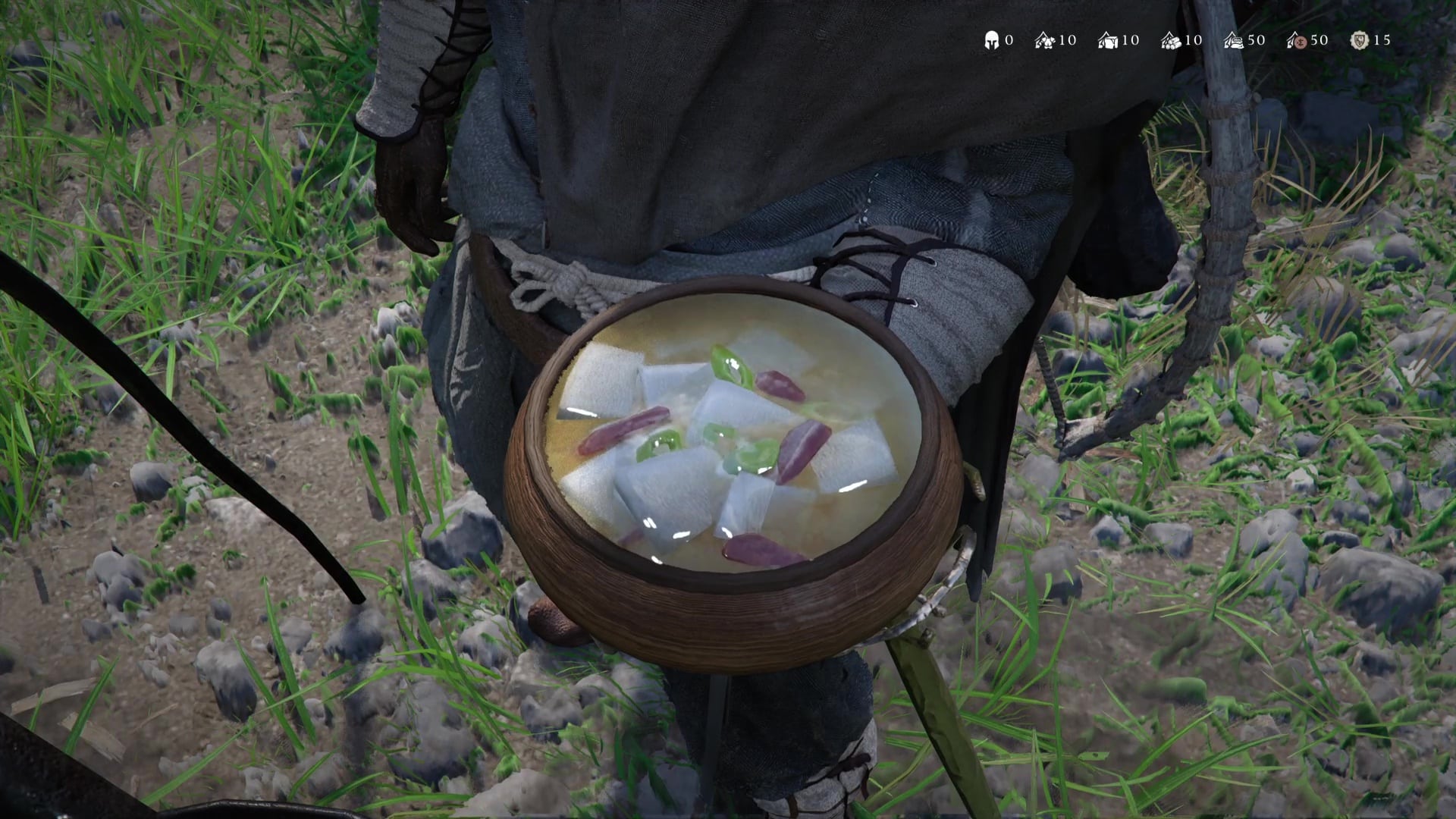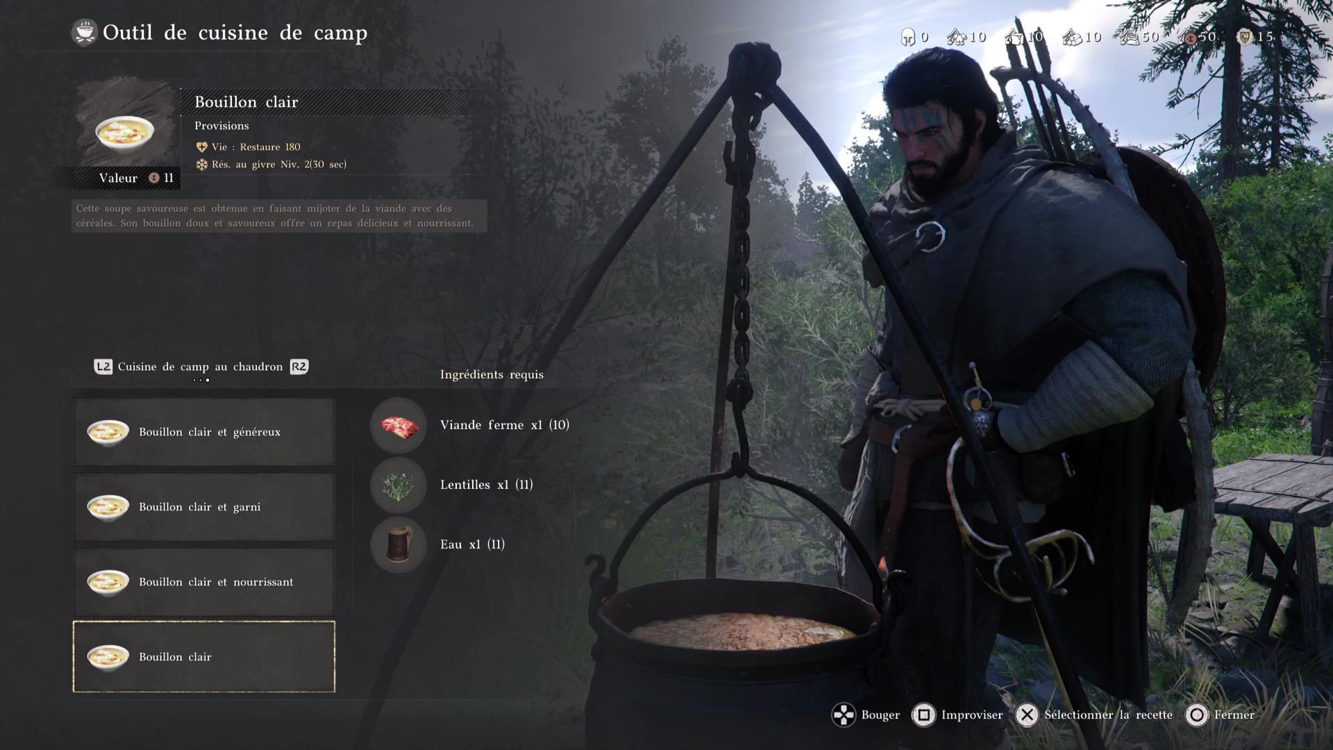 Visez ensuite la marmite pour cuisiner. Allez dans « Cuisine de camp au chaudron », et préparez du bouillon clair. Peu importe la variante, le principal est que vous cuisiniez deux soupes. Allez ensuite à table pour partager le repas.