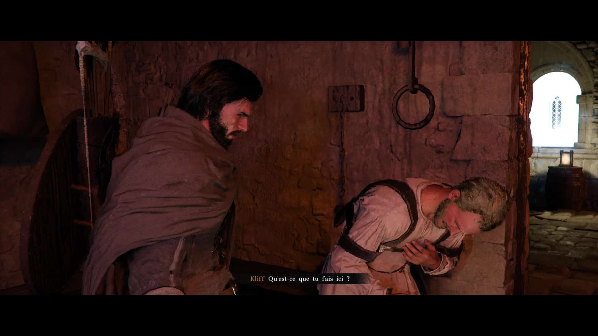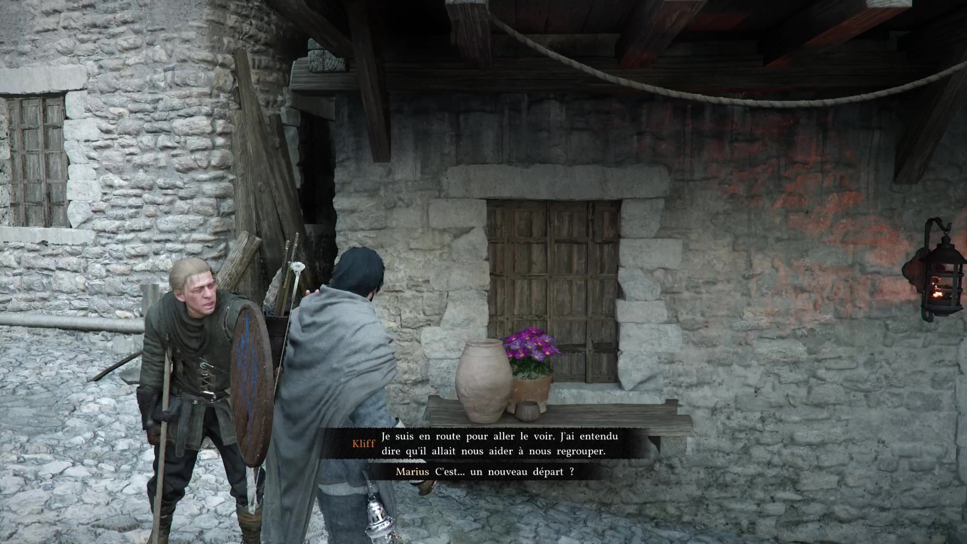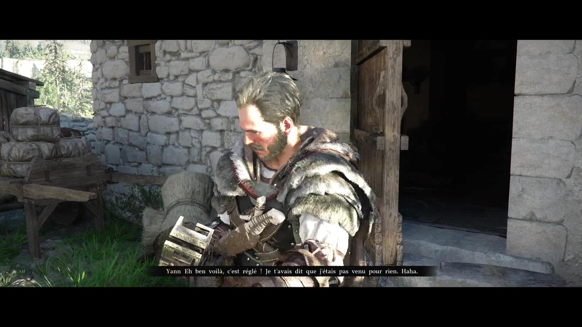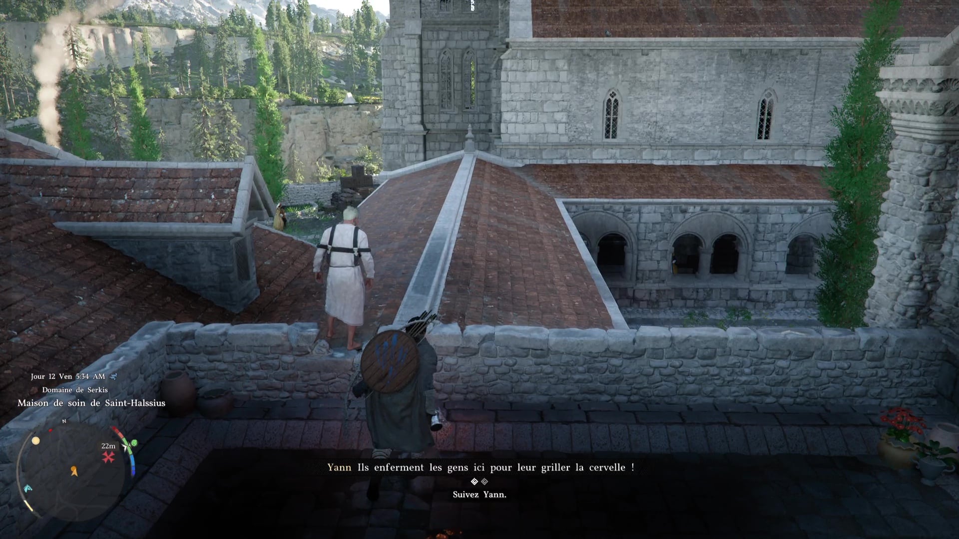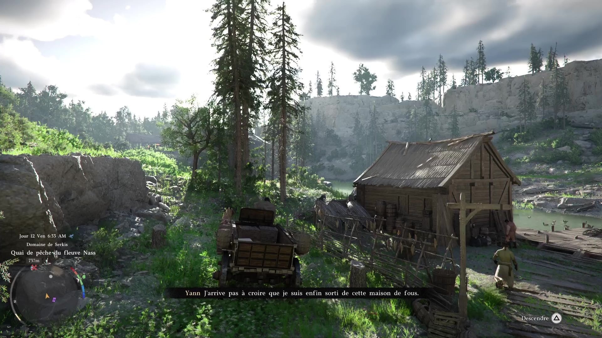 Fuyez ensemble par les toits et continuez de suivre Yann jusqu’à ce qu’il puisse retrouver ses affaires. Quittez ensuite la maison de soins en escaladant la murette et montez à bord de la carriole, toujours en compagnie de Yann. Vous discuterez avec lui sur le chemin, pour finalement vous arrêter près d’un coin de pêche.
