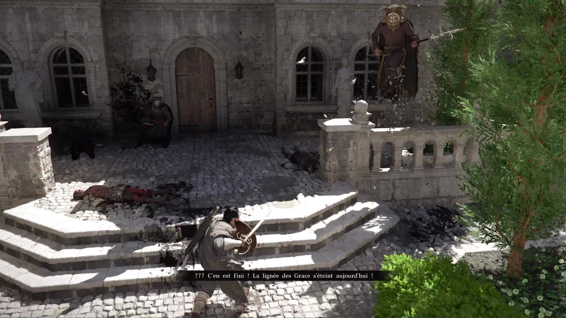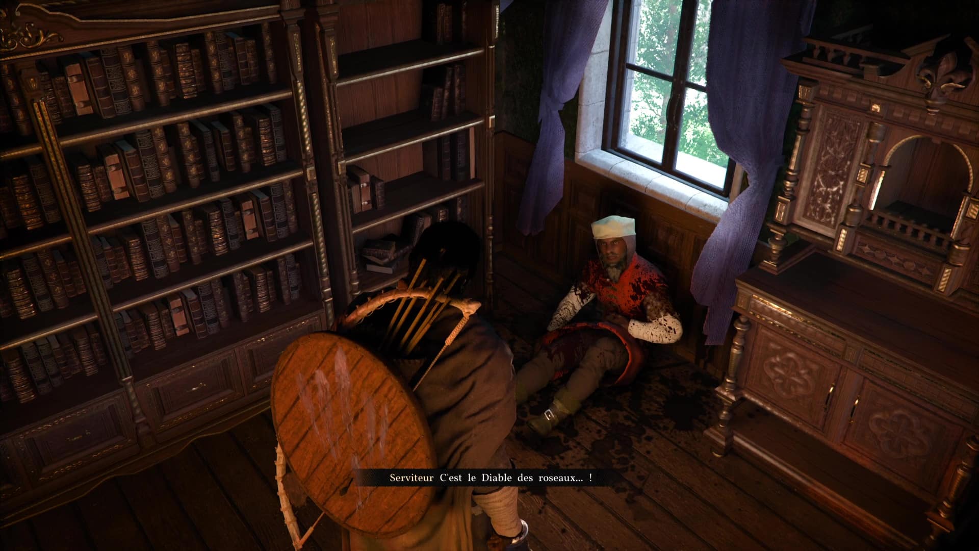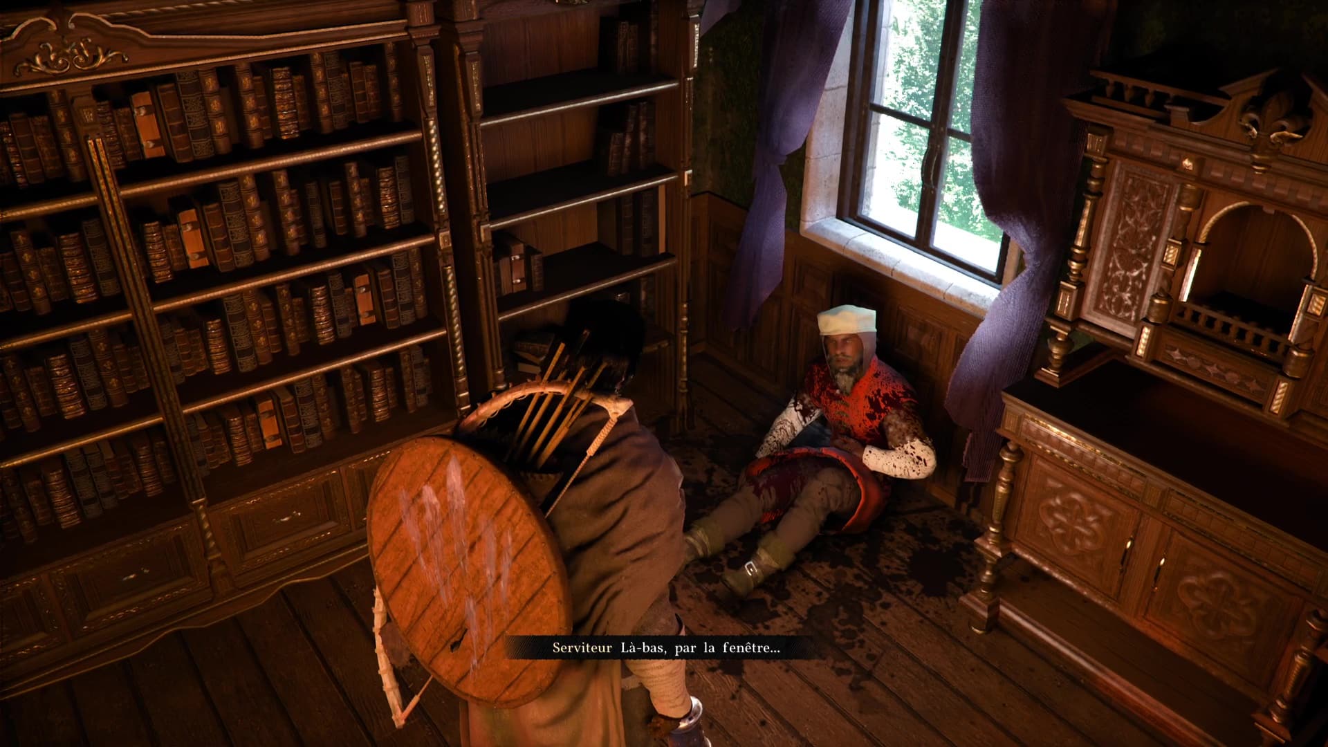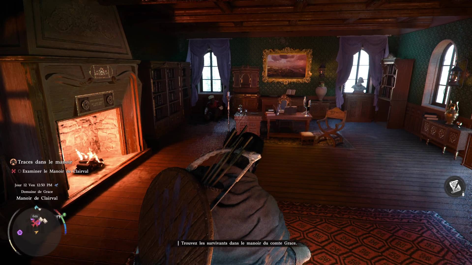Cherchez des survivants, et vous en trouverez un à l’étage, dans la pièce personnelle du comte Grace, avec une grande cheminée. Au fond de la salle, un soldat est assis sous une fenêtre. Parlez-lui pour apprendre que vos amis ont fui par la fenêtre derrière vous.