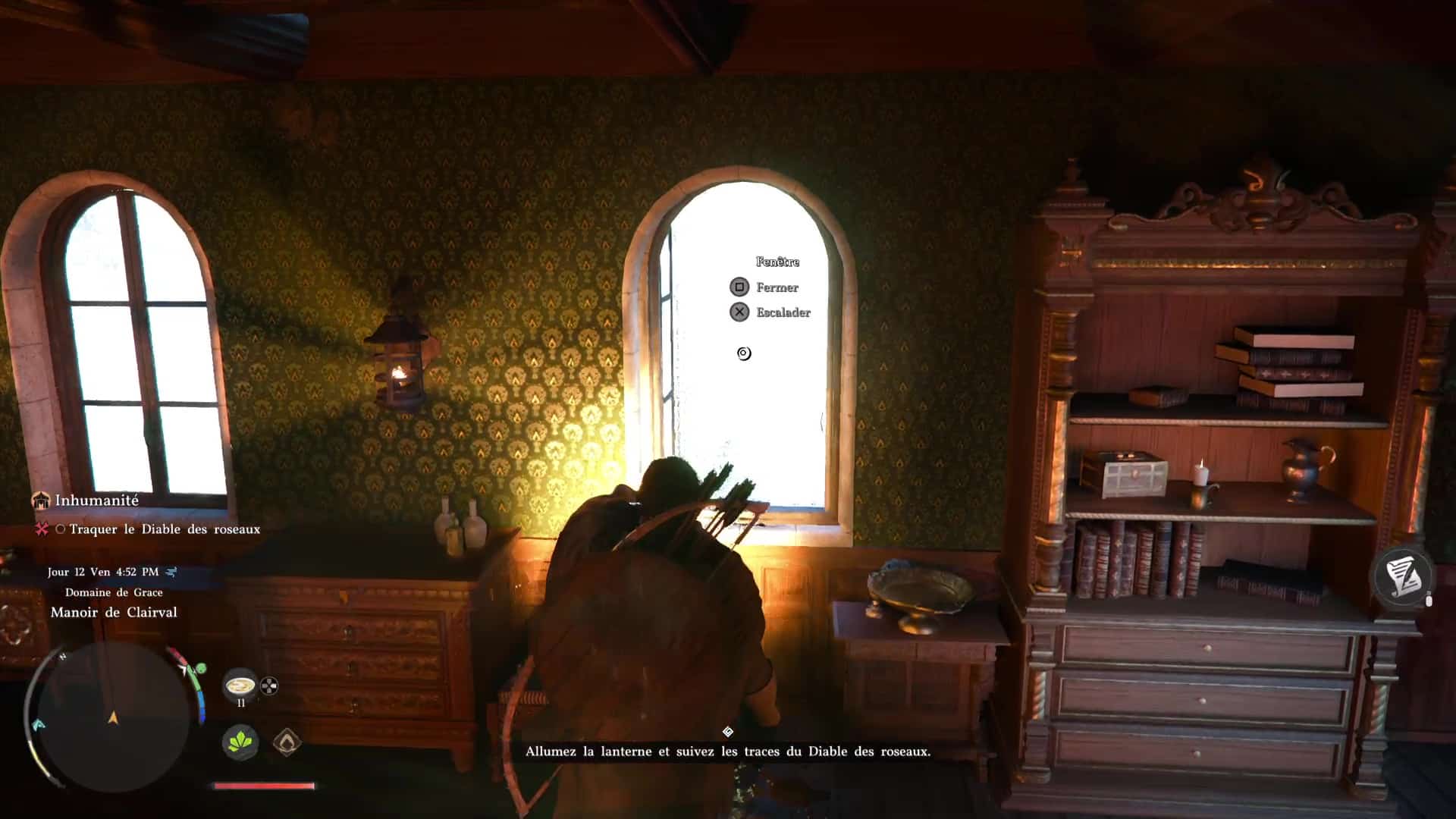 À partir de là, vous pouvez sortir votre lanterne pour que se dessine une trace jaune, désignant le chemin à suivre. Sortez par la fenêtre et suivez cet itinéraire indiqué par la lanterne. Sur le chemin, vous ferez face à des embuscades des sbires du Diable des roseaux.