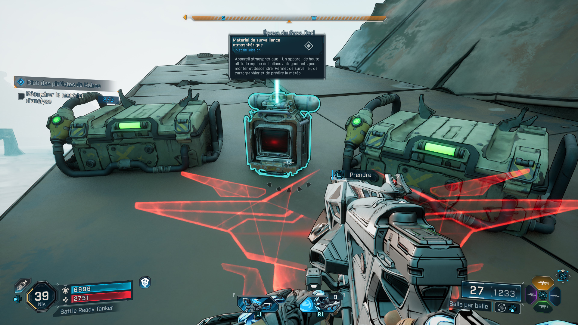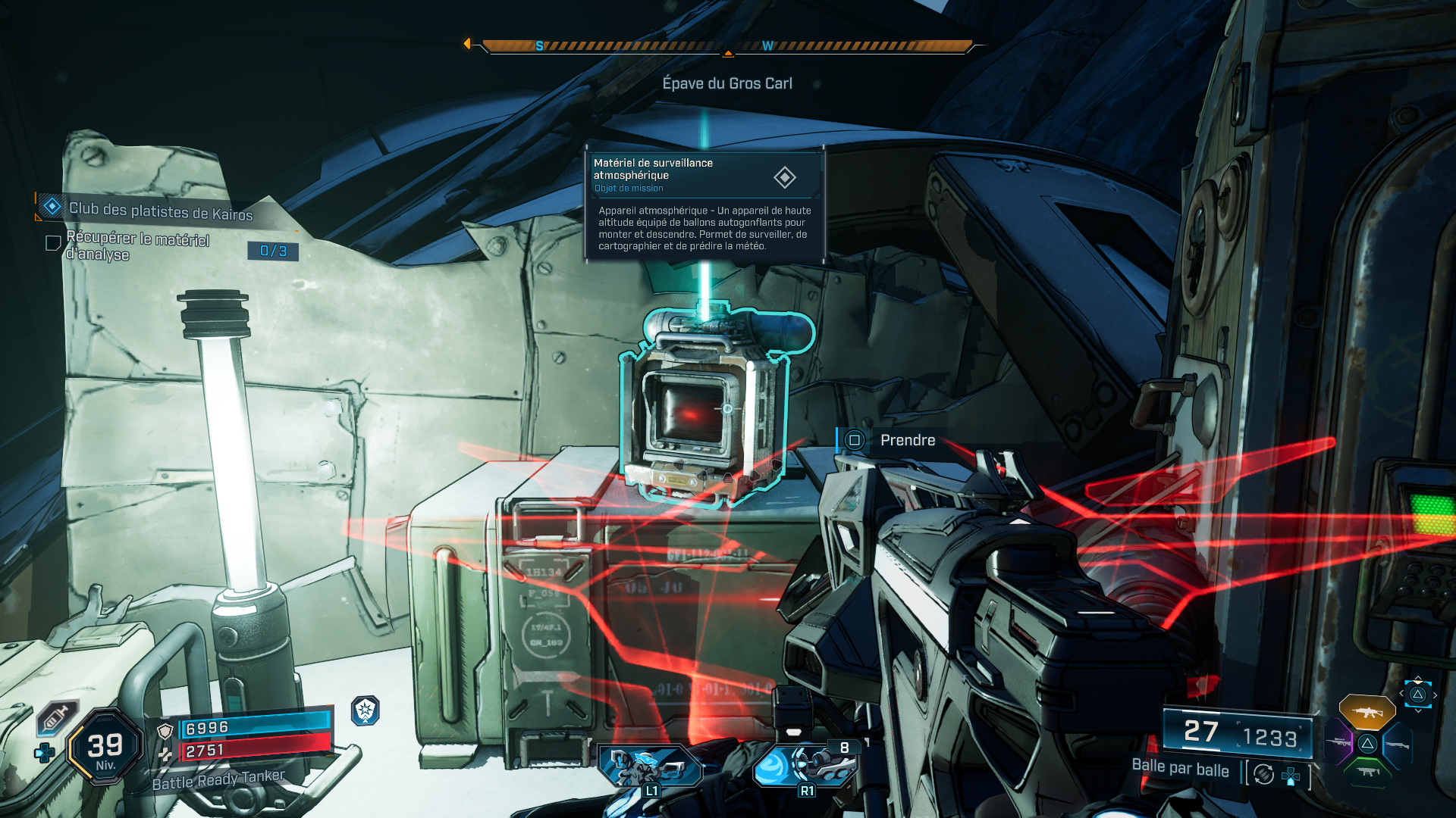 De là, repartez en direction du nord pour rejoindre l’Épave du Gros Carl, là où vous attendent de nombreux ennemis dont il faudra vous défaire si vous voulez mettre la main sur le matériel d’analyse. Jetez alors un œil vers le nord-ouest de la zone d’objectif pour récupérer une première partie du matériel de surveillance atmosphérique, tandis que la deuxième se trouve dans le bâtiment en ruines juste à côté, vers le nord. De là, grimpez en utilisant le point d’accroche juste au-dessus, et planez en direction du sud-ouest pour atterrir sur le toit de l’épave et prendre la dernière partie du matériel, juste entre deux caisses de munitions.