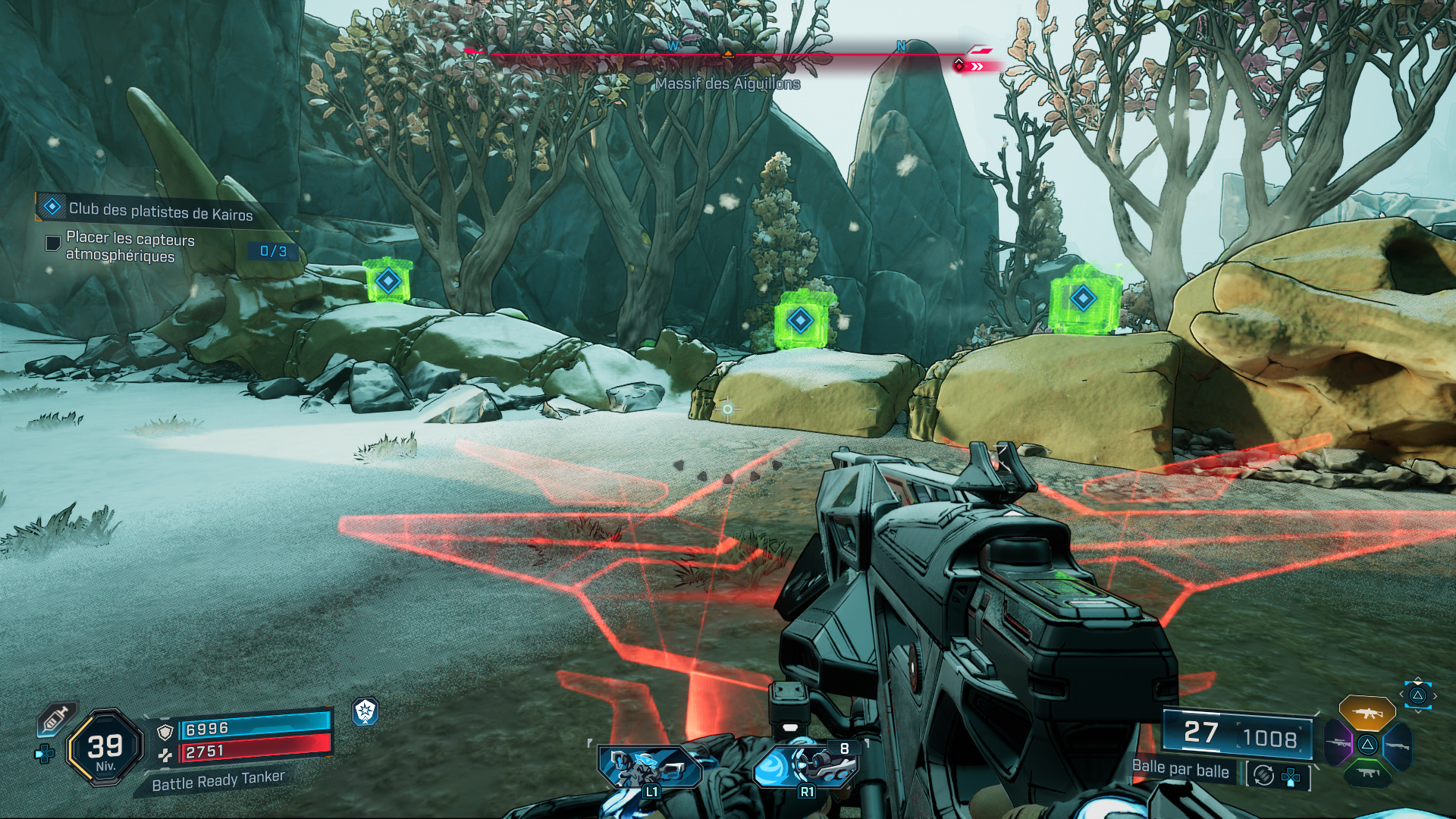 Ce matériel en votre possession, il s’agit désormais de trouver un site de lancement adapté. Pour cela, servez-vous de l’ECHO-localisation pour rejoindre l’endroit marqué par votre boussole au sud-est, où traînent d’ailleurs quelques Atropées. Placez ensuite les capteurs atmosphériques aux endroits indiqués, avant de les pirater, un par un, avec ECHO-4.