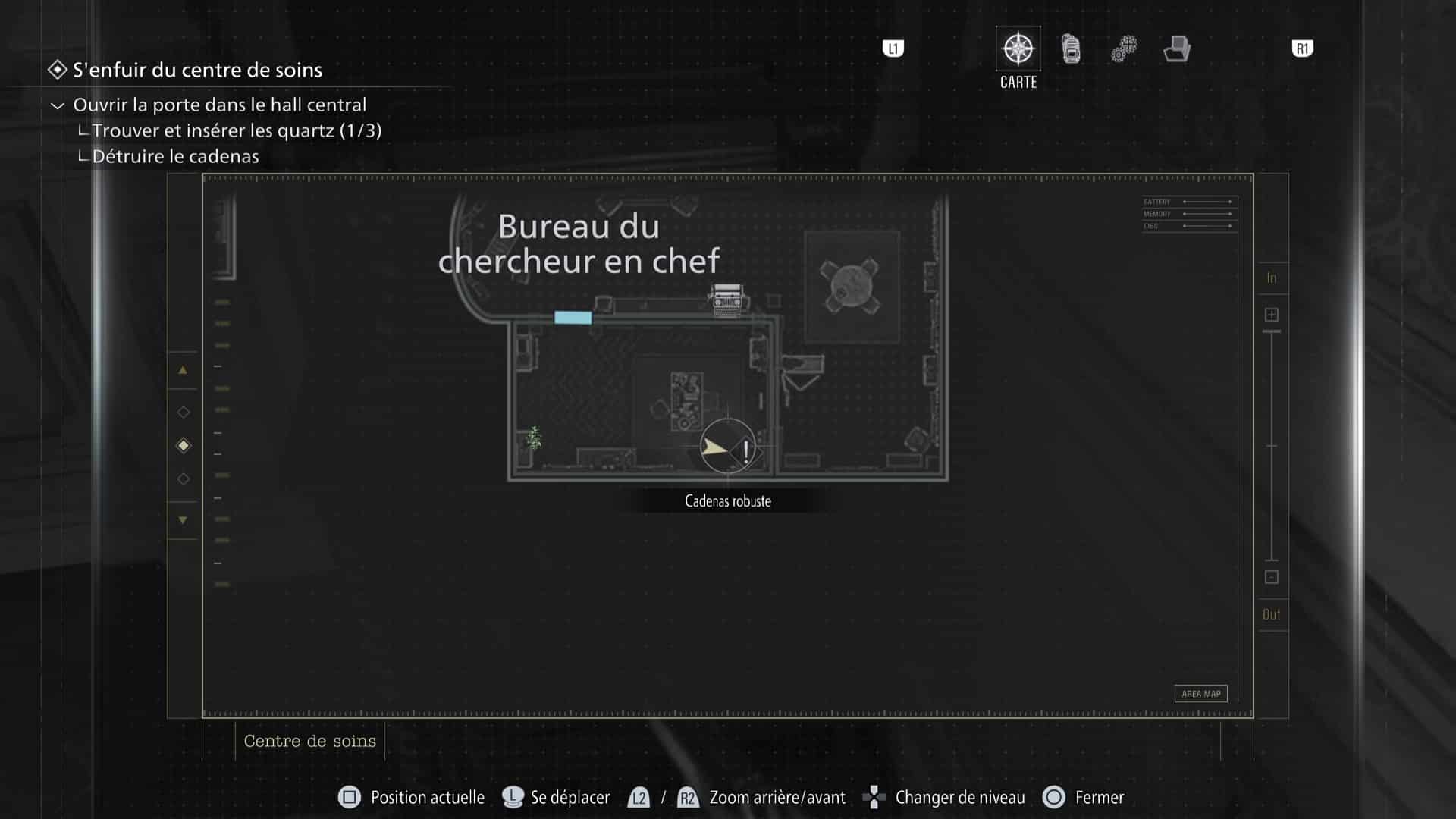 Votre exploration au sein de Resident Evil Requiem va donc finir par vous mener dans le Bureau du chercheur en chef, au 1ᵉʳ étage de l’aile est. Oui mais voilà, n’espérez même pas ouvrir le meuble à combinaison situé dans un coin de la pièce, car un cadenas robuste vous en empêche.