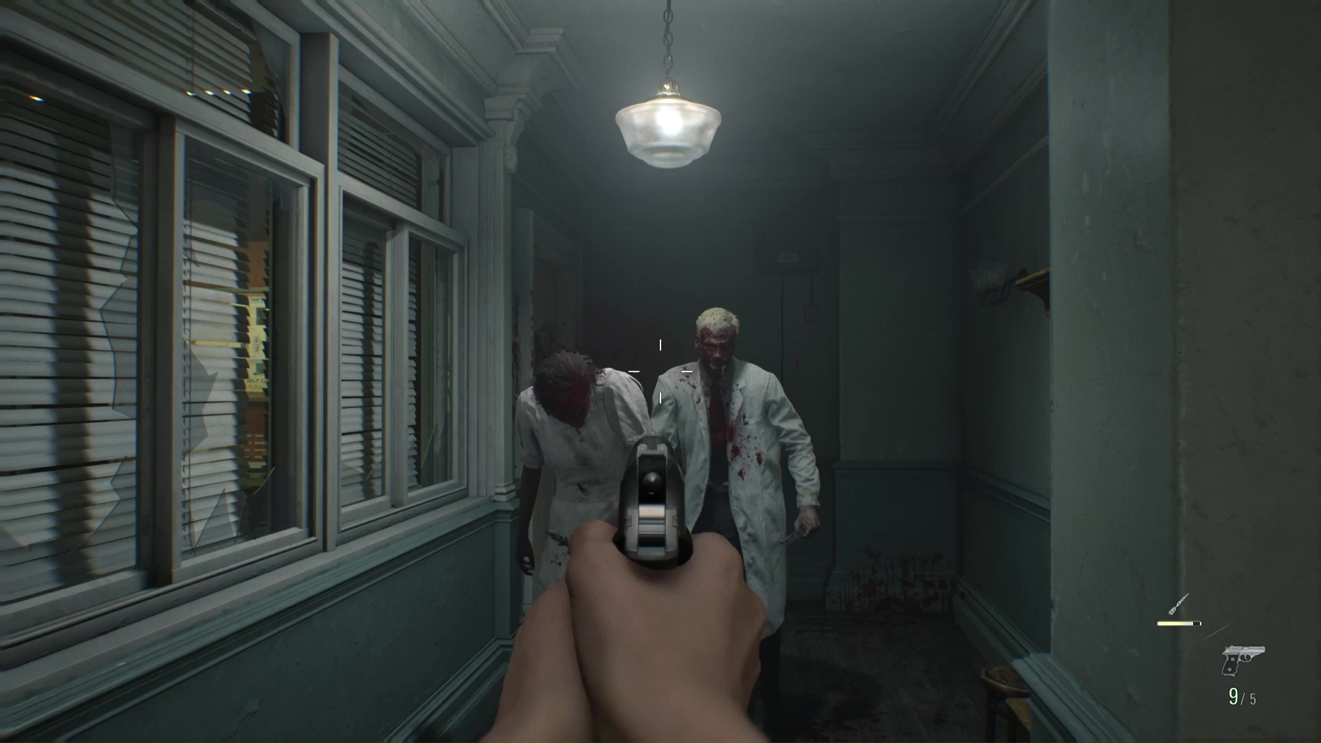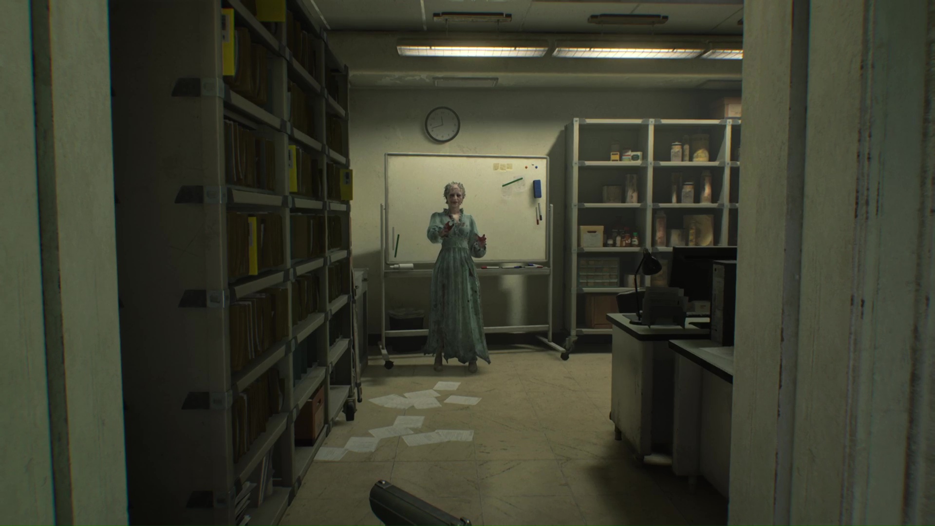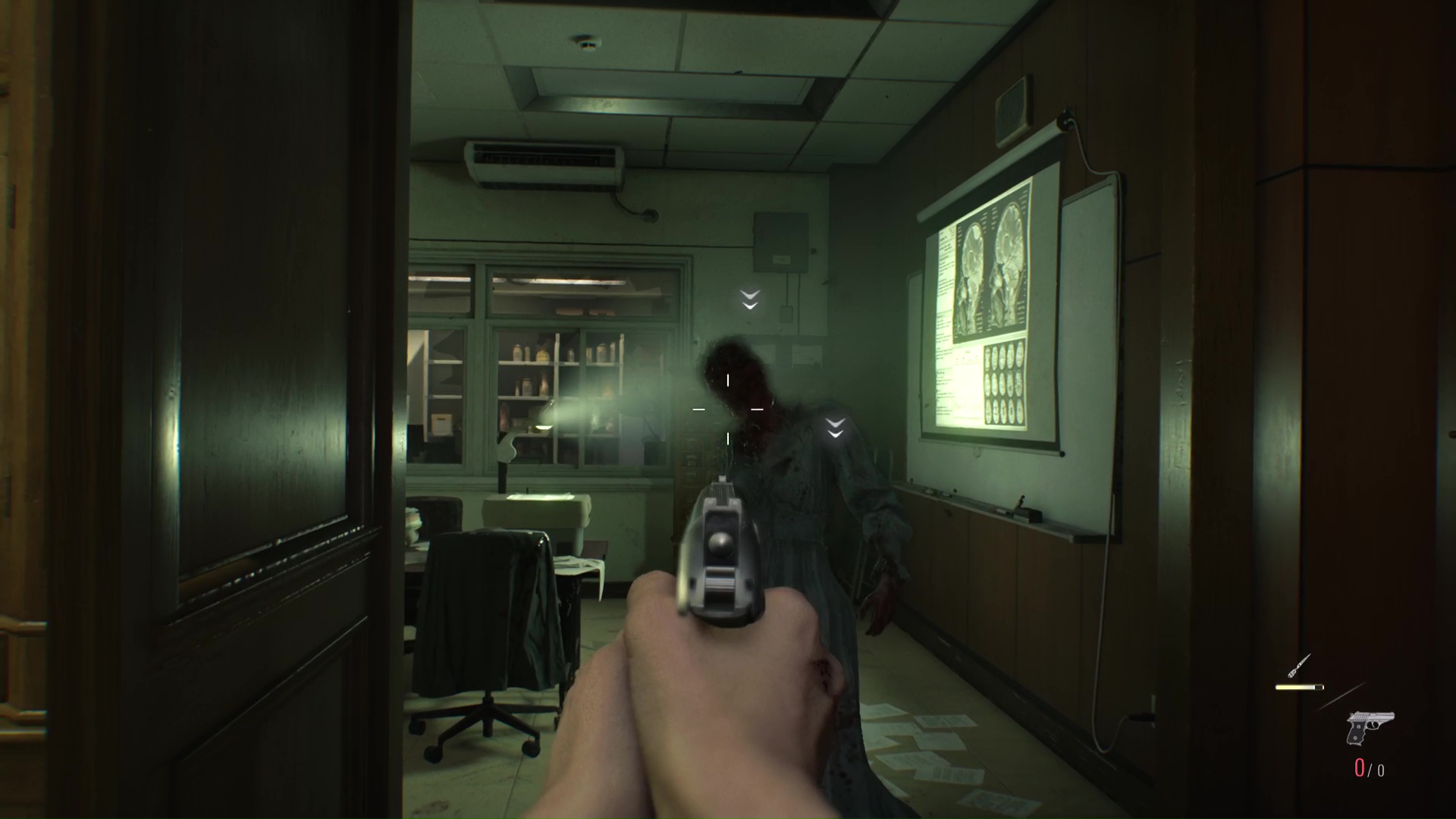 Il est possible que la zombie hurlante se soit retranchée dans le bureau au fond de la Salle de conférence. Si c’est le cas, vous aurez l’avantage du premier tir, mais dès l’assaut lancé, elle se dirigera vers vous.