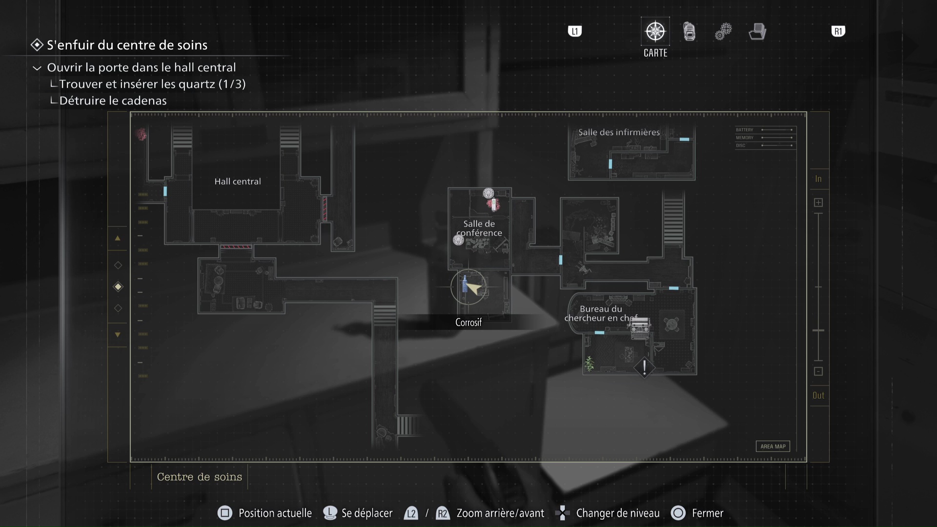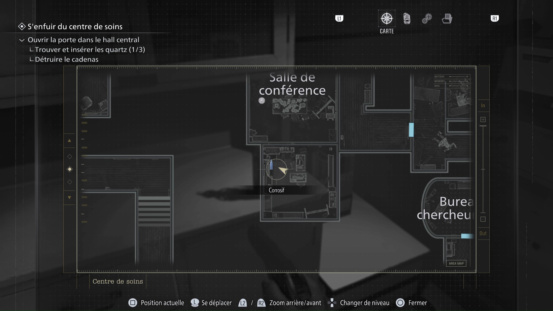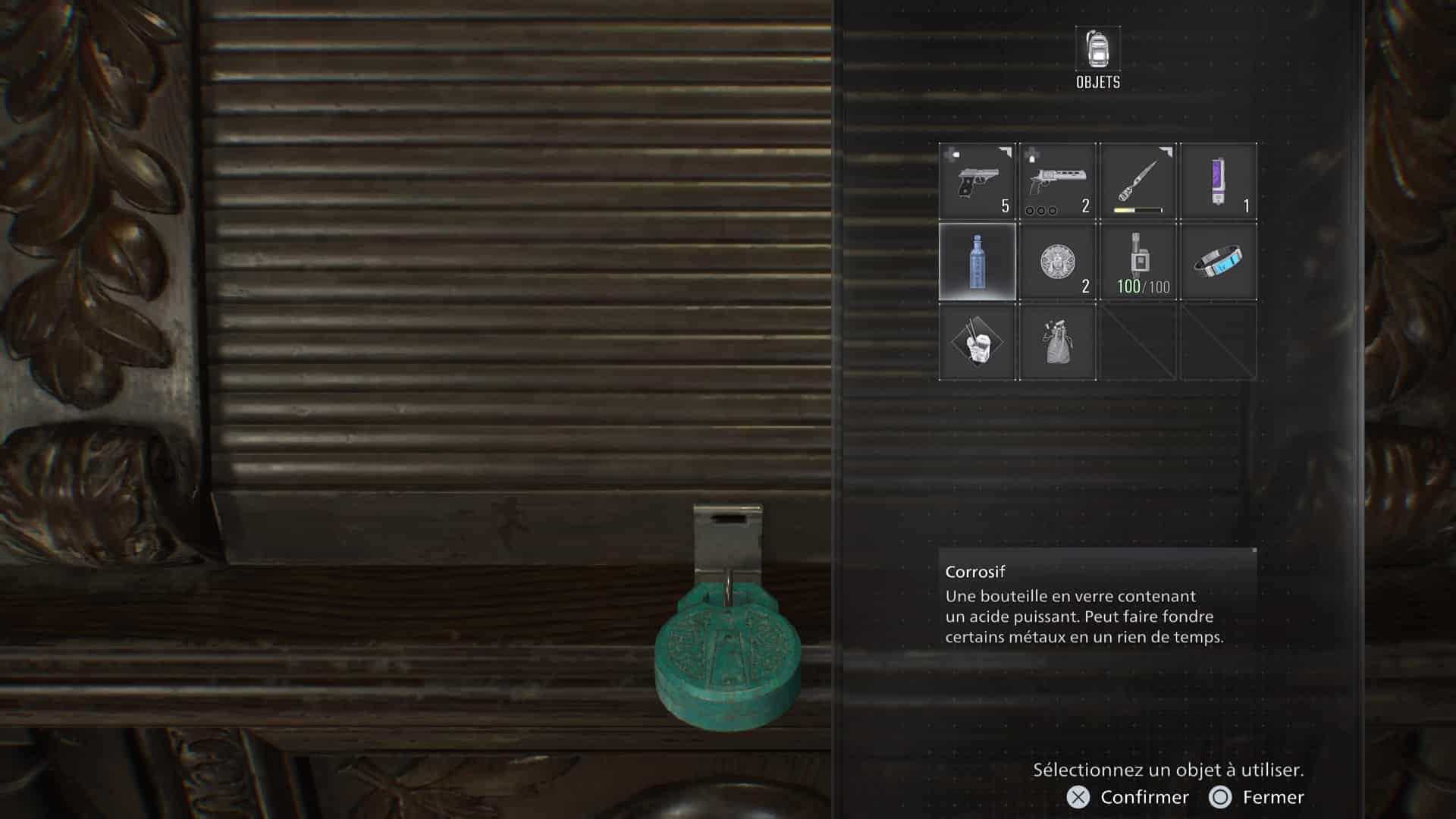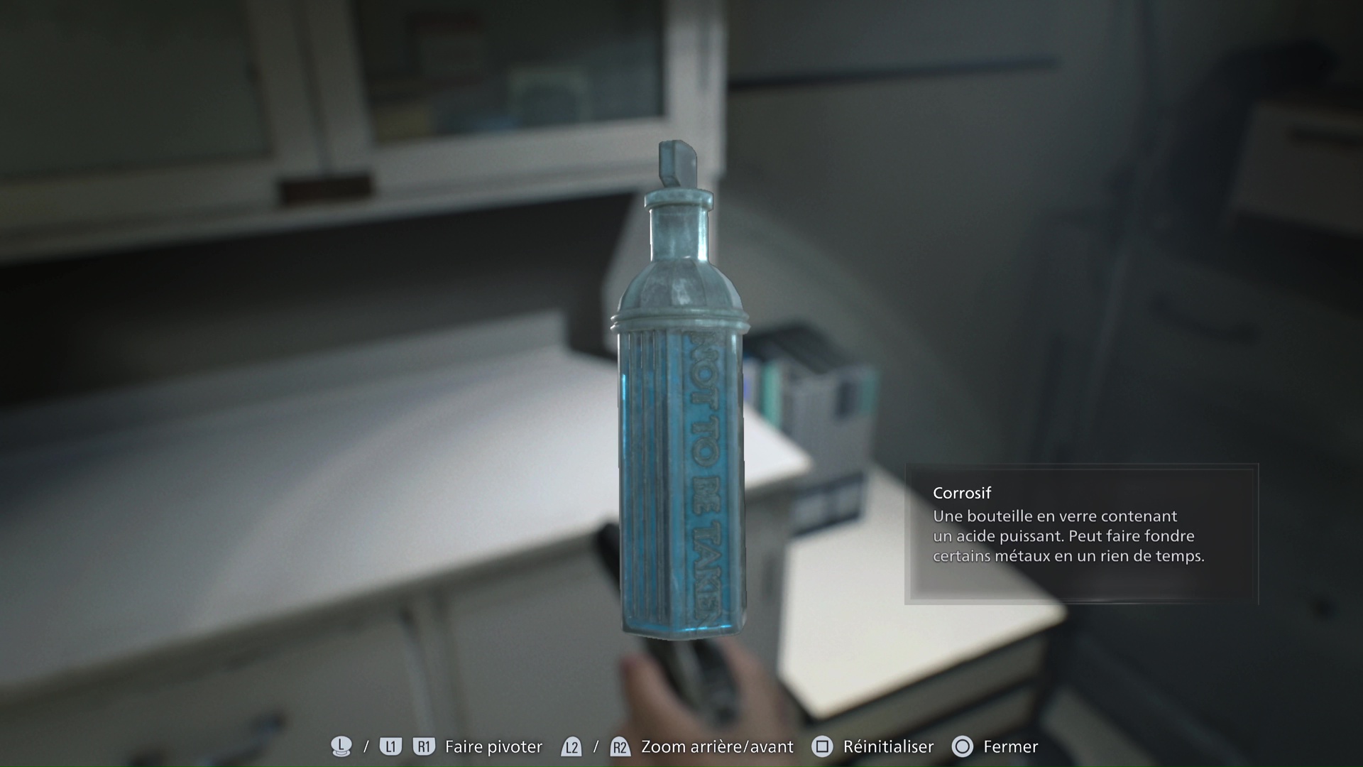Une fois le danger pleinement écarté, allez justement voir le bureau de la Salle de conférence pour trouver, sur une table, la bouteille de corrosif. Il est temps de revenir au meuble à combinaison.