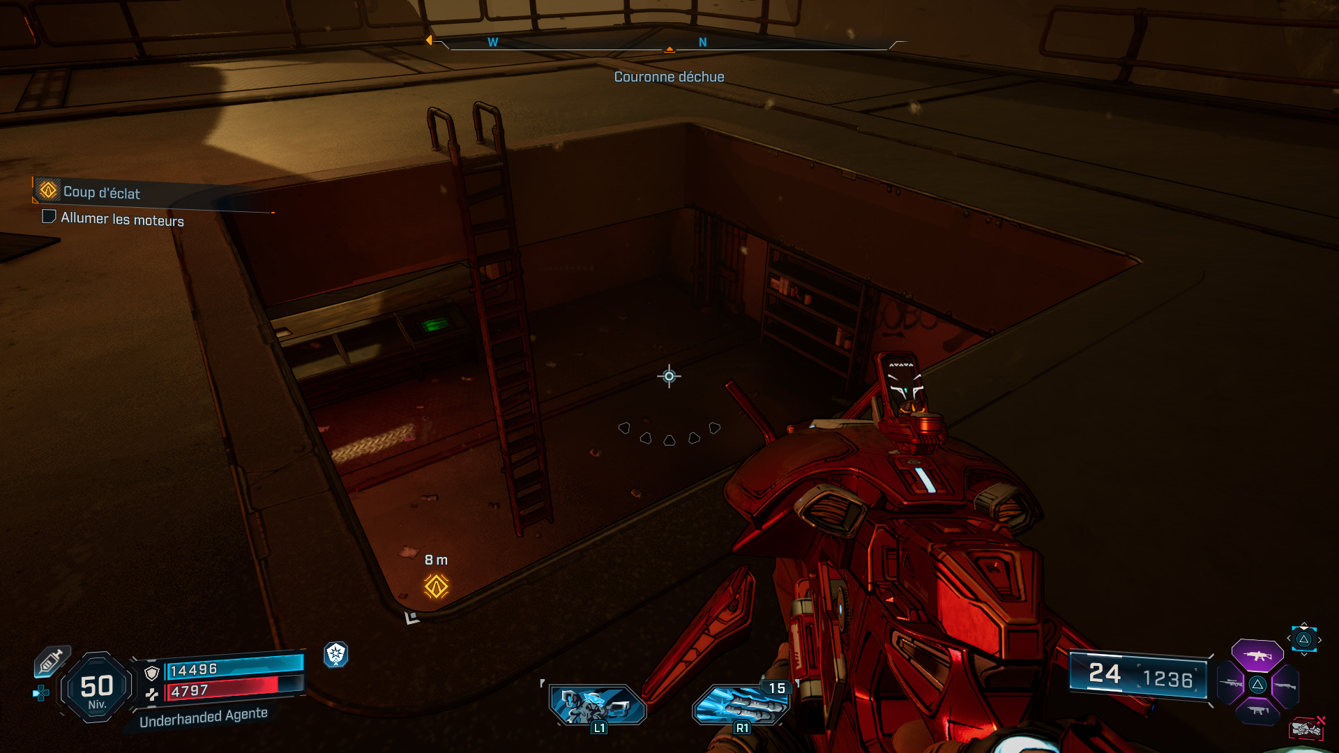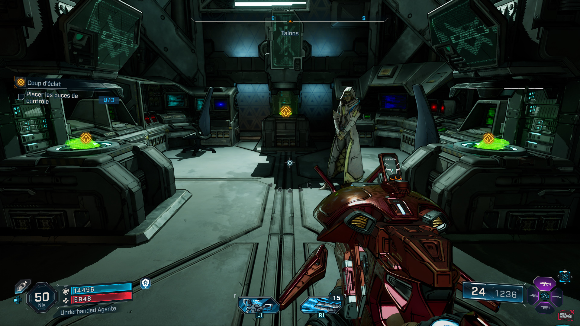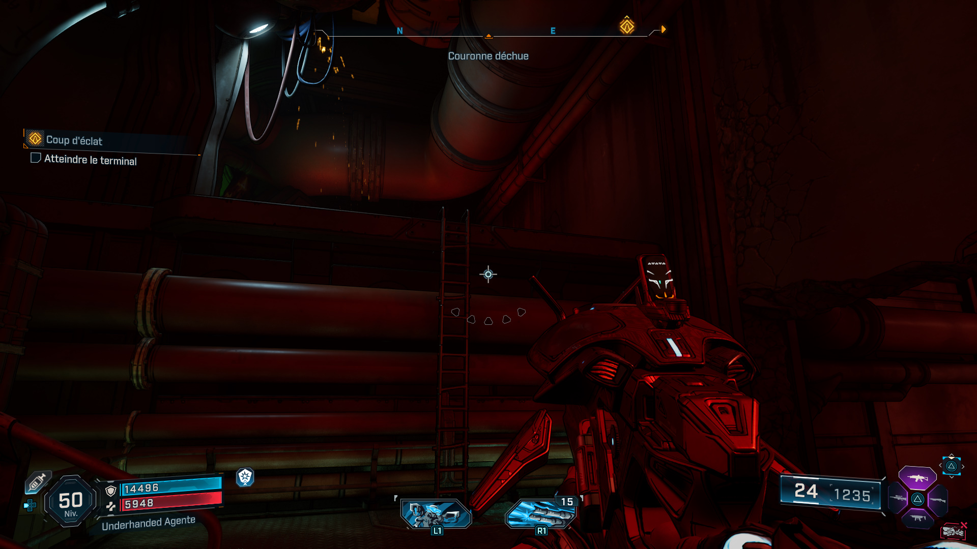 Une fois à l’intérieur, avancez dans le couloir et montez l’échelle un peu plus loin sur la droite, puis sautez pour vous accrocher à une première grille, puis sur une autre à droite, avant de remonter et de suivre le chemin menant au terminal. Ici, posez la puce de contrôle de Callis à l’endroit indiqué, piratez les commandes avec ECHO-4 et reprenez la puce.