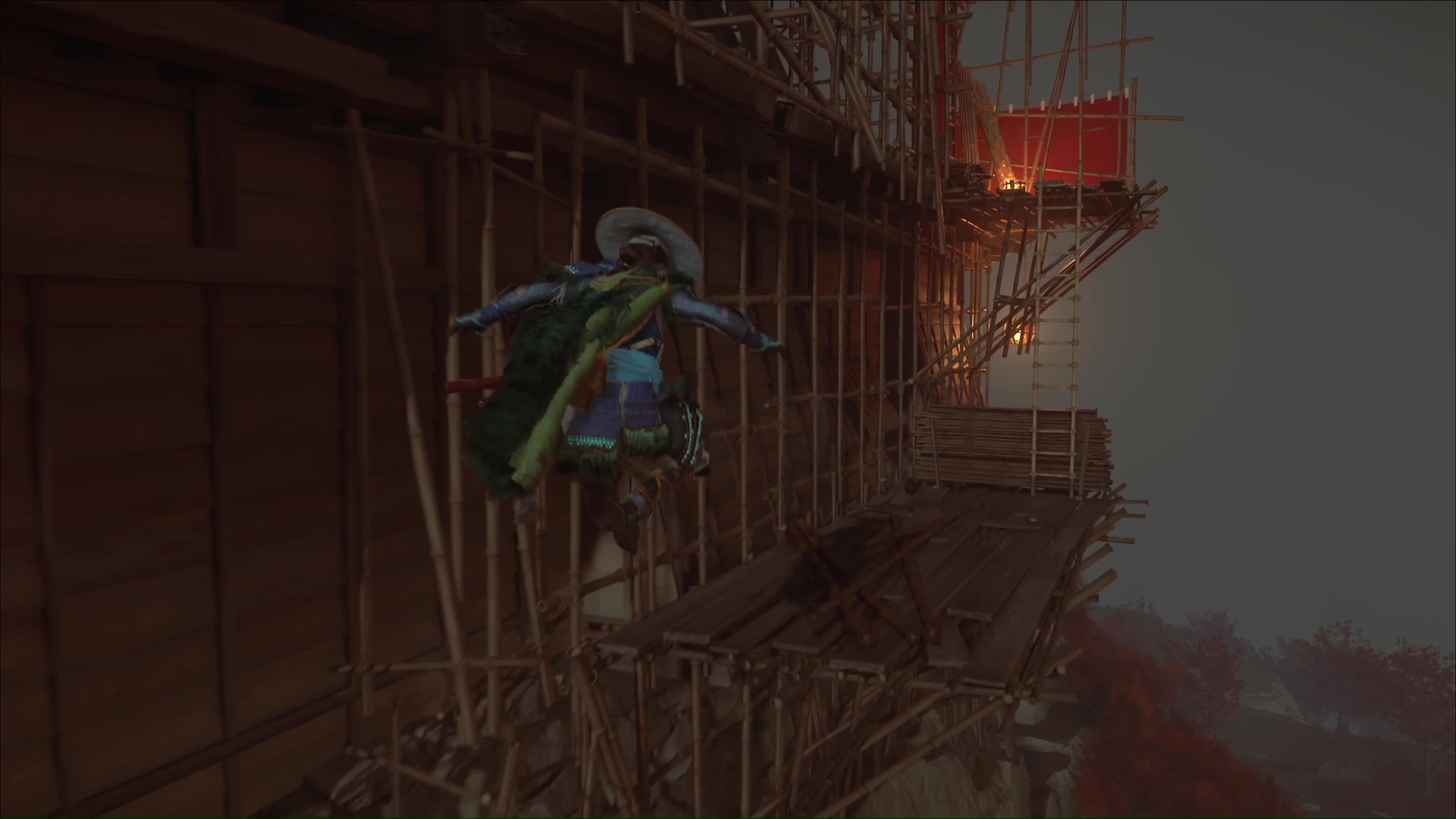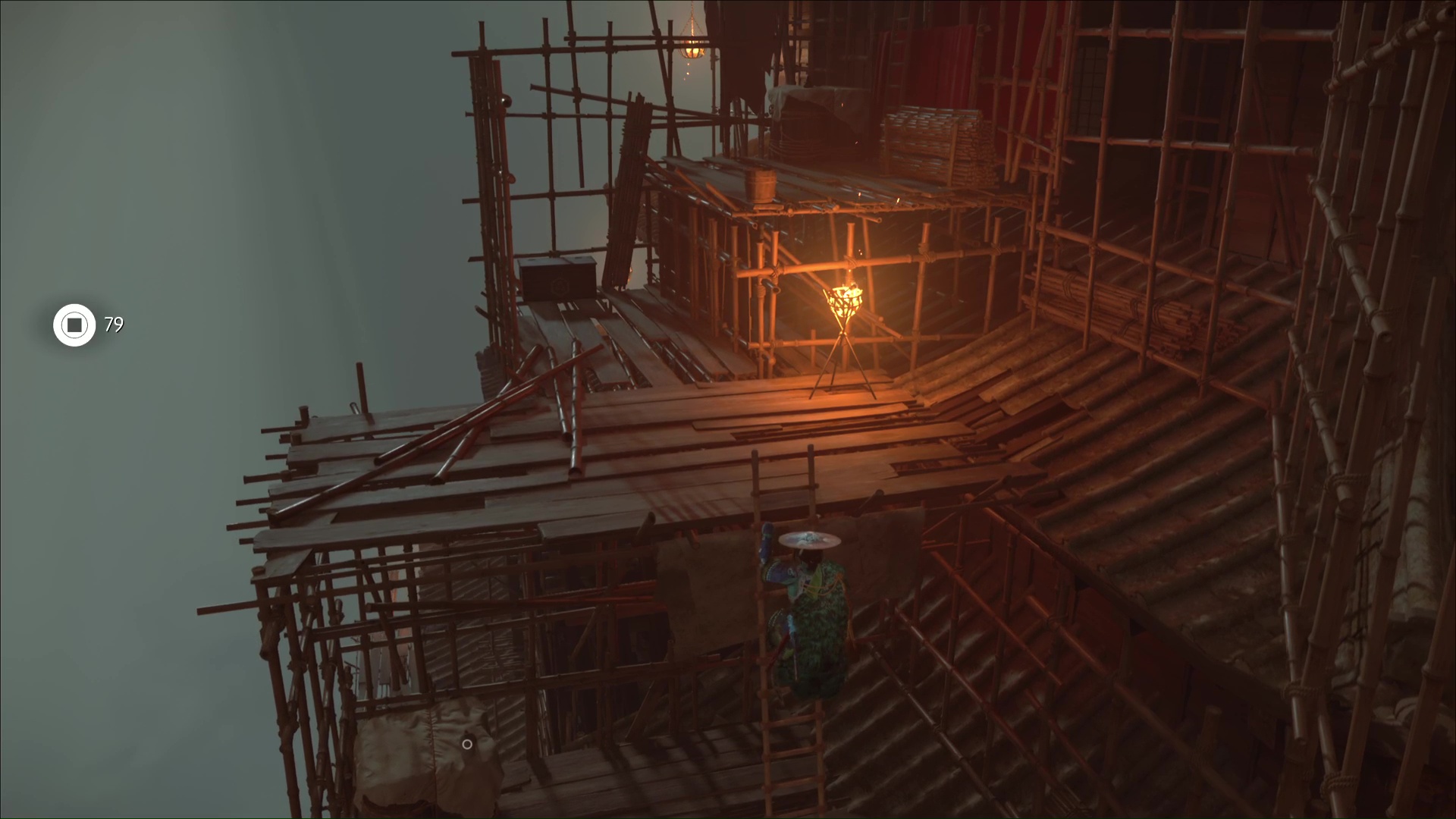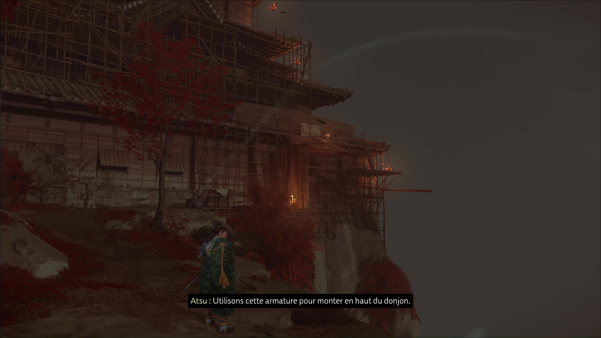 Admirez ensuite Jubei faire pareil et continuez votre escalade en montant de rocher en rocher puis en grimpant la paroi rocheuse au bout du chemin. Arrivé en haut, Atsu décide de poursuivre l’ascension via les échafaudages disposés tout autour du château.