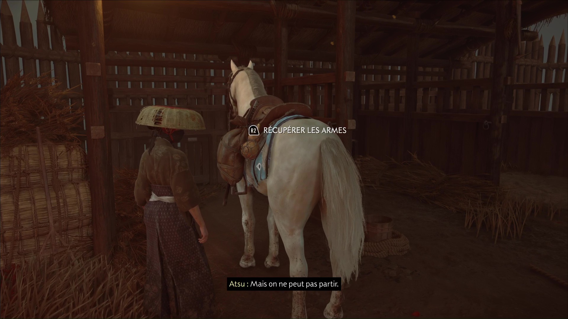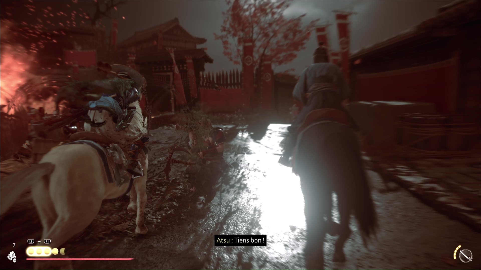 Atsu va alors mal se réceptionner et tituber quelques instants. Avancez et passez à travers l’ouverture devant vous. De l’autre côté, montez sur un cheval et apprêtez-vous à utiliser un nouveau mouvement.