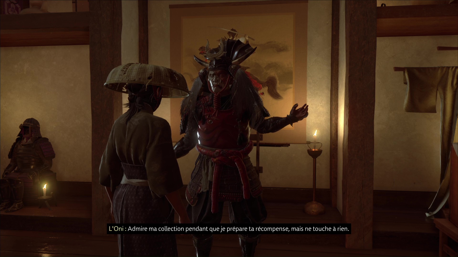 Juste après, vous débarquez dans la salle privée de l’Oni. Ce dernier vous invite d’ailleurs à observer sa collection. Vous pouvez en effet vous renseigner sur les différentes pièces, mais la plus importante est en fait ce saya posé sur un meuble, à droite.