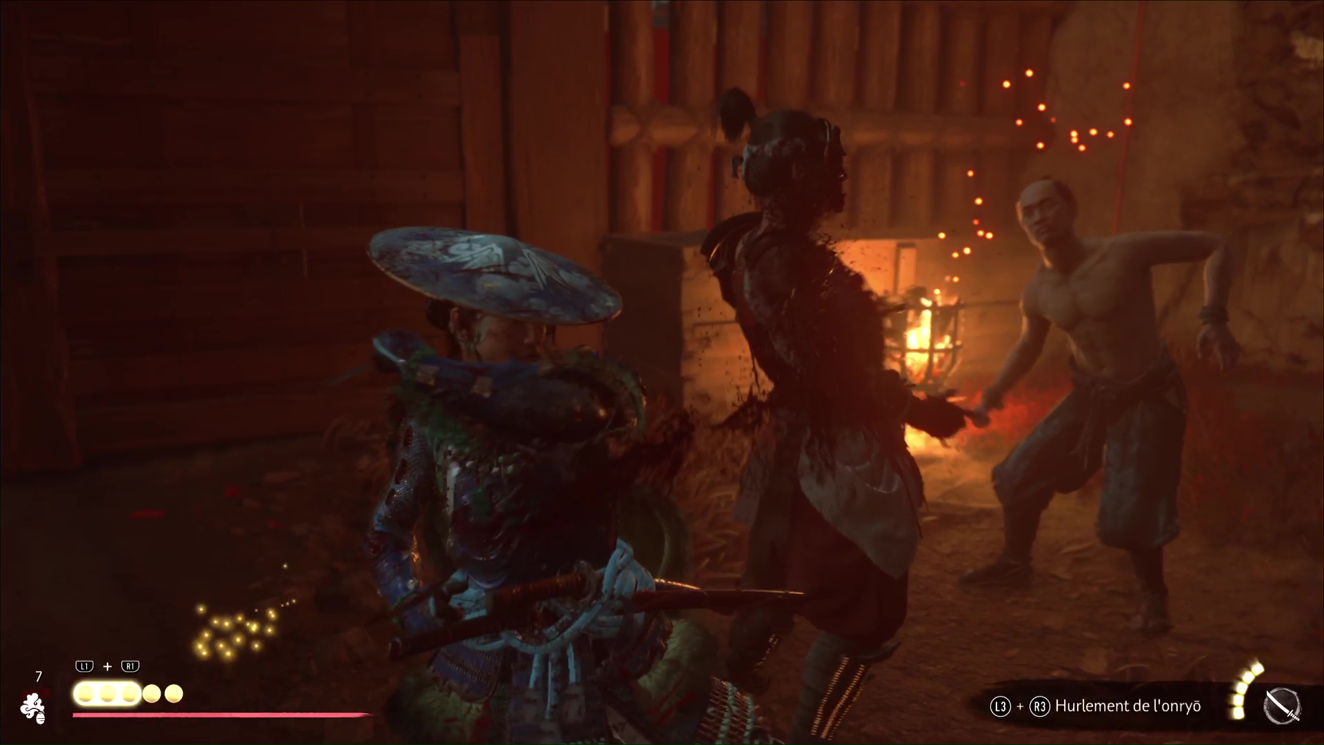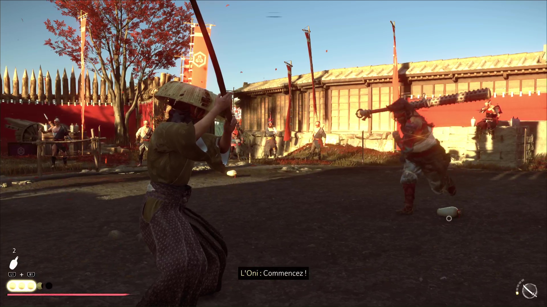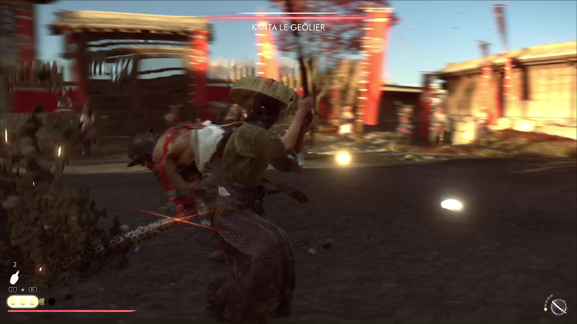 Vous pourrez d’ailleurs contrer un désarmement pour qu’il le lâche. Il poursuivra alors le combat à mains nues. N’oubliez pas non plus les jarres de saké vides à lancer sur votre ennemi pour le déséquilibrer brièvement.