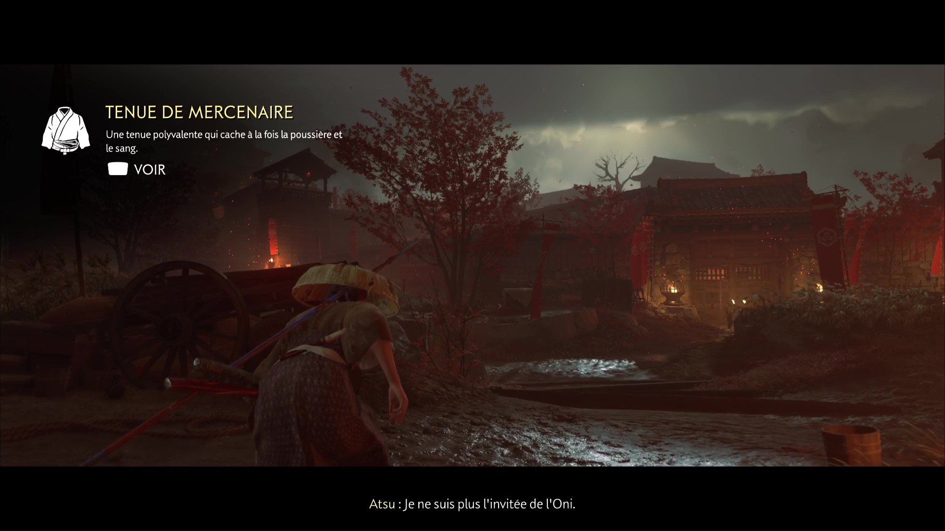 Vous débloquez alors officiellement la Tenue de mercenaire que vous portiez depuis le début de la quête, une tenue qui favorise l’utilisation du saké. Mais vous pouvez tout à fait remettre la tenue que vous préférez.