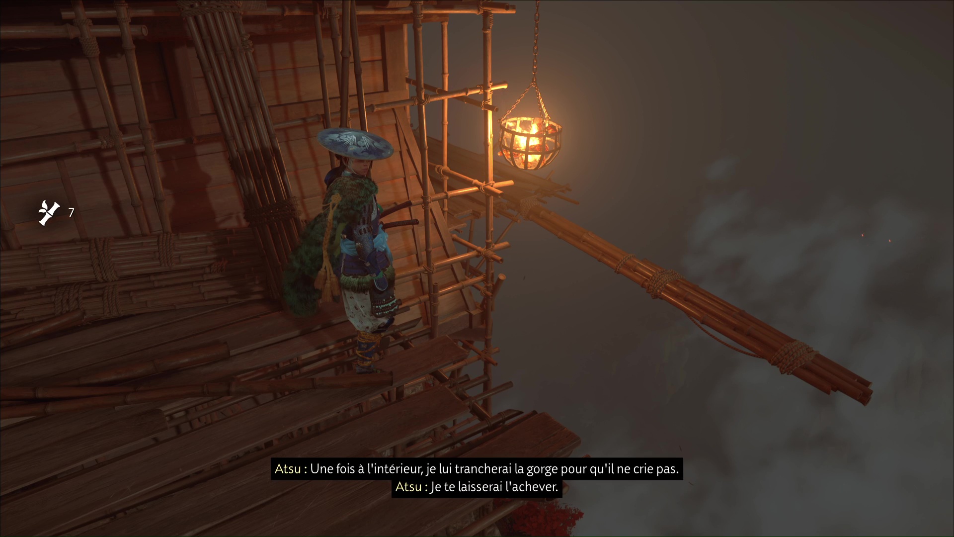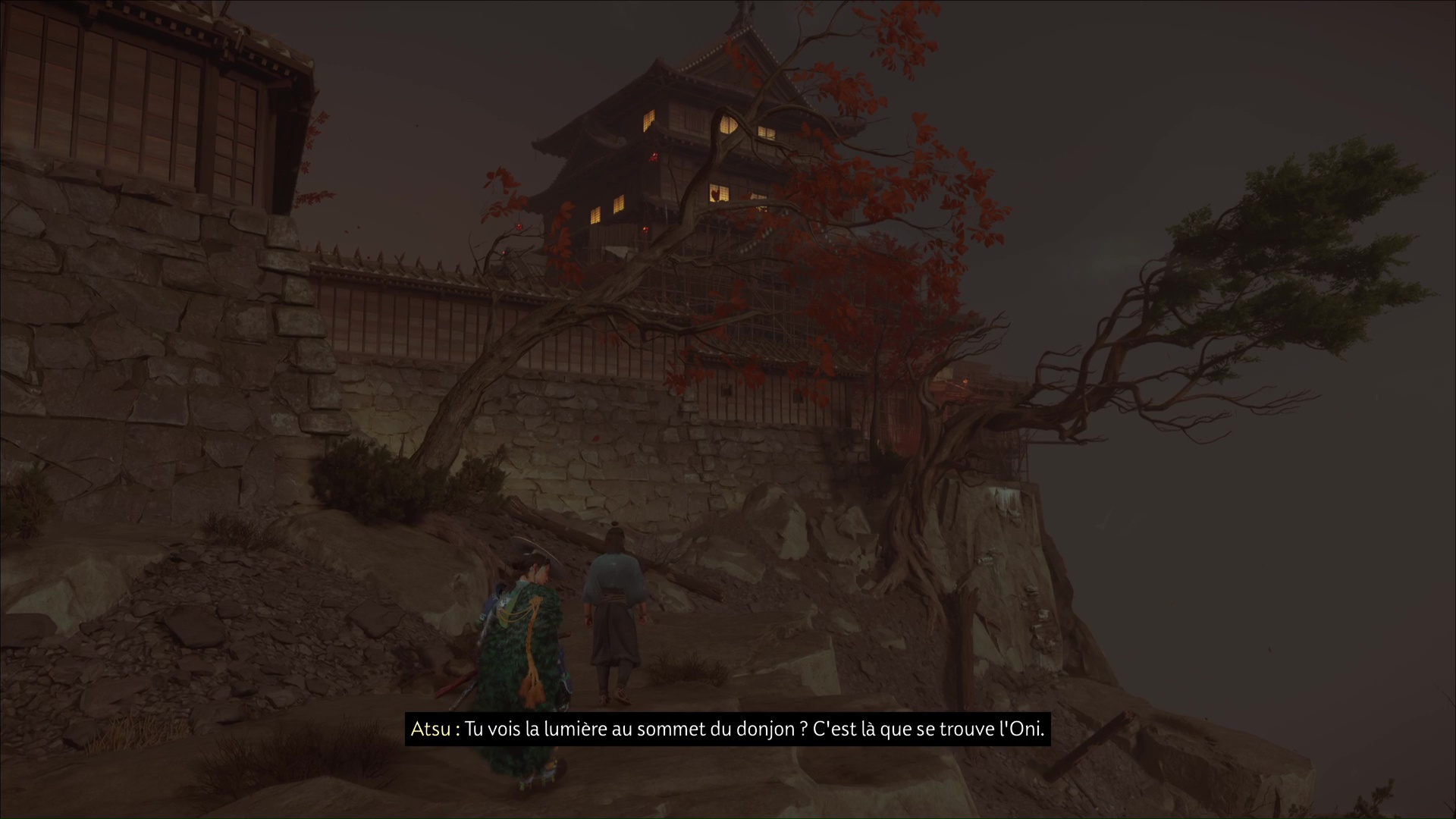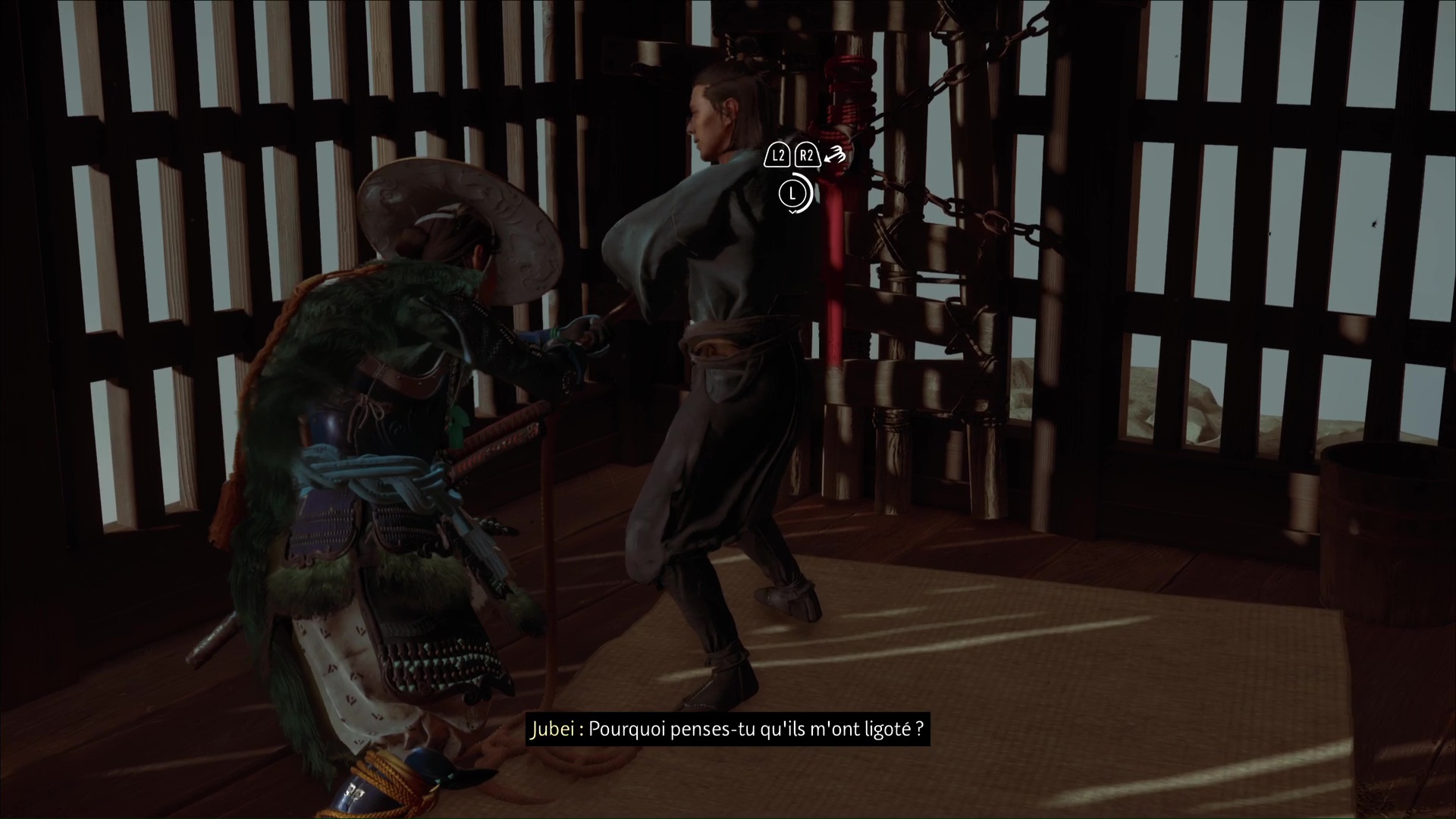 Et tandis qu’Atsu veut vite passer à la suite du plan, Jubei désire en profiter pour libérer les autres prisonniers. Notre héroïne accepte, mais dans un second temps. À présent, il est temps d’aller cueillir l’Oni. Grâce à Jubei, tirez au grappin sur la barrière fragile pour libérer un passage et ainsi sortir. Le plan est de rejoindre le château en passant par les falaises.