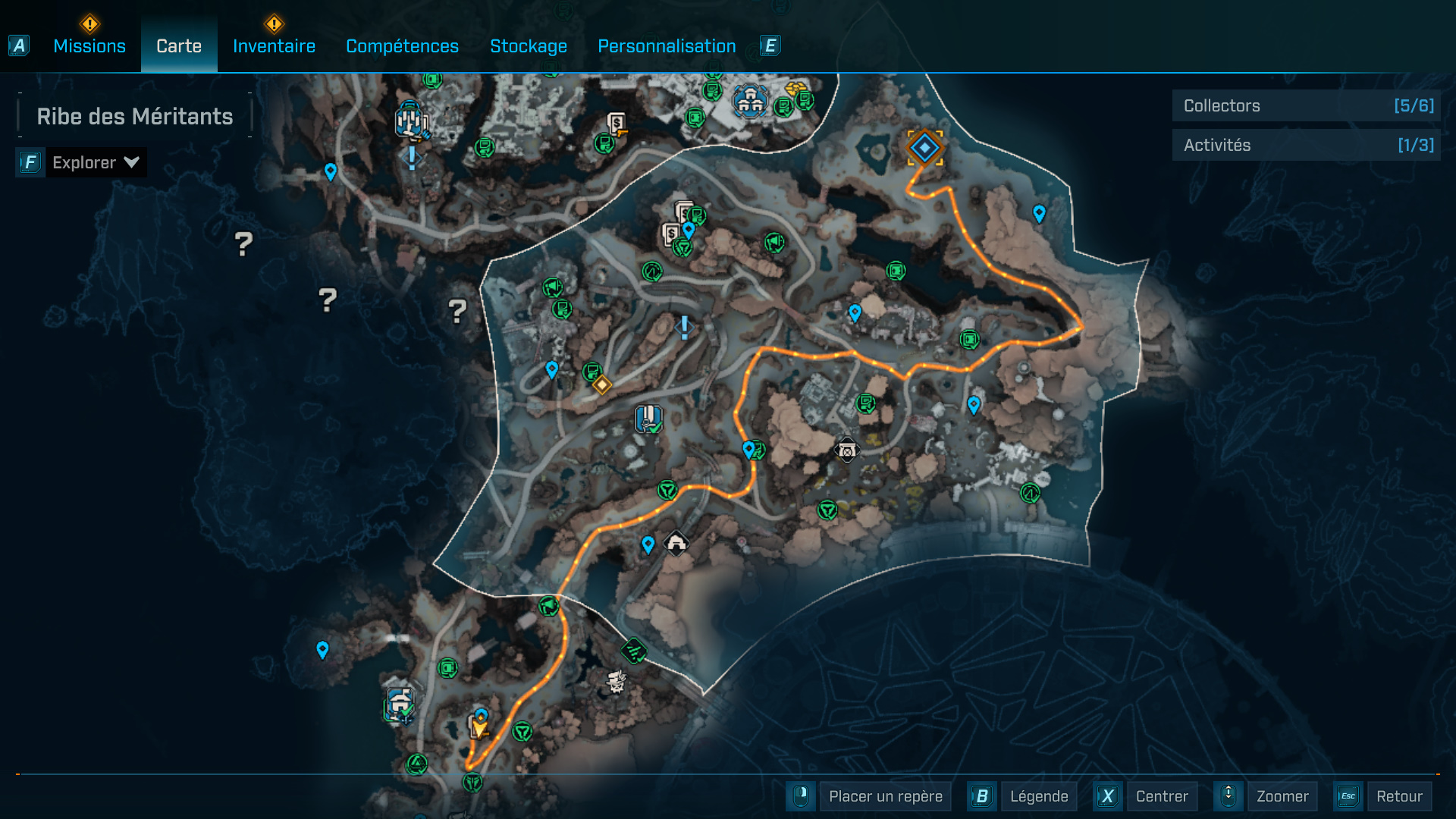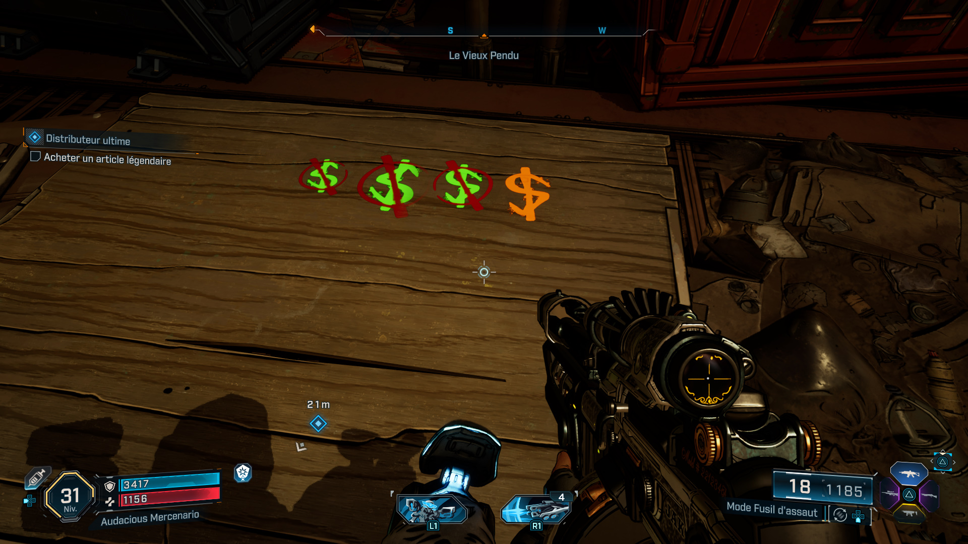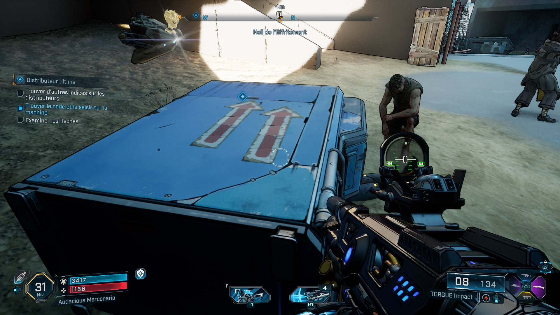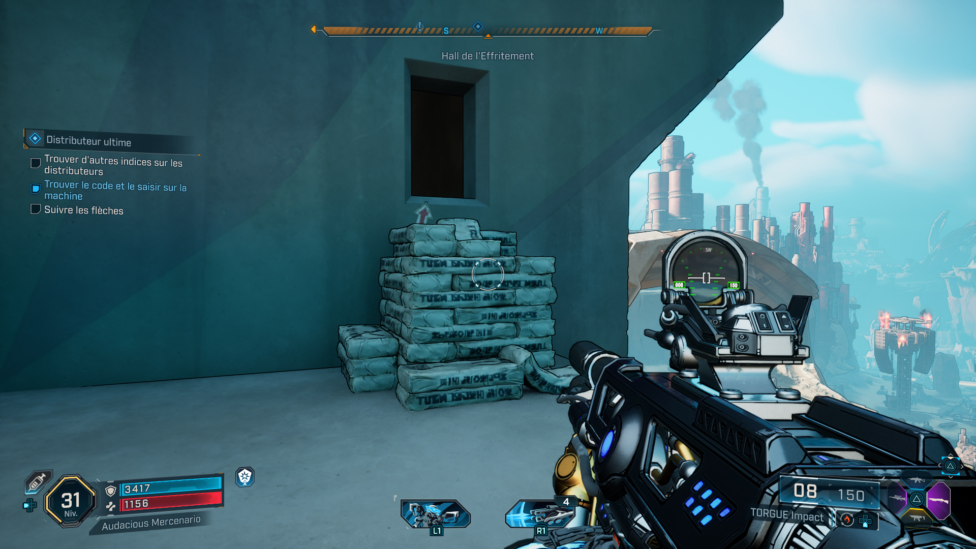 Ce qui vous donne les coordonnées suivantes : 33-1 96-8-W, votre carte indiquant alors le nord de la Ribe des Méritants, et qui n’est autre que votre prochaine destination. De là, enfourchez votre Digirunner et activez l’ECHO-localisation pour suivre le long trajet jusqu’au Vieux Pendu, où vous attendent quelques ennemis… ainsi qu’un autre distributeur. Regardez derrière la machine pour découvrir un énième code (vert / bleu / violet / orange) à valider en vendant vos objets dans le bon ordre.
