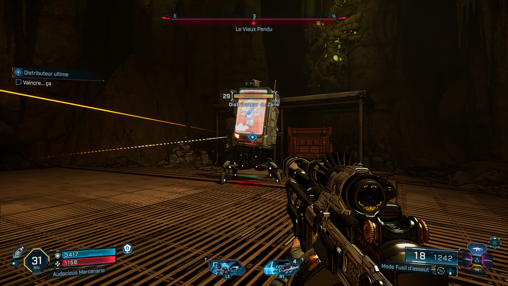Ceci étant fait, suivez la ligne électrique juste derrière le distributeur jusqu’à l’entrée du repaire un peu plus loin en contrebas. Pénétrez à l’intérieur et avancez pour y trouver le distributeur légendaire, tandis qu’il se transforme finalement en « Distributeur de Zane » pour devenir hostile envers vous.