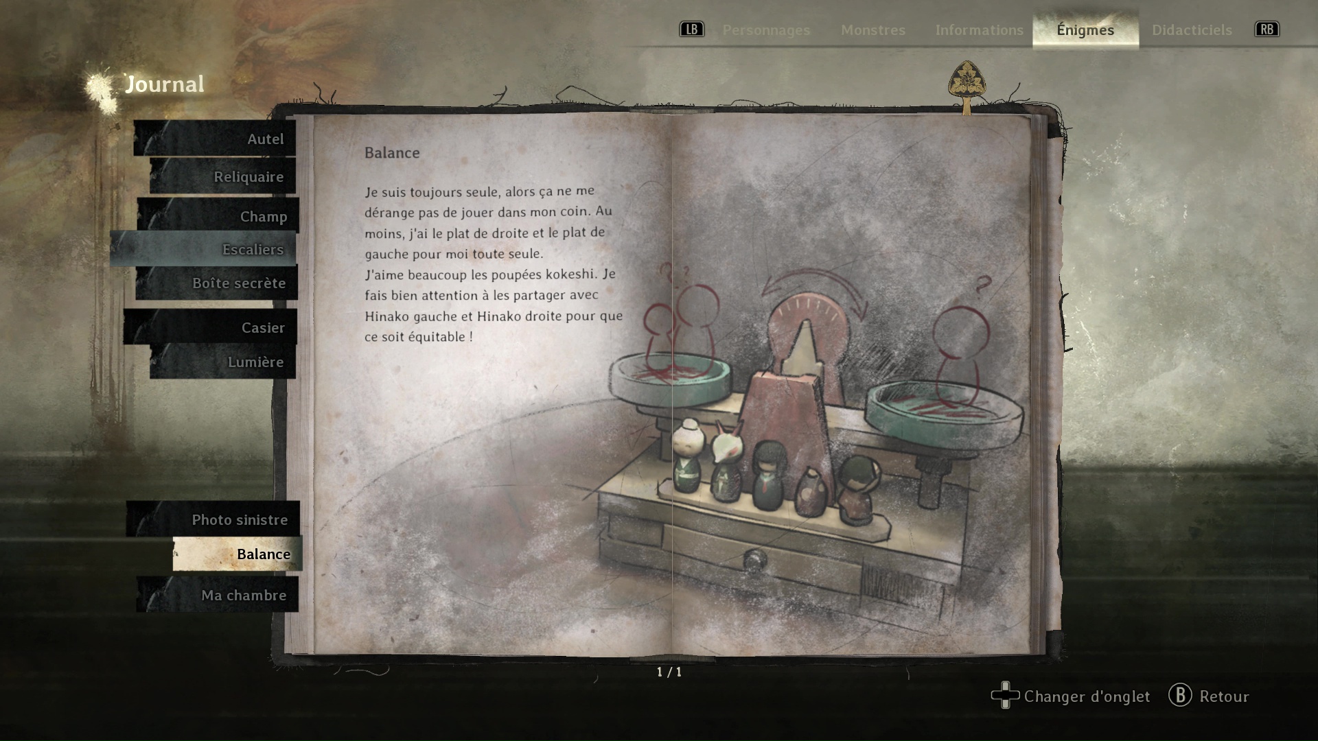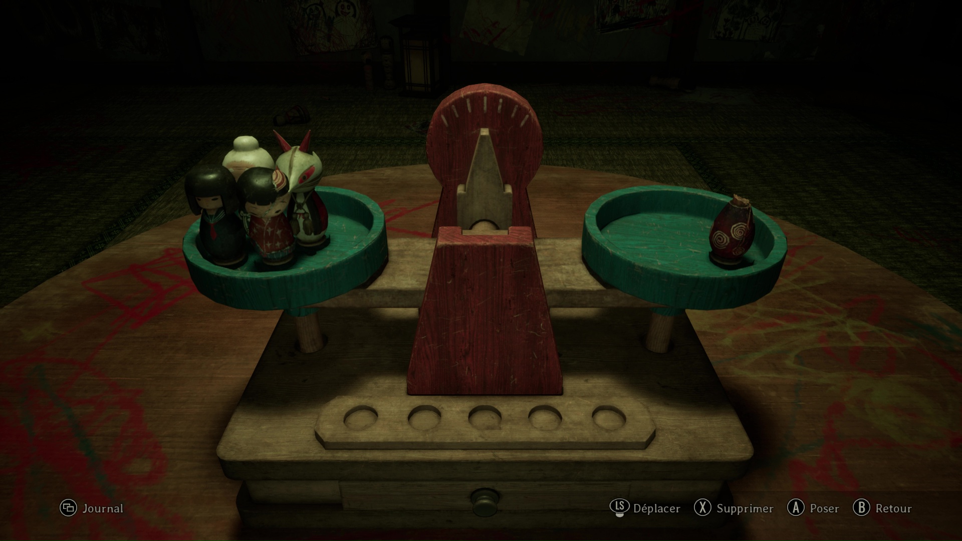 Sortez de la pièce pour rejoindre la chambre située à l’opposé, au coin nord-ouest de la Résidence, pour trouver une énigme avec une balance. Une note sur le mur vous aidera à résoudre l’énigme Balance, qui diffèrera en fonction du nombre de parties jouées et de la fin voulue.
