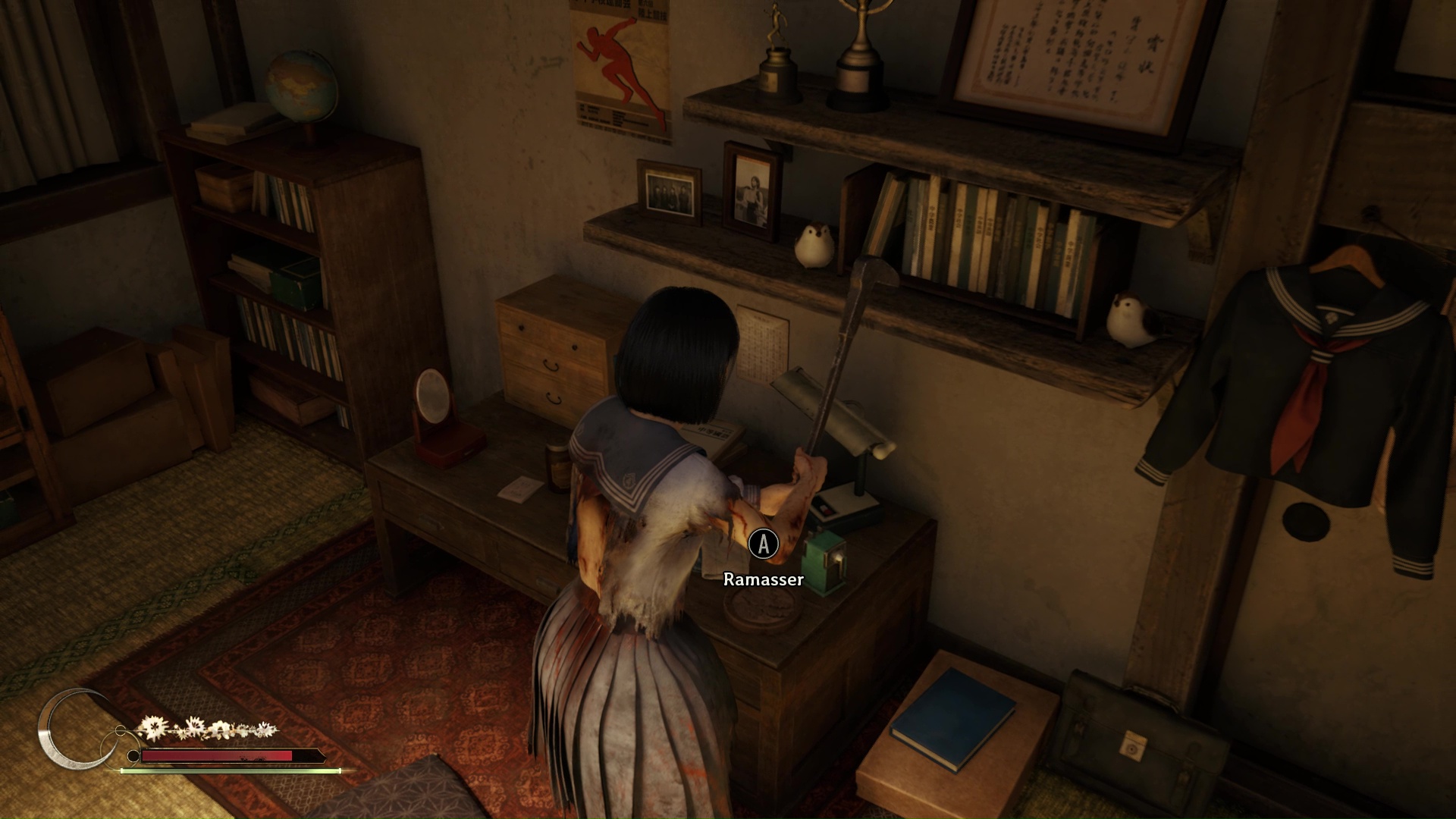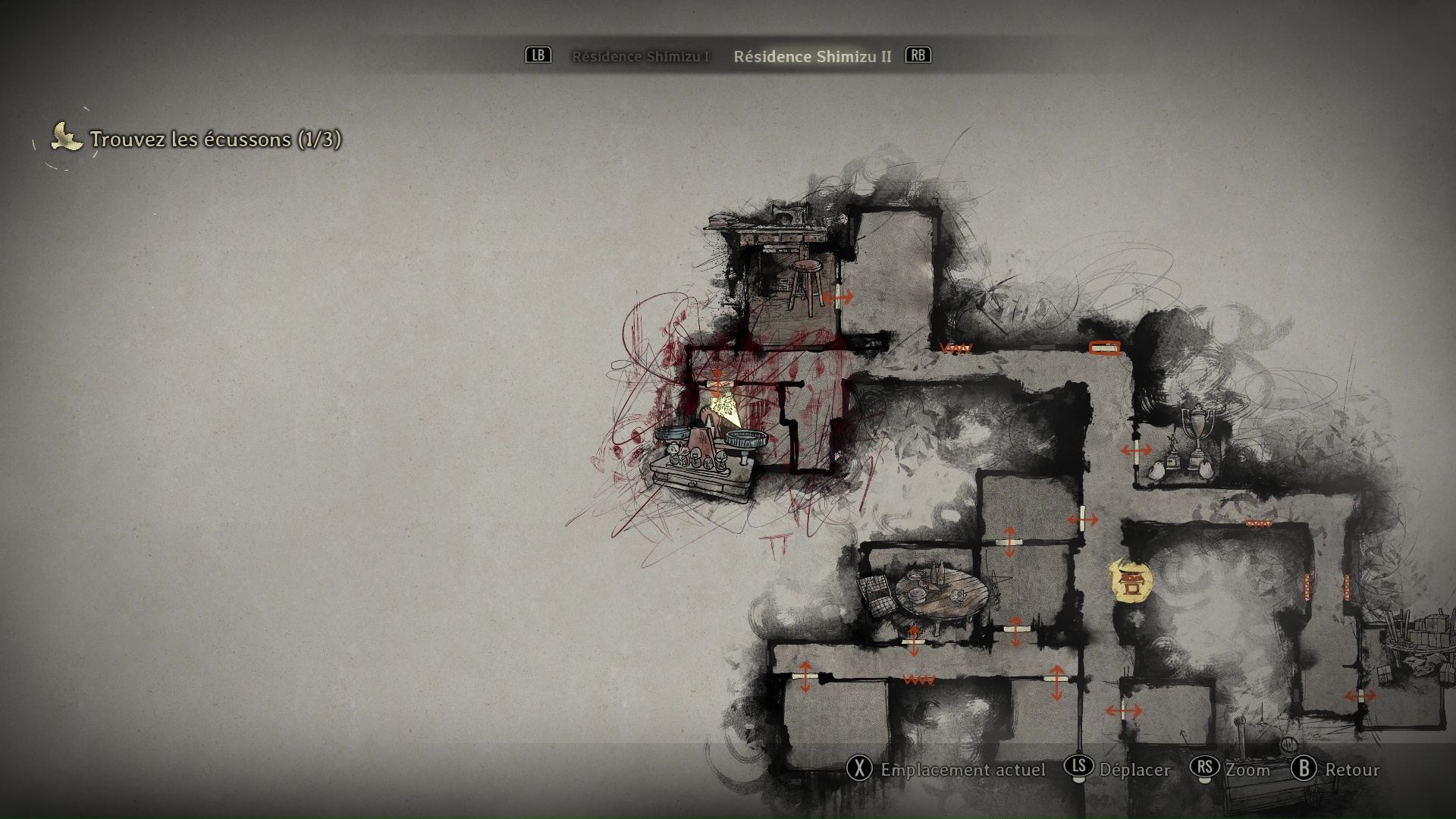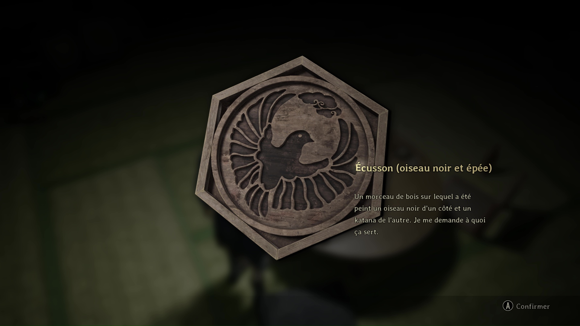 Retournez près de la porte à l’emblème d’oiseau pour utiliser votre Clé à plume obtenue précédemment et assister à l’intérieur à un nouveau flashback. Enfin, ramassez sur la table le dernier écusson (Oiseau noir et épée). Vous pouvez retourner dans la Résidence Shimizu I.