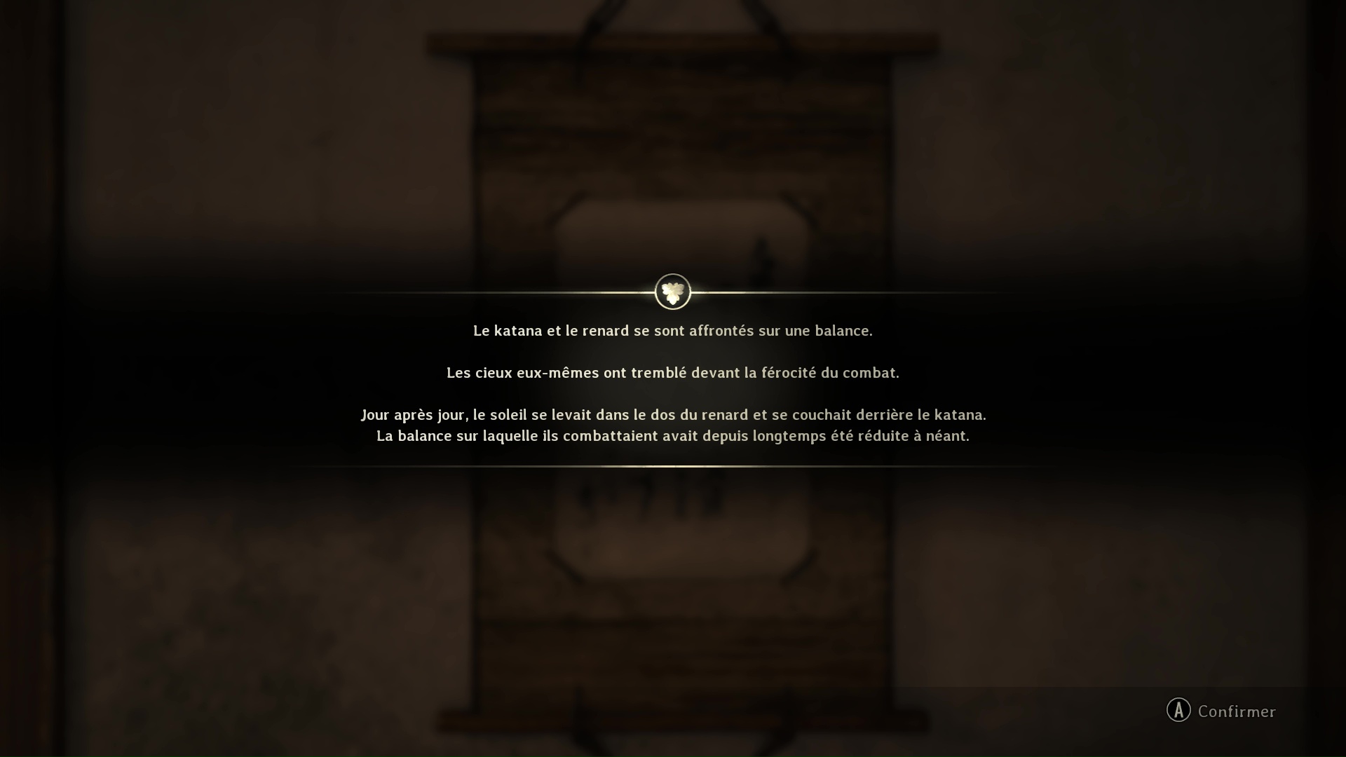 Jour après jour, le soleil se levait dans le dos du renard et se couchait derrière le katana dans une lutte éternelle.