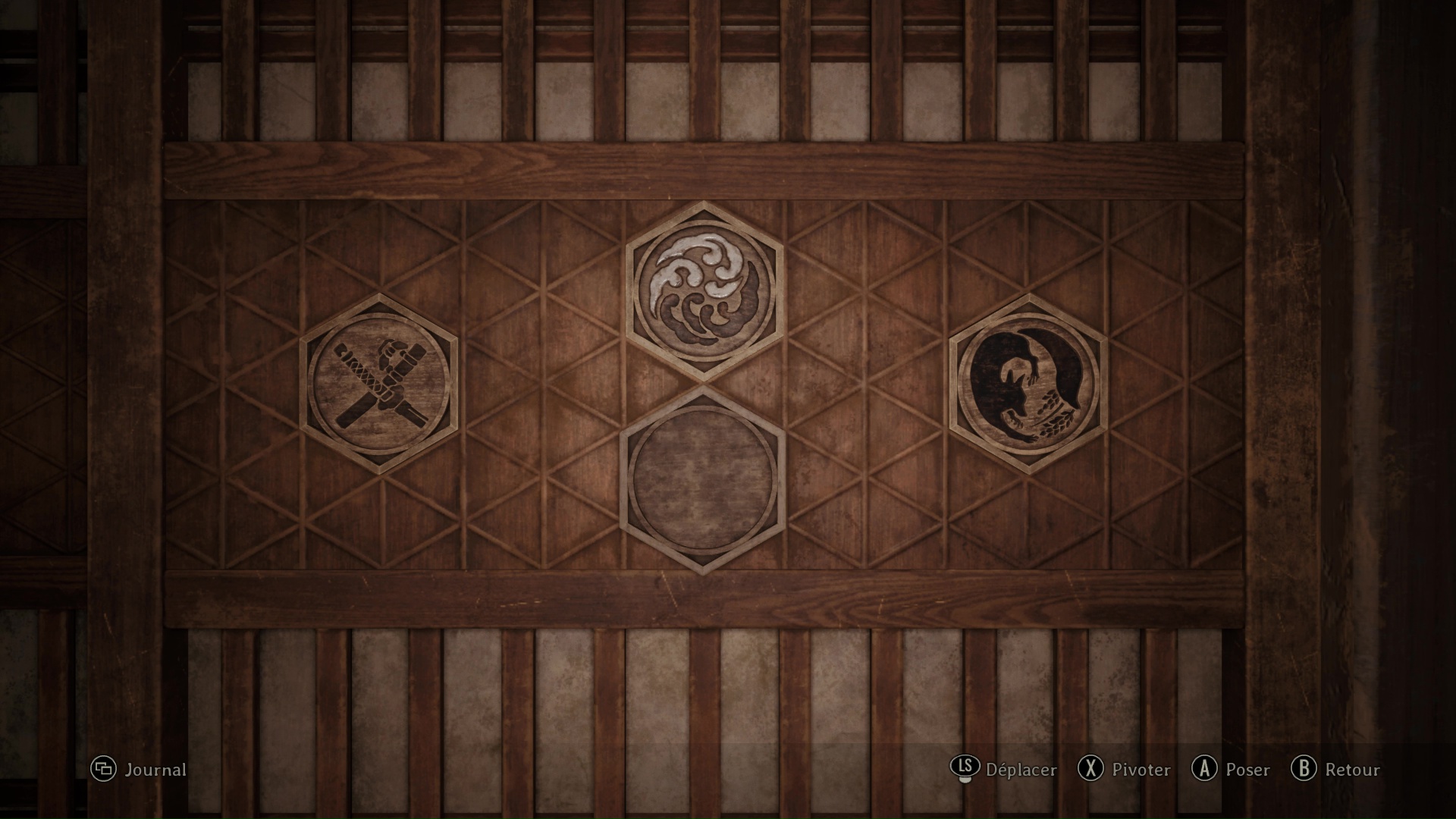 Une fois de retour dans la Résidence Shimizu I pour la troisième fois, placez les trois écussons sur le mur de la Chambre d’Hinako, en respectant ce qui est décrit sur le mur d’à côté, différent en fonction de la fin choisie. Encore une fois, pour une première partie, vous n’aurez pas le choix et devrez utiliser la solution de la première fin unique.
