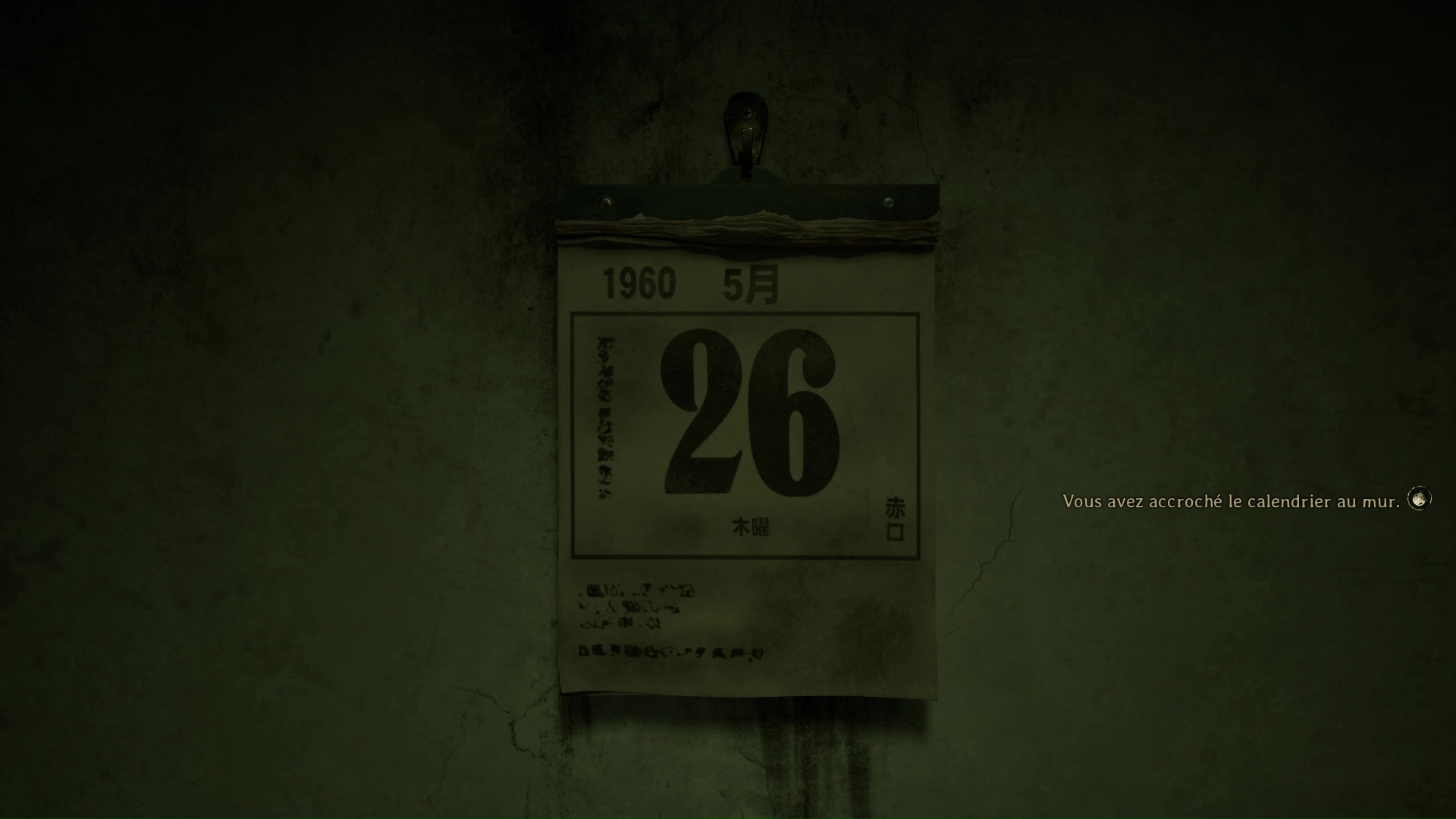 Prenez le couloir de droite pour trouver une porte ornée d’une lueur rouge. Ce sera le point final de cette quête, mais pour l’heure, vous trouverez devant elle un Calendrier à la date du 6 Octobre 1962. Venez le placer sur le mur près de la porte de la chambre d’Hinako. Cela vous permettra d’accéder à la Résidence Shimizu II, dont la porte est désormais éclairée juste à côté.