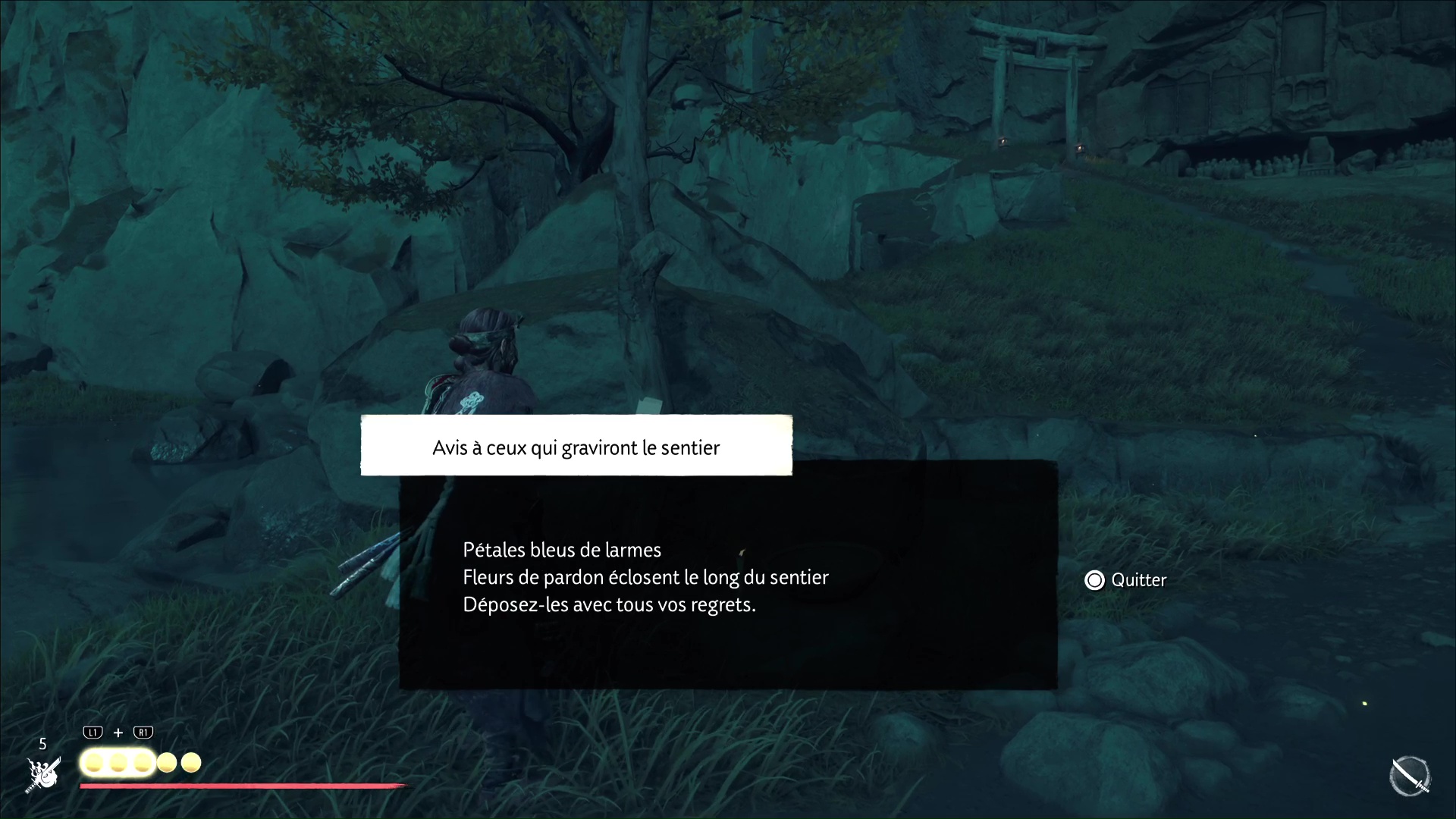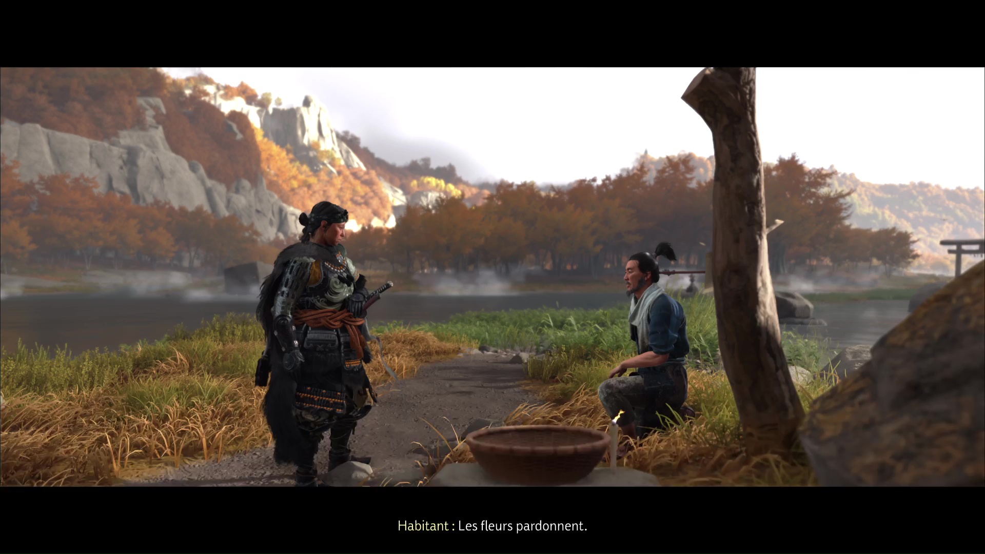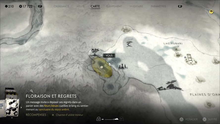 Dans Ghost of Yōtei, on ramasse très régulièrement des fleurs de toute sorte, surtout pour permettre à Atsu de disposer de nouveaux éléments cosmétiques. Mais les fleurs peuvent renfermer moult significations et symboles, à l’instar des fleurs bleues du Sanctuaire du repos ambré. Une note présente à son entrée suggère d’en récupérer quelques-unes, puis de les déposer dans le panier à côté. Un nouveau récit se lance.